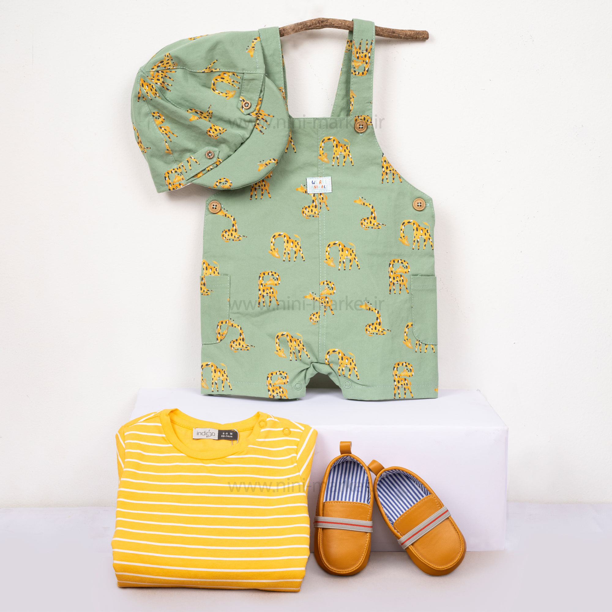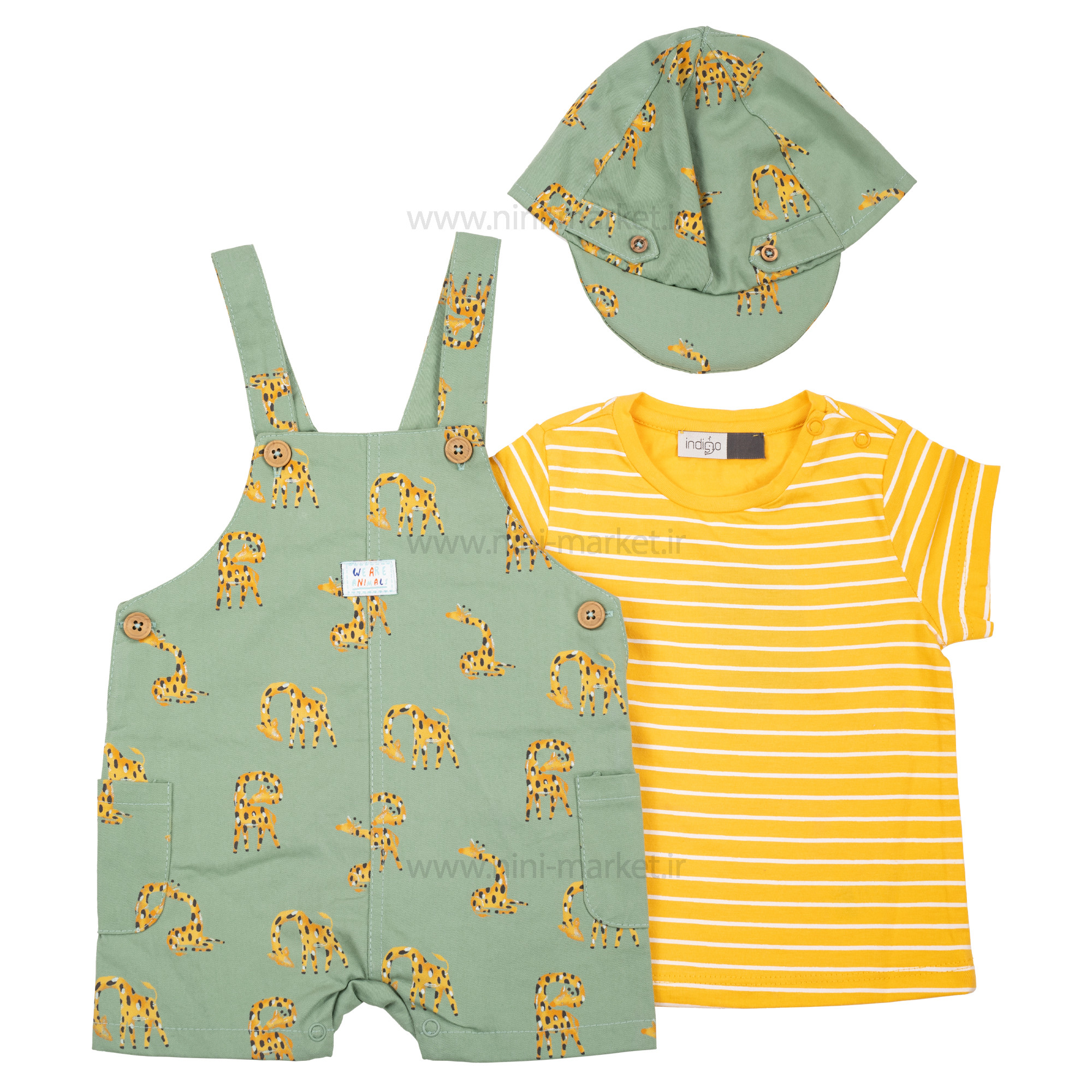 پیشبندی شورتی طرح زرافه رنگ سبز ایندیگو Indigo محصول کشور ایران ، پیشرو در تولید البسه ضد حساسیت می باشد که محصولات این برند بسیار با کیفیت و مرغوبی را به بازار عرضه می کند .جنس این ست از الیاف لطیف و نرم بوده و نوزاد با پوشیدن آن حس خوبی دارد و در آن احساس راحتی میکند. و مادران با خیال راحت میتوانند این ست را برای فرزند خود تهیه کنند. ست سه تکه پیشبندی شورتی و بلوز آستین کوتاه که یک ست بسیار زیبا و جذاب مناسب بهار تابستون می باشد. بلوز آستین کوتاه به رنگ زمینه زرد با راه راه های سفید است . دو عدد دکمه روی سرشانه بلوز این ست تعبیه شده که علاوه بر زیبایی یقه آن ، هنگام تعویض لباس بچه فشاری به سر او نمی آید. جنس پیشبندی رابو نخ پنبه که رنگ آن سبز که طرح زرافه به صورت پترن درآمده و هم چنین برای راحتی مادران در قسمت سرشانه شورت پیشبندی دکمه تعبیه شده است که در هنگام تعویض لباس کودک دلبند شما اذیت نمی شود. یک کلاه تابستانی نیز در این محصول ایندیگو نیز وجود دارد که در می توان آن در در تابستان بر سر کودک خود قرار دهید تا صورت کودک با نور خورشید اذیت نشود .