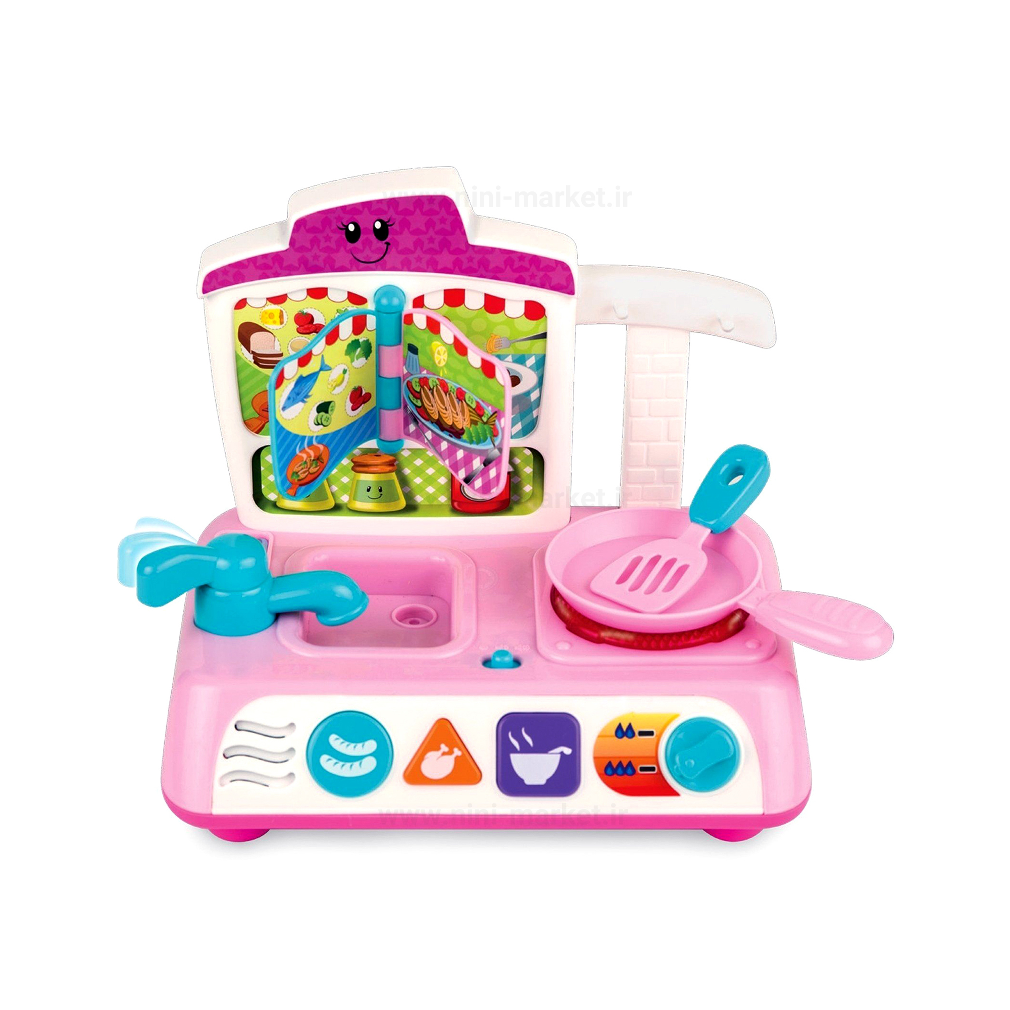 اسباب بازی آشپزخانه صورتی وین فان دارای امکانات مختلف است این اسباب بازی دارای دکمه های رنگی بسیار زیبا و جالب است که با فشردن آن نام غذاهایی که روی آن ها قرار دارد را به انگلیسی بیان می کند ور آموزش زبان به فرزند شما بسیار موثر است و در حین حال نام شکل هندسی آن را به انگلیسی به کودک دلبندتان آموزش میدهد... این آشپزخانه موزیکال فوق العاده زیبا با رنگ بندی بسیار شاد و کودکانه برای کودکان بسیار جذاب هست.همچنین این آشپزخانه موزیکال دارای یه کتاب آشپزی بسیار زیبا میباشد روی دیوار آشپرخانه نصب شده و به مانند یک کتاب قابلیت ورق زدن دارد. علاوه بر این شیری که در بسته بندی این اسباب بازی زیبا مشاهده میکنید موزیکال است و قابلیت پخش صدای آب واقعی را دارد این آشپزخانه موزیکال با داشتن رنگ های شاد و زیبا ، چراغ چشمک زن روی اجاق گاز، ابزار آشپزی و دیگر امکانات بی نظیرش یک اسباب بازی مناسب آموزشی برای کودکان به شمار می آید که باعث می شود کودک از بازی کردن با آن خسته نشود. این آشپزخانه موزیکال زیبا دارای دکمه ی تظیم ولوم صدای موزیک هم است.