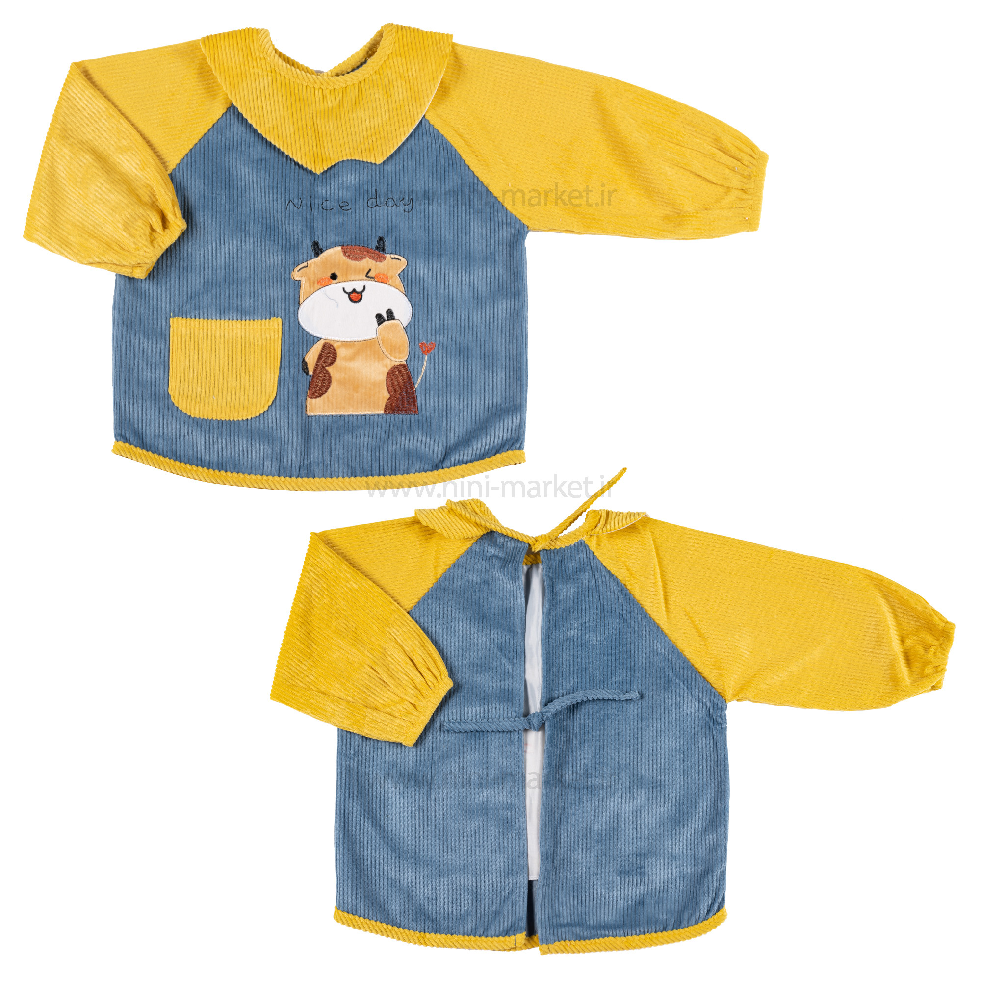 پیشبند آستین دار مخمل طرح گاو با طراحی عروسکی و جذابی که دارد یک انتخاب ایده آل و بروز برای کوچولوی شماست.شستشو مداوم لباس کودک ممکن است به لباس های کوچولویتان آسیب های زیادی برساند.کودکان با توجه به توانایی اندک خود در هنگام صرف غذا، موجب کثیفی لباس خود خواهند شد. همچنین با وجود دغدغه بزرگ تعویض لباس در کودکان، این موضوع مشکلی بزرگ برای والدین و کودک است. استفاده از پیشبند برای کودک در زمان صرف غذا می تواند از کثیف شدن ناگهانی لباس های او جلوگیری کند. پیشبند فوق به واسطه آستین ها و ابعاد بسیار خوبی که دارد تمام لباس کودکتان را در بر گرفته و از کثیف شدن آن جلوگیری می کند. جنس پیشبند آسترین دار طرح گاو مخمل کبریتی بوده و دارای لایه آستری ضد آب است که اجازه نفوذ نم و رطوبت را نمی دهد. پیشبند طرح گاو به صورت تکه دوزی و گلدوزی درآمده که با پوست کودکان مهربان بوده و ضد حساسیت و آلرژی می باشد پس با خیالی راحت می توانید از این پیشبند استفاده کنید. یقه پیشبند مدل یقه ملوانی می باشد که پشت یقه به وسیله دو بند باز و بسته می شود, داشتن بند نیز کمک می کند پیشبند در پشت گردن کودک فیکس شود و بند را هر جایی که موجب اذیت کودک نمی شود ببندید همچنین در پایین پیشبند 1 عدد جیب کارشده که میتوان داخل آن دستمال غذاخوری یا لوازم شخصی کودک را جای داد . این پیشبند بسیار سبک هست و می توانید آن را داخل ساک یا کیف به راحتی حمل کنید و همچنین در زمان کثیف شدن، آن را با دست یا در ماشین لباسشویی با دمای 30 درجه سانتی گراد بشویید.