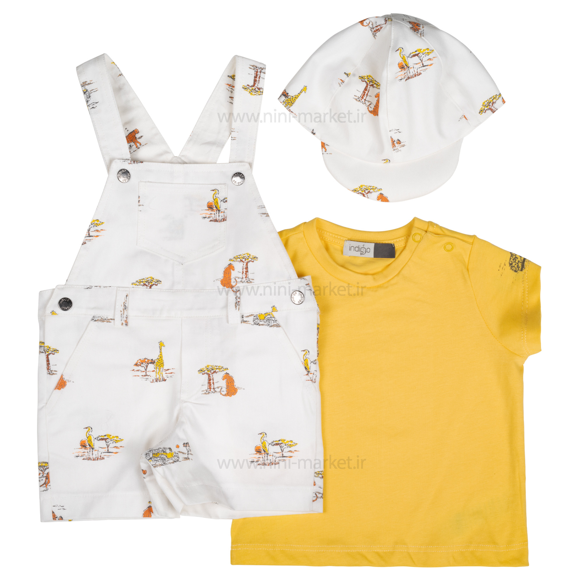 پیشبندی شورتی طرح حیوانات رنگ سفید-زرد ایندیگو Indigo محصول کشور ایران ، پیشرو در تولید البسه ضد حساسیت می باشد که محصولات این برند بسیار با کیفیت و مرغوبی را به بازار عرضه می کند .جنس این ست از الیاف لطیف و نرم بوده و نوزاد با پوشیدن آن حس خوبی دارد و در آن احساس راحتی میکند. و مادران با خیال راحت میتوانند این ست را برای فرزند خود تهیه کنند. ست سه تکه پیشبندی شورتی و بلوز آستین کوتاه و کلاه که یک ست بسیار زیبا و جذاب مناسب بهار تابستون می باشد. بلوز آستین کوتاه به رنگ زرد ساده می باشد که همچنین 2 عدد دکمه در قسمت سرشانه بلوز این ست تعبیه شده که علاوه بر زیبایی یقه آن ، هنگام تعویض لباس بچه فشاری به سر او نمی آید. جنس پیشبندی ایندیکو نخ پنبه که رنگ آن سفید که طرح درخت ، پلنگ و زرافه به صورت پترن چاپ شده است و هم چنین برای راحتی مادران در قسمت سرشانه شورت پیشبندی دکمه تعبیه شده است که در هنگام تعویض لباس کودک دلبند شما اذیت نمی شود. یک کلاه تابستانی نیز در این محصول ایندیگو نیز وجود دارد که در می توان آن در در تابستان بر سر کودک خود قرار دهید تا صورت کودک با نور خورشید اذیت نشود .