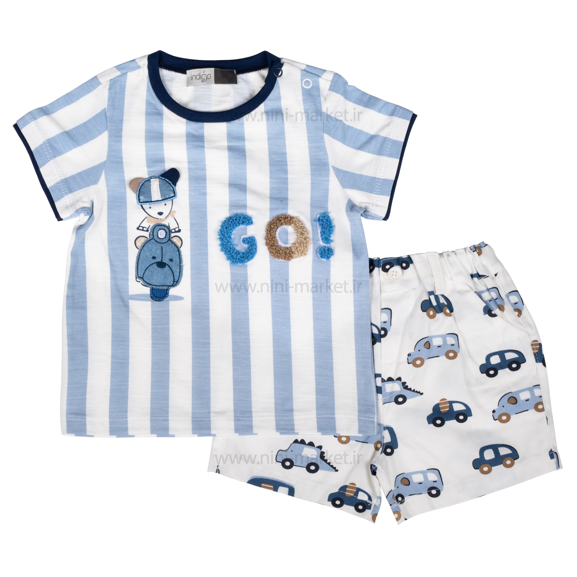 شومیز شورت پسرانه طرح سگ رنگ آبی ایندیگو Indigo از الیاف پنبه بوده و بسیار نرم و لطیف است و نوزاد در آن احساس راحتی میکند. الیاف از پنبه درجه یک تهیه شده است و مادران با خیال راحت میتوانند این ست را برای فرزند خود تهیه کنند. ست دو تیکه ایندیگو شامل شورت –بلوز آستین کوتاه می باشد. شورت این ست کرم که طرح ماشین به صورت پترن چاپ شده است و در قسمت کمر شورت یک کش پهن شده است که هیچ فشاری به شکم کودک وارد نمیکند. یقه بلوز آستین کوتاه گرد می باشد که به رنگ زمینه آن آبی راه راه که طرح سگ موتور سوار به صورت تکه دوزی و گلدوزی درآمده که زیبای آن را چندین برابر کرده است همچنین در قسمت سرشانه بلوز دو عدد دکمه فلزی تعبیه شده که به راحتی می توان آن را باز کرد که به هنگام پوشاندن آن فشاری به سر کودک وارد نمی شود .