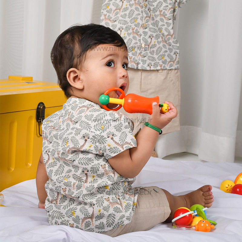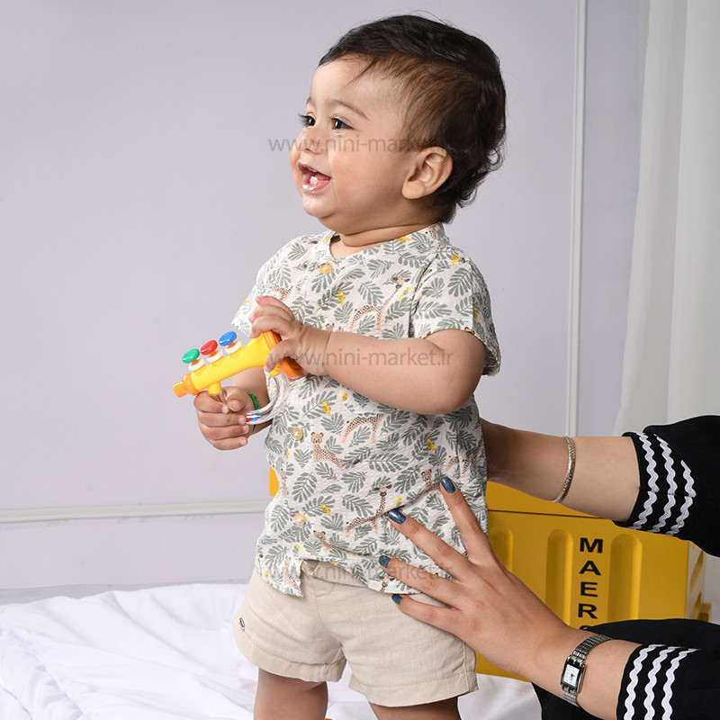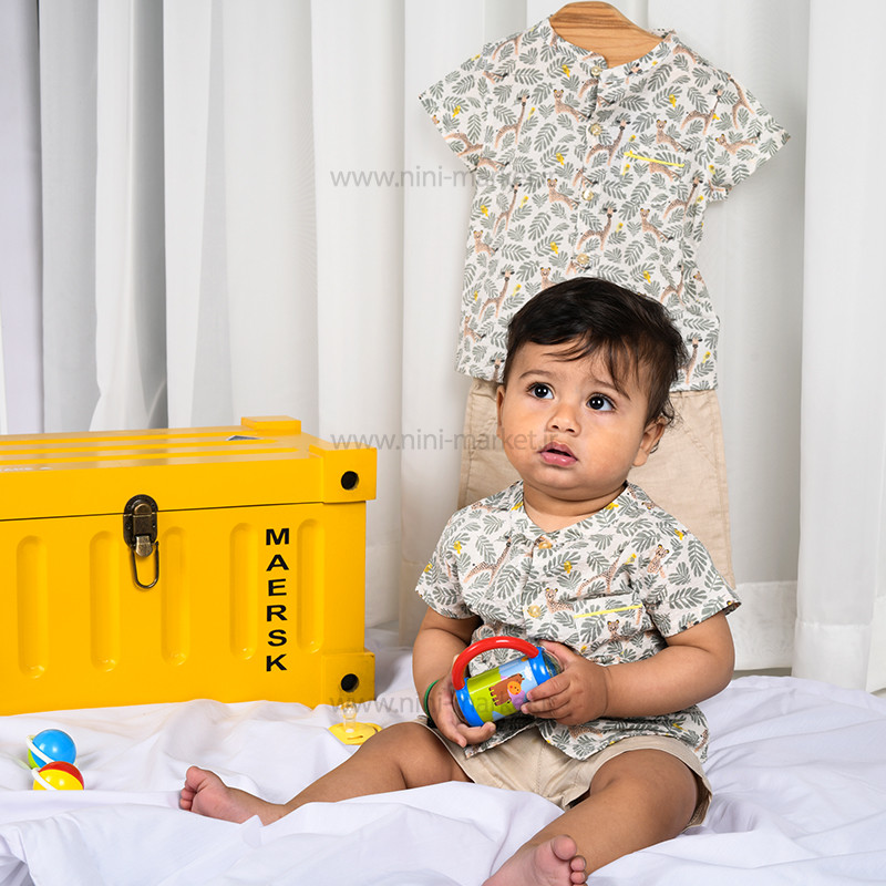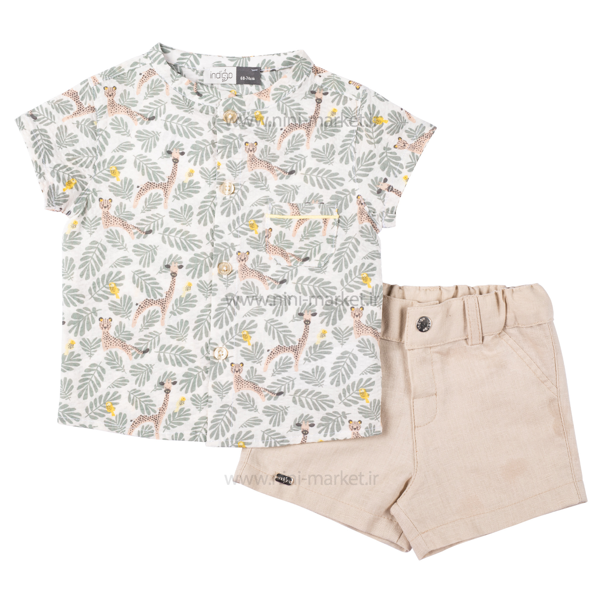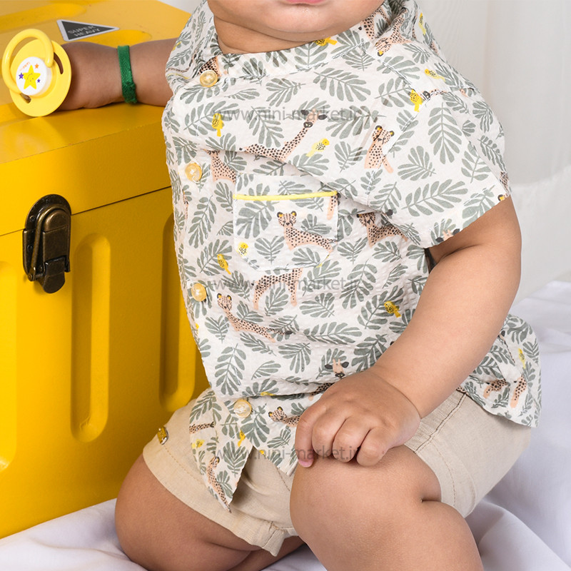 شومیز شورت طرح برگ رنگ کرم – سبز ایندیگو Indigo از الیاف پنبه بوده و بسیار نرم و لطیف است و نوزاد در آن احساس راحتی میکند. الیاف از پنبه درجه یک تهیه شده است و مادران با خیال راحت میتوانند این ست را برای فرزند خود تهیه کنند. ست دو تیکه ایندیگو شامل شورت –شومیز آستین کوتاه می باشد. شورت این ست کرم می باشد و در قسمت کمر شلوار به صورت کمربندی کار شده است که میتوان آن را با ساسبند یا کمربند رنگی ست کرد که به راحتی میتوان آن را تن کودک کرد که هیچ فشاری به کمر و شکم آن وارد نمیشود. یقه شومیز آستین کوتاه گرد می باشد که به رنگ زمینه آن سفید که طرح حیوانات جنگل و برگ به صورت رنگی و پترن درآمده که زیبای آن را چندین برابر کرده است همچنین در قسمت جلو بلوز 4 دکمه کارشده که به راحتی می توان آن را باز کرد که هنگام پوشاندن آن فشاری به سر کودک وارد نمی شود .