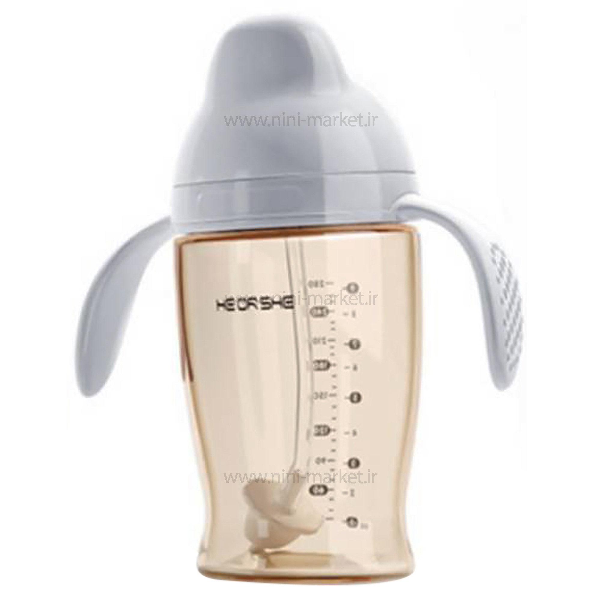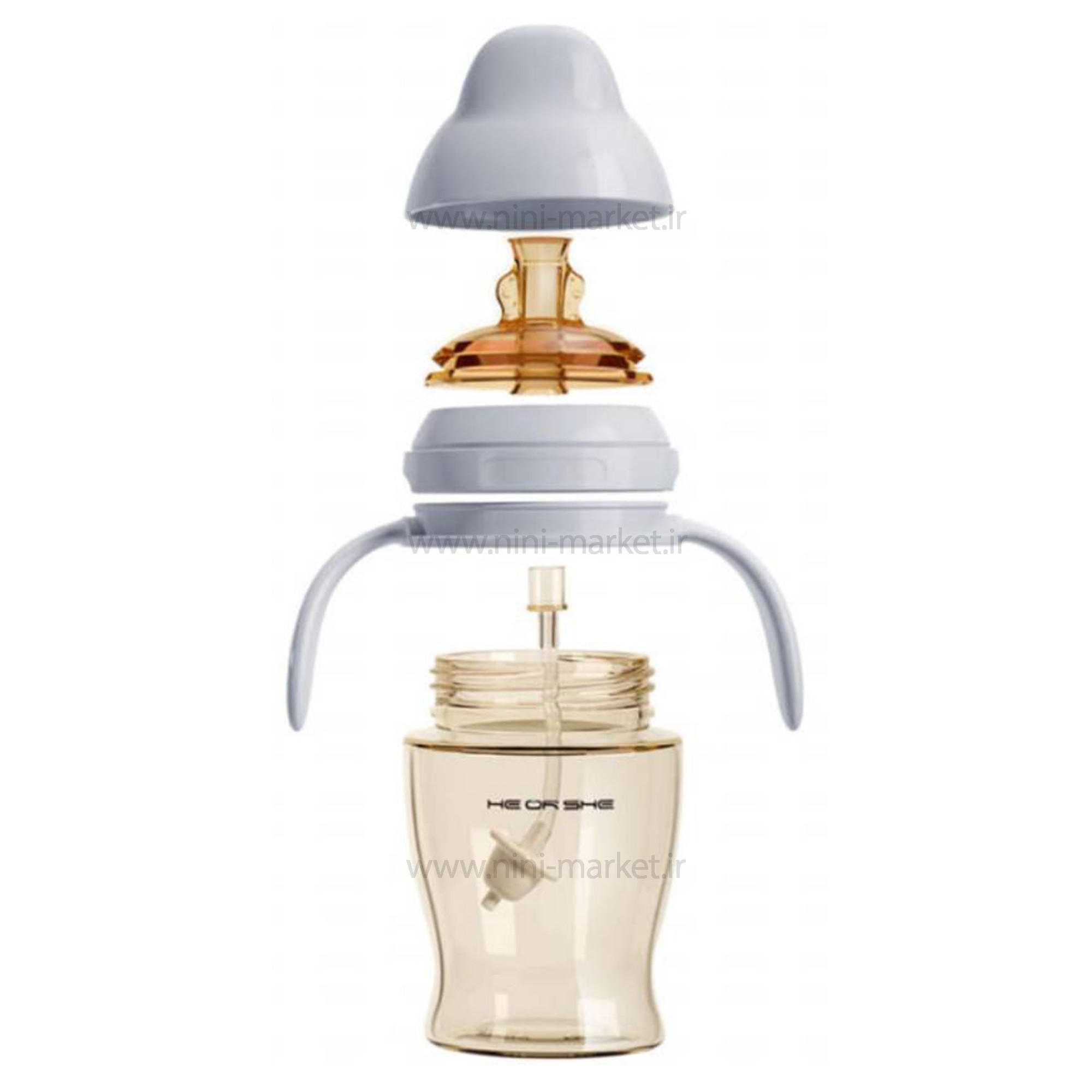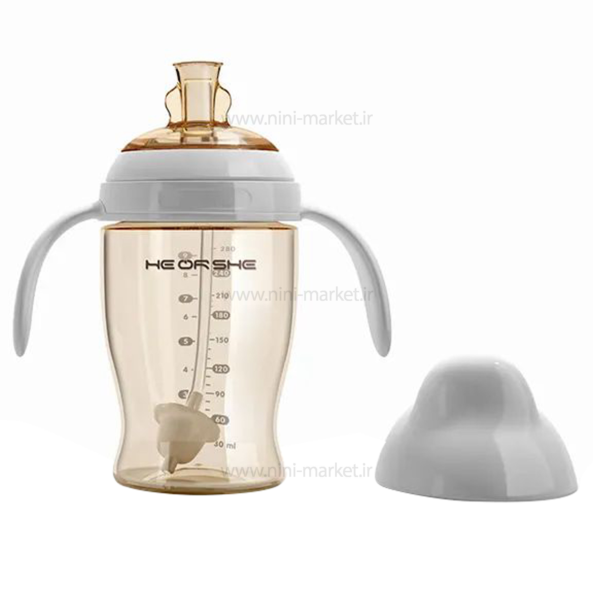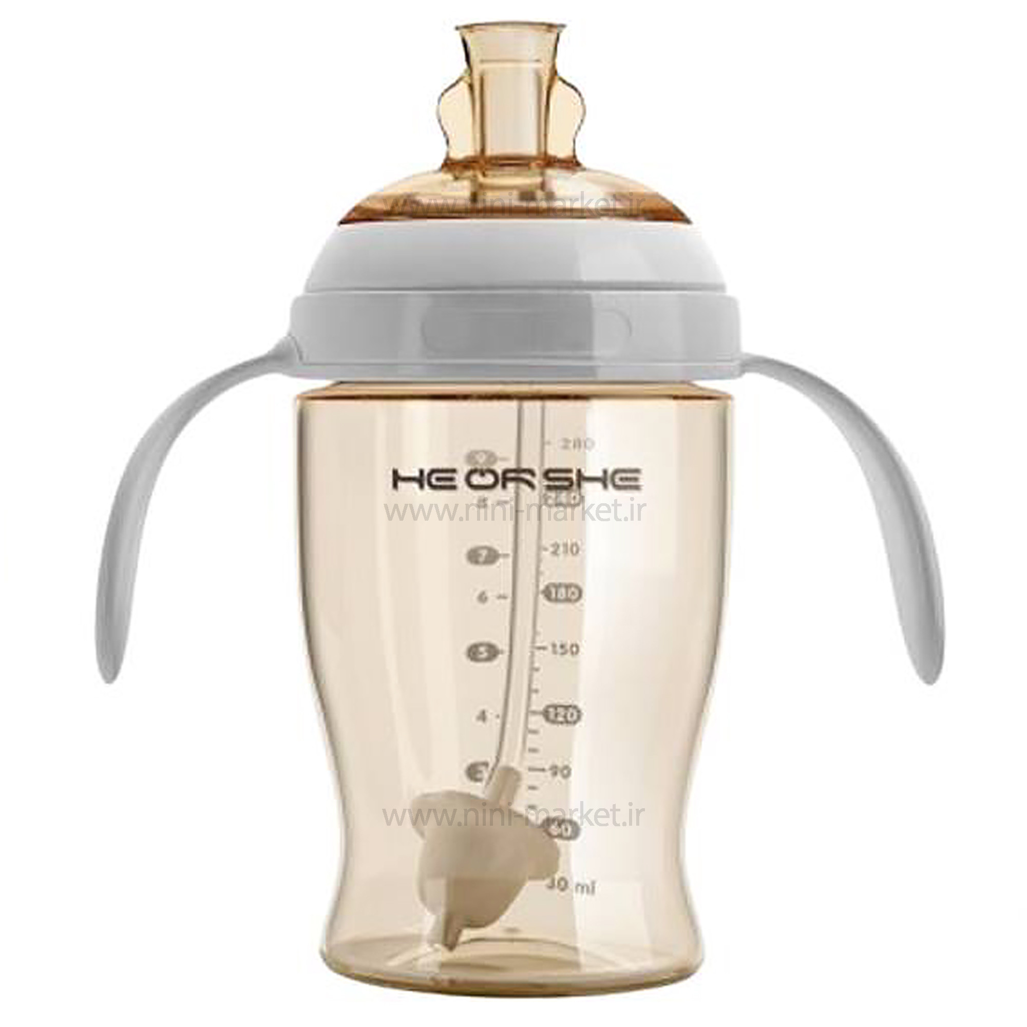 لیوان آبمیوه خوری 280 رنگ آبی میل هی اور شی HEORSHE جزو جدیدترین محصولات سیسمونی روز دنیاست که هم‌اکنون در فروشگاه اینترنتی نی نی مارکت برای شما والدینی که علاقه به تهیه محصولات با کیفیت برای فرزندان خود دارید عرضه شده است . کودکان بعد از شیشه شیر نیاز به لیوان‌های آبمیوه‌خوری دارند تا بتوانند به مرور و بصورت مستقل نوشیدن با لیوان را یاد بگیرند. اما هر لیوانی مناسب کودکان نیست زیرا، باتوجه به نوپا بودن آنها، ممکن است شیر یا مایعات را روی خود یا روی مکان های مختلف بریزند؛ از این جهت از مهم‌ترین اولویت‌های هر لیوانی، ضدچکه بودن آن است تا با خیال راحت بتوانید لیوان را در اختیار او قرار دهید. این لیوان با طراحی منحصربه‌فرد 360 درجه و نی مخصوص، شرایطی را برای فرزند شما مهیا می‌کند که در هر حالتی(نشسته، خوابیده یا ایستاده) بتواند تا آخرین قطره از لیوان خود بنوشد. سری لیوان آبمیوه خوری هی اور شی از جنس کاملا سیلیکونی قابل انعطاف تولید شده تا کودک بتواند براحتی مایعاتی همچون شیر، آب و آبمیوه را در آن بنوشد. لیوان آبمیوه خوری 280 میل هی اور شی HEORSHE دارای سرشیشه کاملا ضد نفخ می‌باشد که از دل‌درد و نفخ کودک جلوگیری می‌کند. بدنه آن فاقد هرگونه مواد مضر بوده و می‌توان آنرا برای گرم کردن مایعات داخل مایکروفر قرار داد. حجم این لیوان 280 میل بوده و سری آن برای کودکان بالای نه ماه طراحی شده است. دسته‌های مخصوص درنظر گرفته شده برای این لیوان ویژه بوده تا کودک به راحتی بتوان آنرا در دست بگیرد. البته این دسته‌ها قابل جدا شدن هستند تا بتوان بصورت مستقل از این لیوان آبمیوه‌خوری کودک استفاده کرد. لیوان آبمیوه خوری هی اور شی جنس سیلیکونی دارد و از موم زنبور عسل ساخته شده است. فاقد مواد شیمیایی مضر مانند بیسفنول آ که تاثیر منفی بر رشد هورمون های کودکان دارد، می باشد. لیوان ابمیوه خوري هی اور شی دارای نی چرخشی 360 درجه است که به کودک کمک می کند به راحتی آبمیوه یا شیر و هر نوشیدنی دیگری را که می خواهد بخورد. آبمیوه خوری کودک دارای یک نی سیلیکونی می باشد که این امکان را برای کودک فراهم می کند تا هنگام خوابیدن نیز بتواند از آن استفاده کند. این ویژگی لیوان در گرفتن شیشه شیر از کودک به والدین کمک بیشتری خواهد کرد. سر لیوان جنس سیلیکونی و نرمی دارد. ویژگی خوب این محصول خاصیت ضدچکه آن است که اجازه ریختن مایع داخل لیوان به بیرون را نمی دهد.