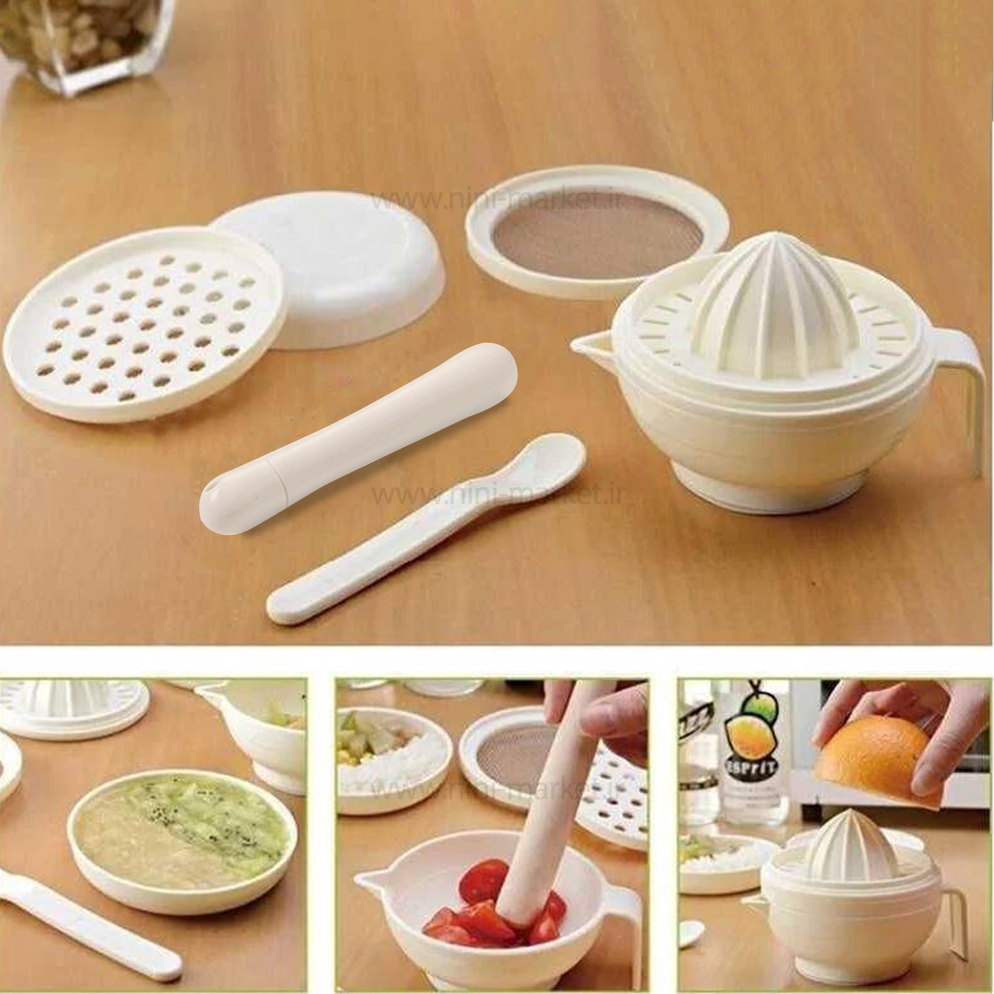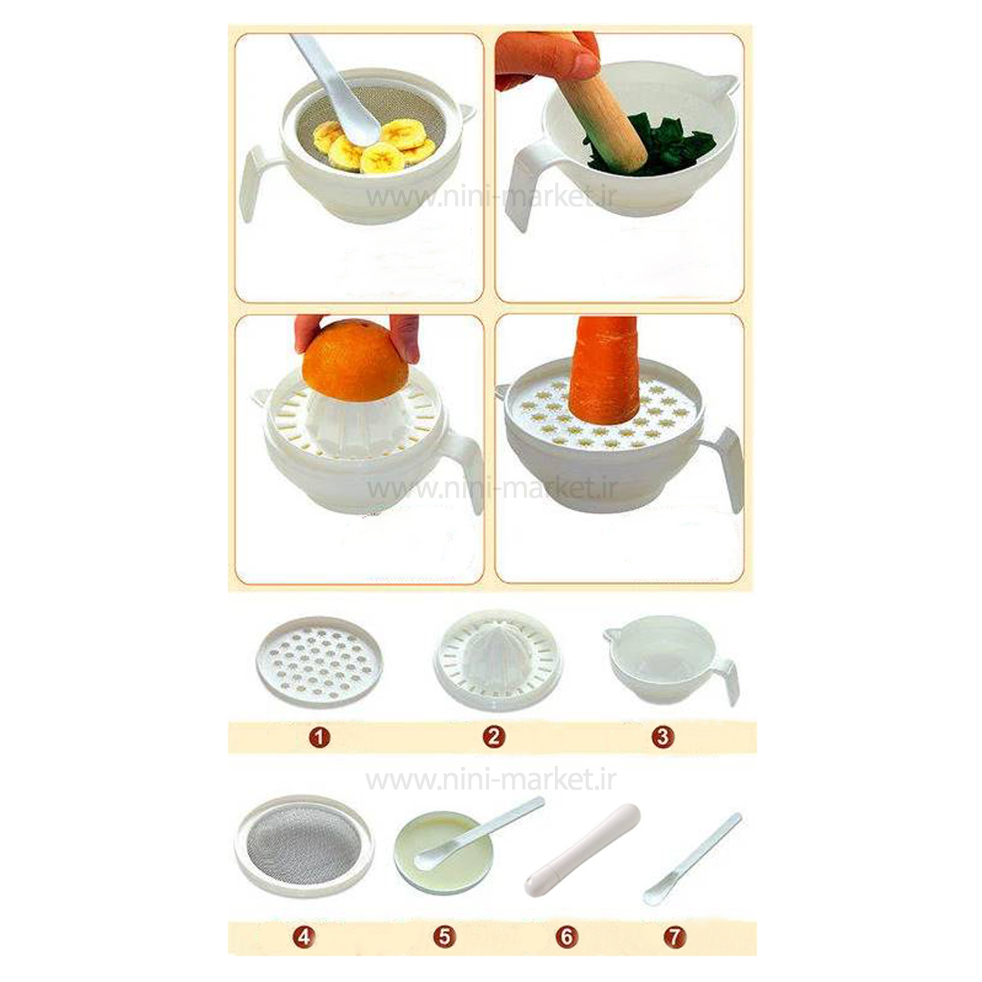 غذاساز دستی 7 تکه رووکو به ما کمک می کند تا به راحتی و با سرعت بالا بتوانیم برای کودک دلبندمان غذای مورد علاقه اش را درست کنیم، غذاساز دستی ۷ تکه رووکو یک غذاساز دستی کوچک اما با کیفیت بالا است، که با استفاده از آن می توان میوه جات تازه و سبزیجات پخته شده را تبدیل به سوپ، پوره میوه کرد. این ست غذا خوری رووکو شامل 7 تکه اساسی می باشد که دارای: یک عدد آب میوه گیری، یک عدد توری، یک عدد قاشق، یک عدد گوشتکوب استوانه ای، یک عدد کاسه آبمیوه گیری دسته دار، یک عدد رنده و یک عدد کاسه کوچک می باشد . از آبمیوهگیری میتوانید برای گرفتن آب میوههایی مانند پرتقال استفاده کنید. همچنین توری تعبیه شده باعث میشود که تفاله میوه قاطی آبمیوه نشود و کودک لذت بیشتری از نوشیدن آبمیوه ببرد. از گوشتکوب میتوان برای له کردن گوشت و سیب زمینی پخته شده جهت تهیه پوره استفاده کرد و رنده نیز کار تهیه غذاهای دیگری که کودک نمیتواند به صورت عادی آنها را میل کند، راحت میکند. به علاوه، کاسه مخصوص غذاساز شما را از خرید و یا حمل ظرف اضافی بی نیاز میکند. در کنار این محصول یک قاشق مخصوص نیز ارائه شده است که طراحی آن متناسب با دستان ظریف کودک به گونهای بوده که کودک به راحتی میتواند قاشق را در دست بگیرد. دارای درپوش محافظ مخصوص که خیالتان را از بابت حمل راحت و مسائل بهداشتی راحت میکند. تهیه یک غذاساز کودک از جمله وسایل هایی ست که هم برای راحتی مادران و هم کودکان توصیه میشود. استفاده از چنین وسیلههایی با اجزای مختلف و کاربردی برای درست کردن غذای کودک میتواند لحظات دلپذیری را برای کودک به ارمغان بیاورد و راحتی شما والدین عزیز را نیز دو چندان میکند.