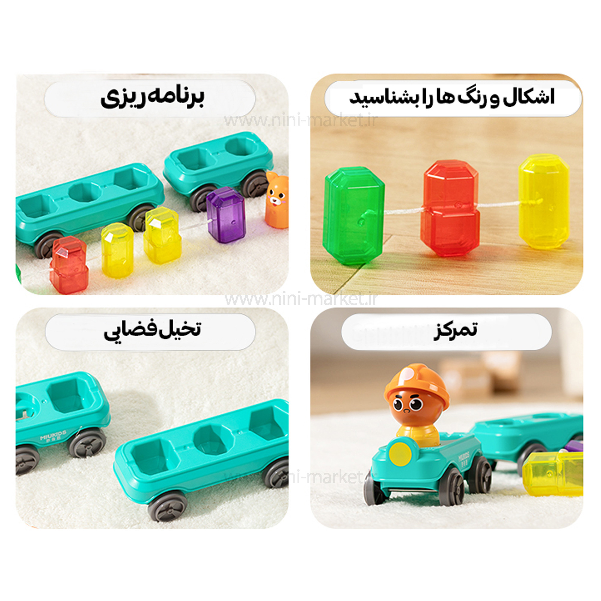 • مزیت : کمک به تقویت حافظه - تقویت مهارت تشخیص و تمایز رنگ ها - تقویت مهارتهای حل مساله و دلیل یابی - افزایش مهارت های دیداری - کمک به جهت رشد مهارت های بصری - تشخیص بافت اشیاء با حس لامسه - تقویت هماهنگی بین چشم و دست کودک - تقویت هوش منطقی - دارای چند وسیله نقلیه کوچک - دارای یک قطار – نیاز به باتری ندارد