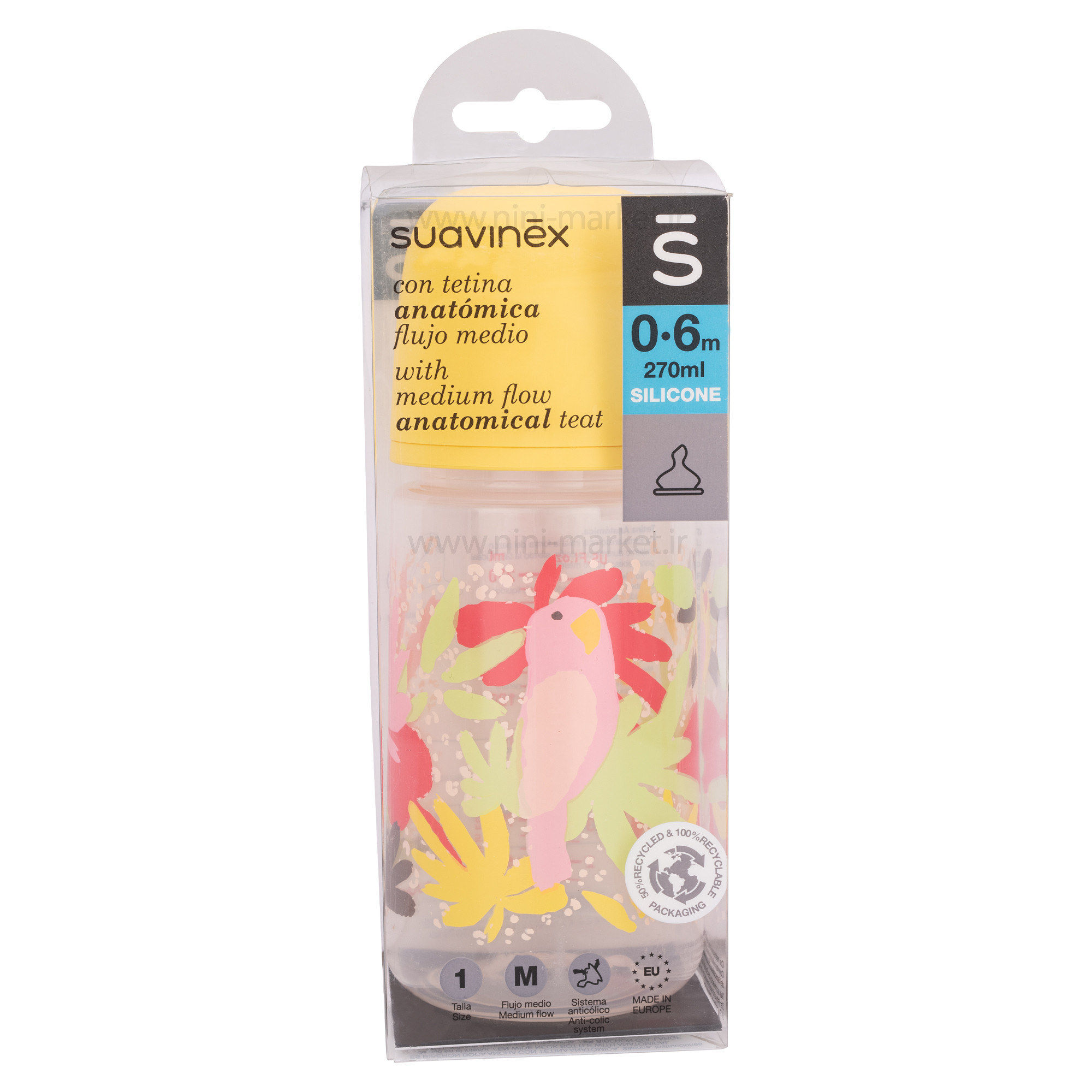 شیشه شیر 270 میل طرح طوطی رنگ زردسوانیکس Suavinex از جدیدترین محصولات فیزیولوژیک این برند است.محصولات فیزیولوژیک سوانیکس با سیلیکون نازک و محکم تولید شده اند که بسیار شبیه بافت و قوام سینه ی مادر است و بنابراین احتمال پذیرش آن برای نوزاد بیشتر است و به راحتی می تواند به آن عادت کند، دهانه ی این شیشه شیرهای سوانیکس پهن است و به همین خاطر شستشوی آنها برای خانواده ها آسان است، همچنین طرح های خاص این شیشه شیرها متفاوت با سایر انواع شیشه شیر بوده و برای نوزاد جذابیت دارد. سرشیشه شیر گرد بوده و از جنس سیلیکون طبیعی و نرم برای نوزاد دلبند شمااست، همین طور دارای منافذ خروجی هوا جهت جلوگیری از نفخ نوزاد است که از ایجاد دل درد در کودک نیز جلوگیری می کند، سرشیشه از نوع 3 حالته متغیر (جریان آهسته، متوسط و سریع) بوده و مناسب استفاده از بدو تولد است.