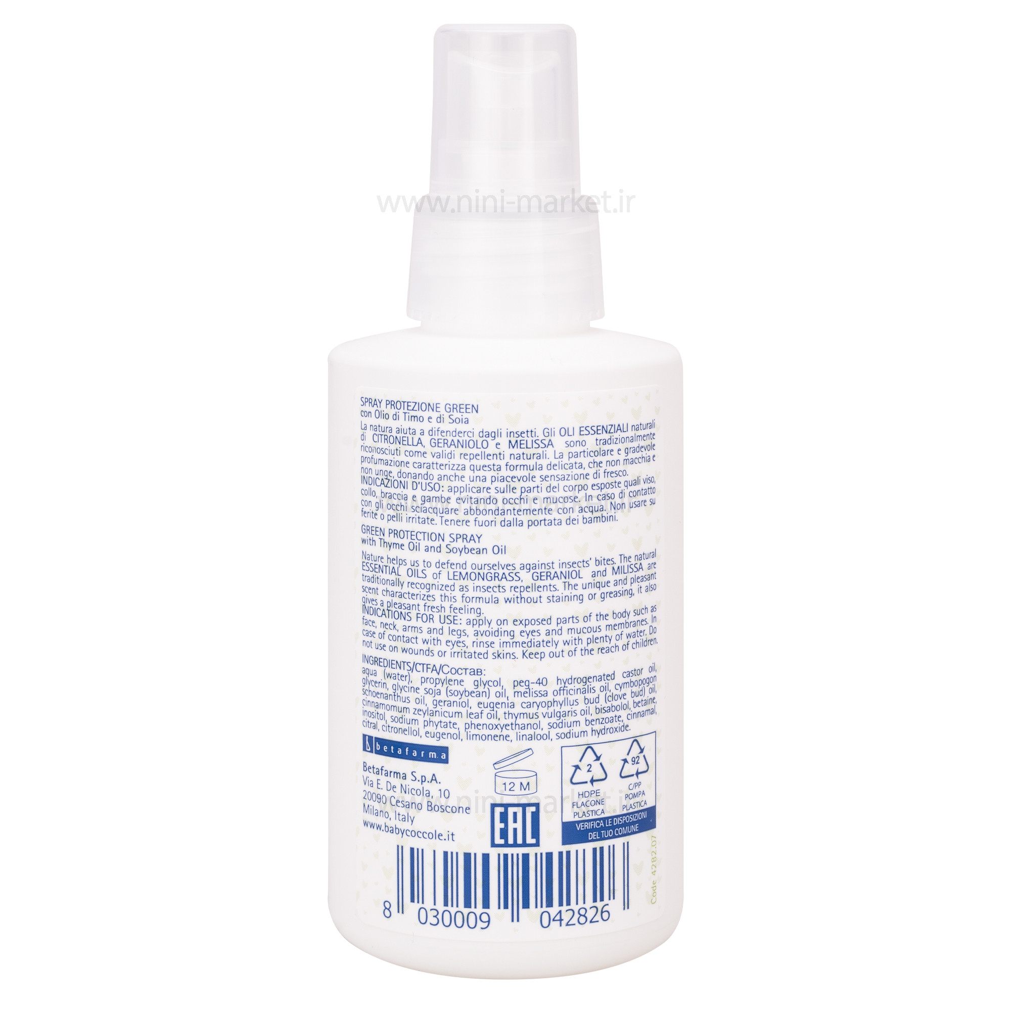 اسپری محافظ ضد حشره 125 میل برند بیبی کوکول baby cocol یک محصول کاربردی در فصل تابستان می باشد که از کودکانتان در مقابل گزش حشرات محافظت میکند. یکی از نگرانی های والدین به خصوص در فصل تابستان و هوای گرما و مسافرت ها محافظت بدن کودک از حشرات و میکروب های مختلفی است که از طریق نیش حشرات به کودک منتقل می شوند. یکی از بهترین روش های حفظ پوست کودک از حشرات و آلودگی های ناشی از آن استفاده از اسپری ضد حشره بی بی کوکول است. در تولید این اسپری از روغن های طبیعی مانند شمعدانی، اسانس لیمو، آویشن گلیسیرین و ملیسا استفاده شده است و دارای خاصیت مرطوب کنندگی و تغذیه کنندگی پوست حساس کودکان است و همین طور رایحه ای مطبوع و دلپذیر داشته و فاقد رنگ و چربی است، این محصول باعث محافظت از پوست کودک دلبند شما در برابر گزیدگی حشرات موذی و دفع آن ها می شود.اسپری ضد حشره بیبی کوکول دارای PH سازگار و مناسب با پوست کودک است. این محصول را می توانید روی پوست کودک خود اسپری نمایید اما دقت کنید که از اسپری کردن این محصول در محدوده ی چشم ها و دهان و حفره ی بینی کودک بپرهیزید و چنانچه به صورت اتفاقی مقداری از اسپری وارد چشم ها شد، با آب زیاد منطقه را شستشو دهید.