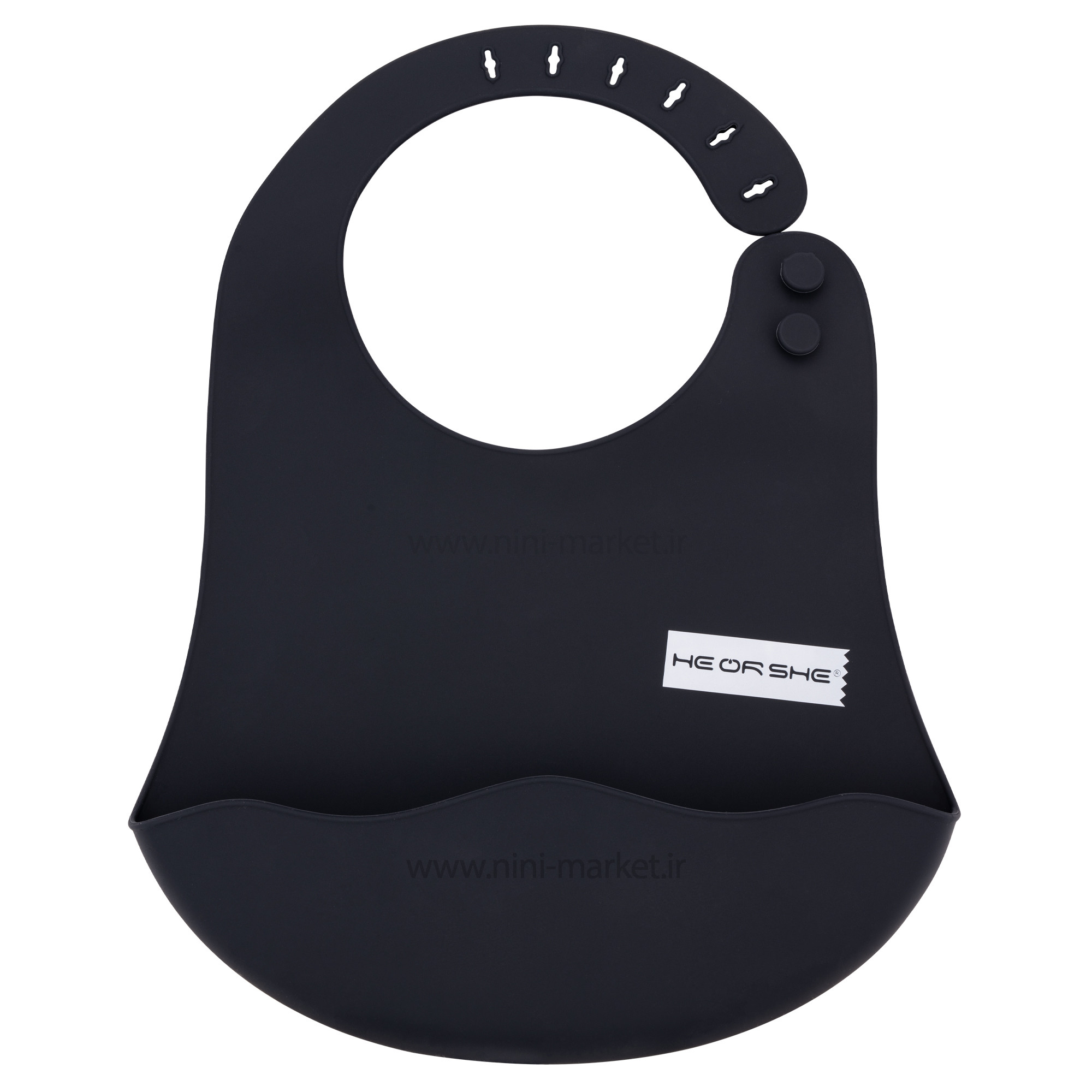 پیشبند سیلیکونی رنگ مشکی هی اور شی Heorshe از یک ماده نرم و سیلیکونی ساخته شده است که فاقد BPA و مواد غیر سمی می باشد. پیشبند نوزاد یکی از لوازمی است که مادران عزیز حتما به آن نیاز پیدا می کنند و می‌تواند آنها را از تعویض و شستشوی پی‌درپی لباس‌های کودک نجات دهد. پیشبند سیلیکونی هی اور شییکی از محصولاتی است که می تواند در زمان غذاخوردن کودک به شما کمک کند و مناسب برای رده سنی 4 ماه به بالا است. پیشبندهای سیلیکونی ضد آب است و کمتر لکه غذا را روی خود نگه می‌دارند و همچنین شستشوی آنها نیز آسان‌تر است و می توانید از ماشین ظرفشویی نیز برای شستشوی آن استفاده کنید.به همین خاطر استفاده از این محصول بسیار راحت است ، پوست کودک را تحریک نمی کند و موجب حساسیت نمی شود. پیشبند غذاخوری هی اور شی دارای 6 موقعیت تنظیم سایز و 6 دکمه است که می توانید متناسب با کودک خود سایز آن را تنظیم و همچنین حالت جیب دار قسمت پایین آن از ریختن غذا بر روی زمین و یا لباس کودک کاملا جلوگیری می کند. پیشبندهای معمولی موجود در بازار تنها از کثیف شدن لباس کودکان جلوگیری می کنند و تاثیر در ریختن غذا بر روی زمین ندارند. پیشبند سیلیکونی Heorshe به گونه‌ای طراحی شده است که یک جیب عمیق دارد. سیلیکون مورد استفاده برای تولید این پیشبند Heorshe کاملا نرم و مقاوم در برابر گردوغبار است. برای استفاده از پیشبند سیلیکونی در سنین مختلف، بند آن قابل تنظیم است و ۶ درجه تنظیم دارد. وزن پیشبند کمتر از ۱۰۰ گرم است که این وزن به کمک نوار ۲۵ میلی‌متری به خوبی توزیع می‌شود تا هیچ فشاری به گردن کودکان وارد نشود. همچنین برای این‌که کودکان بر روی غذاخوردن‌شان تمرکز داشته باشند، ساده‌ترین طرح ممکن (تک رنگ) در نظر گرفته شده است تا توجه کودک به پیشبند جذب نشود. پیشبندهای هی اور شی قابل حمل نیز هستند و در صورت جمع شدن، فضای زیادی را اشغال نمی‌کنند. بنابراین به راحتی می‌توانید آن را در کیف لوازم نوزاد قرار دهید تا در هر مکانی بتوانید از این پیشبند استفاده کنید. پیشبند سیلیکونی هی اور شی، با استفاده از ماشین ظرفشویی (طبقه بالا) قابل شستشو است. مقاوم در برابر حرارت تا ۲۰۰ ℃ / ۳۹۲ ℉ به شما این امکان را می‌دهد تا به راحتی پیشبند را در مایکروویو نیز استریل کنید.