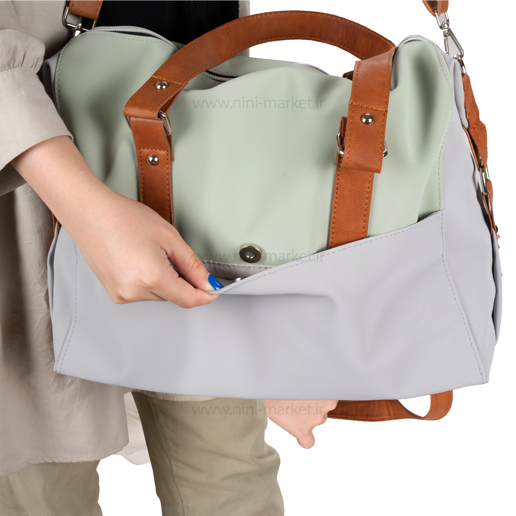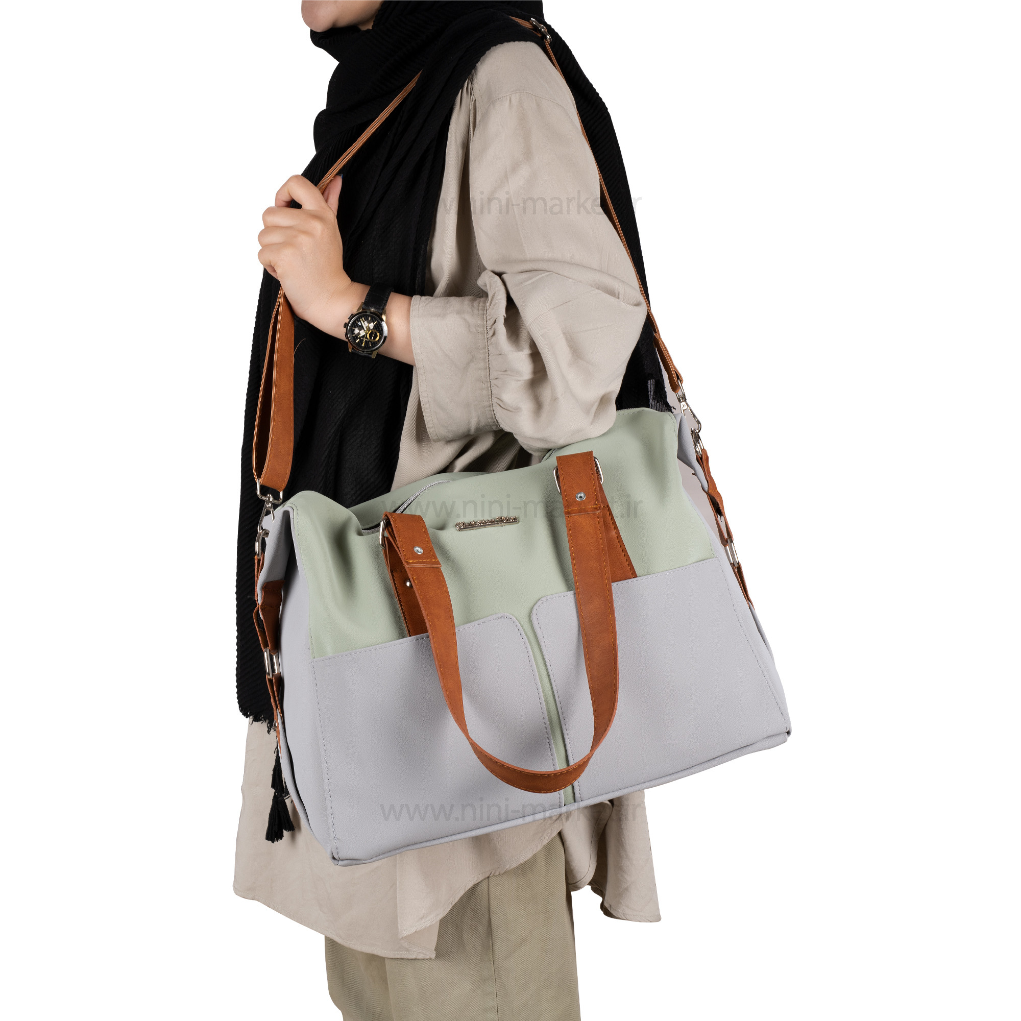 ساک لوازم دوشی رنگ طوسی- مشکی دیور Dior یک ساک لوازم نوزاد که تولید کشور ایران می باشد این محصول کیفیت ساخت و دوخت بالایی دارد. طراحی آن زیبا به همراه رو دوزی های بسیار شیک و برای سیسمونی نوزادان مناسب است. اکثر بانوان عادت دارند از کیف های مختلف برای جابجایی و حمل وسایل مورد نیاز خود استفاده کنند .یکی از ضروری ترین نیازهای مادر نوزاد دار یک ساک لوازم نوزاد است . ممکن است کیف هایی که قبلا از آن ها استفاده می کردیم به علت کم جا بودن دیگر به کارمان نیاید .مرغوب ترین کیف های لوازم آنهایی هستند که اکسسوارهای مفیدی درونشان دارند که زندگی را برایتان راحت تر می کیف لوازم نوزاد جادار و بسیار بزرگ می باشد. جنس ساک چرم و آستری ان ضد آب است. ساک لوازم کودک دارای دسته های چرمی و بند بلند قابل تنظیم برای استفاده راحت تر می باشد. کیفیت و جنس ساک لوازم دوشی دیور بسیار عالی می باشد و خیال ما را از نظر استحکام راحت می نماید. یکی از ویژگی های چشمگیر ساک لوازم نوزاد دیور خاصیت ضد آب بودن این کیف می باشد .فضای داخل کیف بسیار بزرگ و جا دار است که ما می توانیم وسایل مورد نیاز خود را بدون نگرانی از کمبود فضا , با خود جابجا کنیم .ظاهر زیبای این کیف یکی از ویژگی های منحصر به فرد آن می باشد . ساک لوازم بچه داری جیب های بیرونی بزرگی است تا مادر به راحتی به وسایل مختلف مورد نیاز خود دسترسی داشته باشد. همچنین 3 جیب داخلی مخصوص شیشه شیر و پوشک و جیب مخصوص فلاسک دارد. جیب مخصوص شیشه شیر و لیوان دارای عایق است تا دمای آن را برای مدت زمان بیشتری ثابت نگه دارد. عمق زیاد کوله پشتی نوزاد، امکان حمل وسایل زیاد و سنگین را فراهم میکند. کوله پشتی از لحاظ سلامت اسکلتی-عضلانی والدین، نسبت به سایر کیفهای نوزاد انتخاب بهتری است زیرا وزن را به طور مساوی در دو طرف بدن تقسیم میکنند.