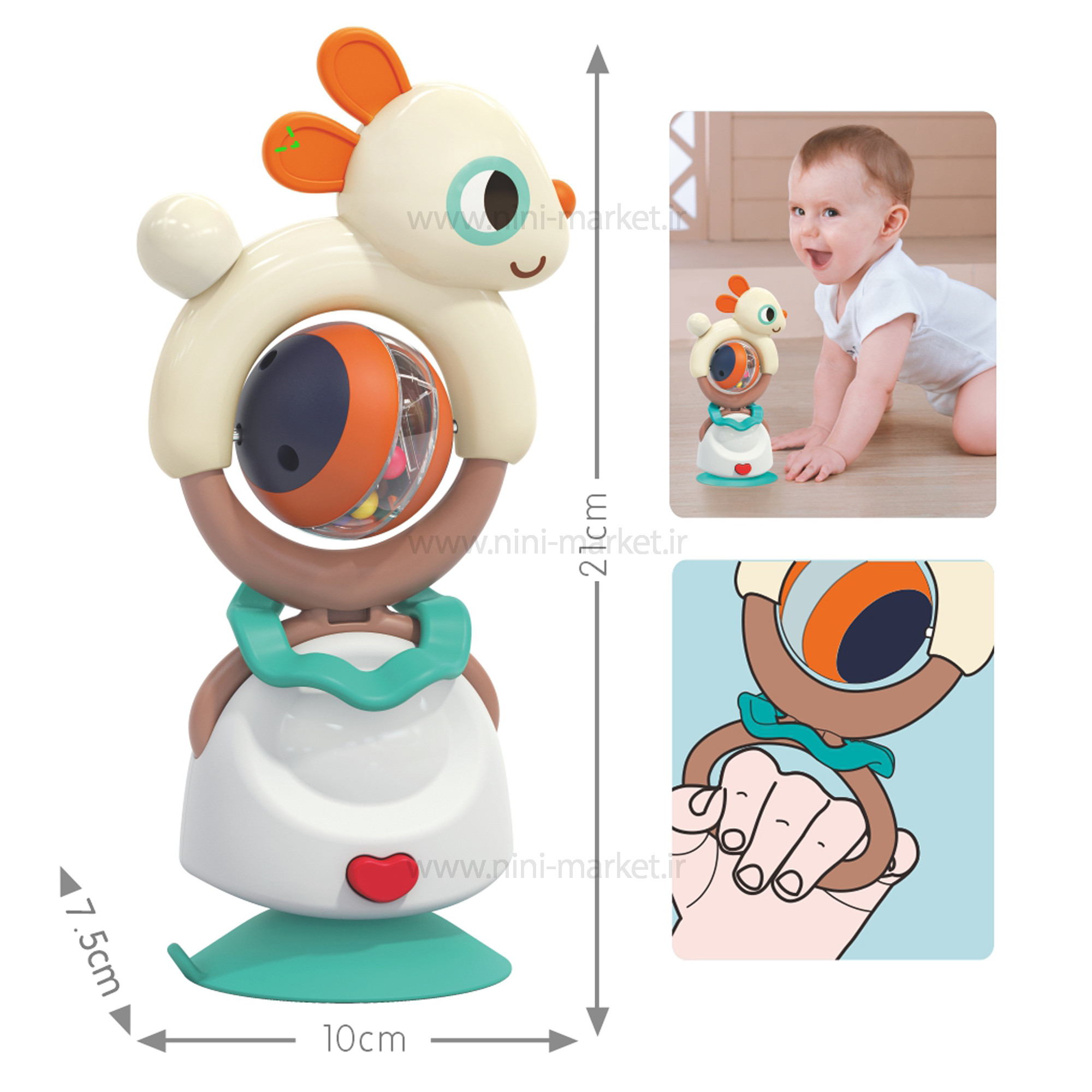 جغجغه صندلی غذا طرح خرگوش رنگ سفید هولی تویز Hulie toys ، جغجغه یکی از اسباب بازی های بسیار مورد علاقه نوزادان است. رنگ های زیبا و صداهای دلنشینی دارد که هر نوزادی را سرگرم و آرام می نماید. جغجغه ها در رشد و پرورش نوزادان بسیار کارایی دارند. کودکان در زمانی که بروی صندلی نشستهاند احتیاج به یک اسباب بازی دارند که با آن بازی کنند و سرگرم باشند. کمپانی هولی تویز یکی از اسباب بازی های مناسب قرار دادن روی صندلی برای کودکان زیر یک سال را تولید کرده است که آن جغجغه صندلی هولی تویز است که دارای طرحهای مختلف از حیوانات میباشد. پایه اسباب بازی از یک قطعه چسبان است که بروی صندلی براحتی چسبیده میشود تا کودک با آن بازی کند و به آن ضربه بزند همچنین قابلیت این را دارد که روی سطوح مختلف از جمله صندلی غذا، روی زمین و… آن را قرار دهید.. این اسباب بازی جغجغه از جنس پلاستیک بسیار با کیفیت ساخته شده است که با رنگ غیر شیمیایی رنگآمیزی شدهاند تا مناسب بازی برای کودکان کوچک باشند. این اسباب بازی کودکانه دارای کیفیت بسیار خوبی است. به گفته محققان جغجغه ها در رشد و پرورش کودکان تاثیر زیادی دارد. صدای جغجغه ها باعث آرام شدن کودکان و شادی آن ها می شود. این جغجغه طراحی خاص و زیبایی دارد و رنگ های به کار رفته در آن برای کودکان بسیار جذابیت دارد. دکمه ای قلب مانند در قسمت پایین جغجغه قرار دارد که با فشردن آن پایه چسبناک جدا می شود و می توانید آن را جا به جا کنید.سری این محصول حالت چرخشی دارد و پاهای آن دارای توپ های کوچک و رنگی می باشد که صدای دلنشینی تولید می کند. یک حلقه زوی این محصول قرار دارد که از جنس دندانگیر بوده و کودک می تواند آن را درون دهان قرار دهد.برای قرار دادن جغحغه بر روی سطح صاف نیاز است مقداری آب را ریخته و قسمت مکنده را روی سطح صاف فشار دهید تا به صورت ثابت بر روی میز بماند. تمامی قطعات مورد استفاده در این محصول فاقد مواد شیمیایی و حساسیت زا می باشد.