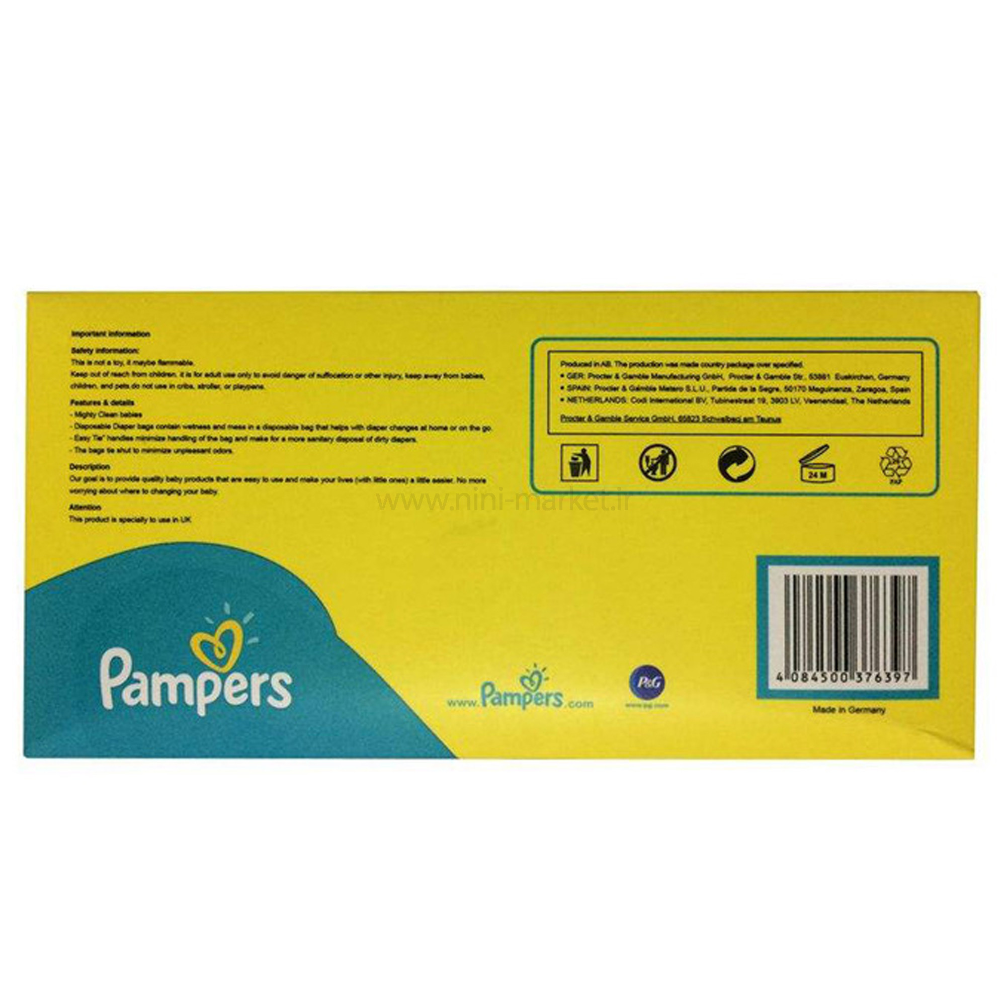 کیسه پوشک 36 عددی پمپرز Pampers ، دارای اندازه مناسب برای پوشک استفاده شده است و دهانه آن چسب دار است و نیازی به گره زدن نمی باشد. کیسه پوشک پمپرز که در یک بسته 36 عددی عرضه می گردد. این کیسه پوشک از لوازم ضروری در وسایل نوزاد شما می باشد که در مواقع ضروری مانند سفر، مهمانی ها و مجالس یا مواقعی که امکان دور انداختن پوشک وجود ندارد می توان از آن استفاده نمود به طوری که خیال مادران را بابت تعویض پوشک در مکان هایی دور از خانه راحت می نماید. کیسه پوشک پمپرز دارای اندازه کاملا مناسب برای پوشک استفاده شده بوده و دهانه آن چسب دار است و نیازی به گره زدن نمی باشد به طوری که از انتشار بوی نامطبوع و آلودگی محیط اطراف جلوگیری می نماید. استفاده از این کیسه های پوشک راحت بوده و گزینه ای ضروری در لوازم بهداشتی کودک دلبند شما می باشد.