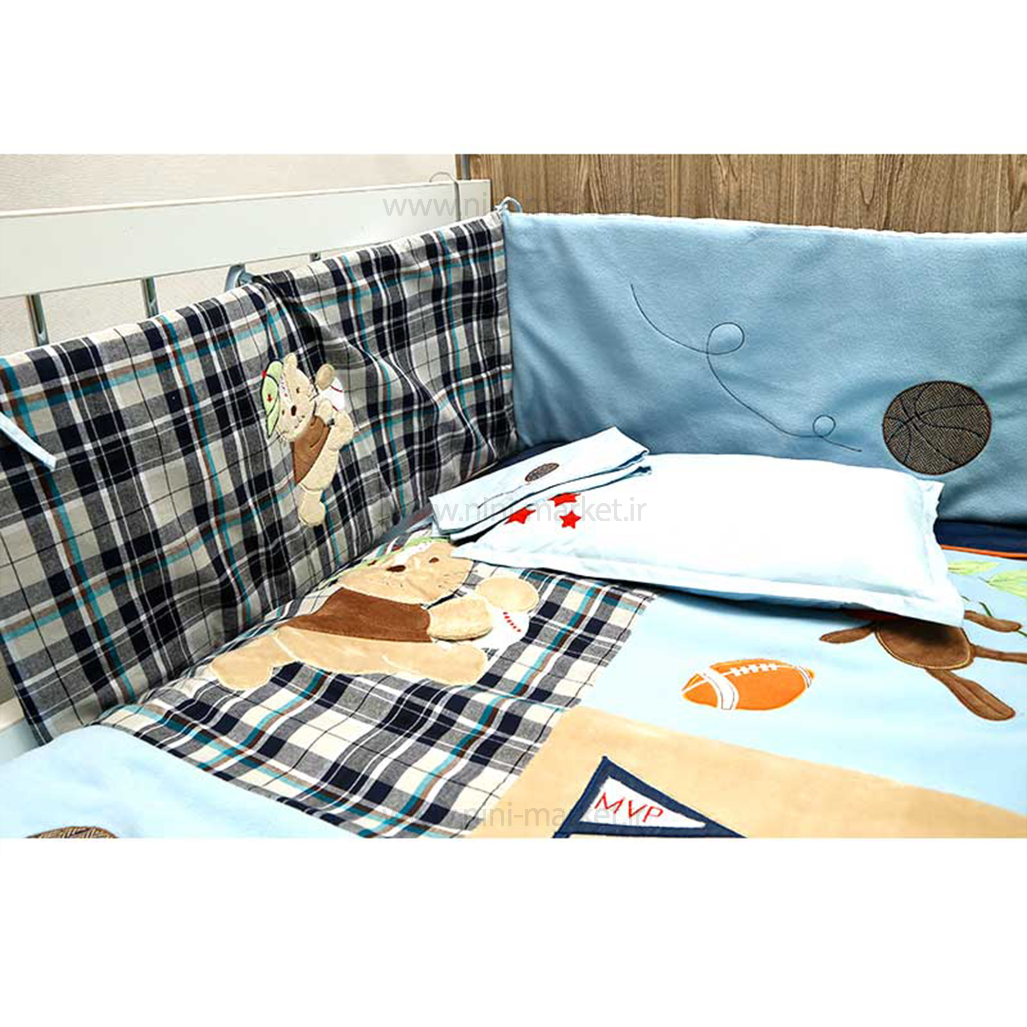 ست روتختی 8 تیکه تیکه دوزی طرح زرافه بیبی فور لایف Baby4life ، یک عددی دور تختی (بامپر) دارد که سه وجه تخت را پوشش می دهد.یک عدد ملحفه بدون کش دارد که برای خوشخواب نوزاد و نوزاد-نوجوان استفاده می شود و یک عدد ملحفه کش دار برای تشک دارد.یک عدد رویه ی داخلی و 2 عدد روبالشتی اصلی دارد.یک عدد لحاف و یک عدد ساک لوازم مجموعه اجزای این محصول را تشکیل می دهند.جنس این محصول پنبه و ضد حساسیت است. سرویس رختخواب بیبی فور لایف نوزاد تخت هایی با فضای داخلی حداکثر 100 در 135 سانتی متر را پوشش می دهد.رویه ی این رختخواب دارای طرح های ورزشی مختلف و عکس حیوانات است.یک ست روتختی خاص و متفاوت نسبت به سایر کالاهای موجود در بازار است.استفاده از ترکیب رنگ های متفاوت آن را زیباتر کرده است.محصولی عالی برای هدیه دادن جهت سیسمونی نوزاد پسر است.دارای ساک پلاستیکی دسته دار است. ابعاد این سرویس رختخواب : لحاف 100 * 135 سانتی متر- بامپر 30 * 210 سانتی متر -ملحفه ی روی تخت 100 * 150 سانتی متر-ملحفه ی روی تشک 70 * 130 سانتی متر-روبالشی اصلی 25 * 40 سانتی متر-آستر داخلی روبالشی 25 * 40 سانتی متر -ساک لوازم 33 * 70 سانتی متر است .