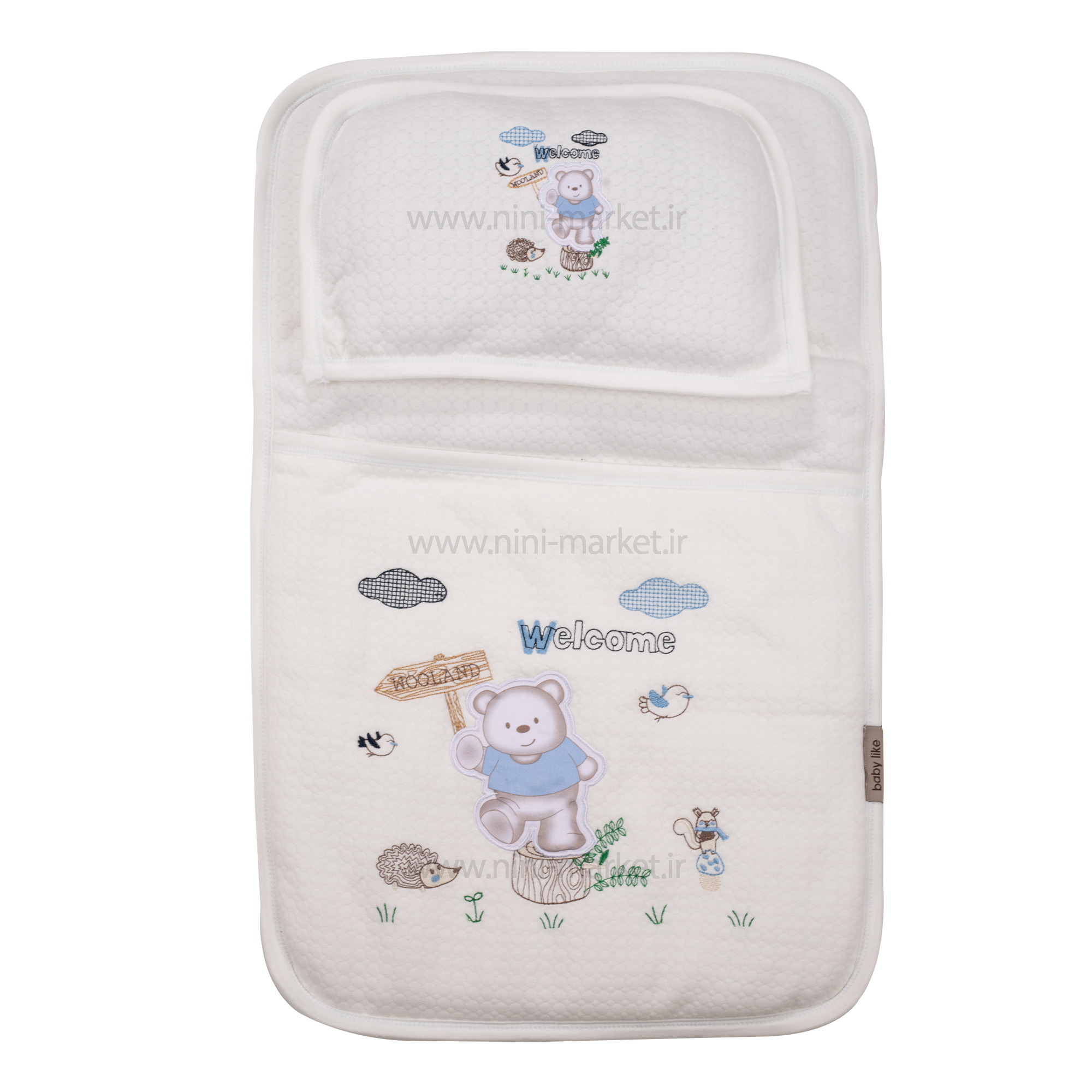سه تیکه مسافرتی طرح خرس درخت آبی بیبی لایک Baby Like شامل یک تشک، یک بالش و یک پتوی نوزادی است.جنس رویه از کتان نرم و با کیفیت است.تشک این محصول قابل استفاده به عنوان قنداق و کیسه خواب برای نوزاد است.یکی از ویژگی های جالب این سه تکه این است که بالش و پتو را می توانید داخل تشک قرار دهید.با این کار فضای کمتری برای حمل این سه تکه اشغال می شود.دارای یک کاور زیپ دار به منظور پیشگیری از آلودگی سه تکه در هنگام حمل و نقل است.این کاور به شما این امکان را می دهد تا به سادگی این رختخواب را همراه خود بیرون از منزل، به گردش یا مسافرت ببرید.این محصول قابل استفاده از بدو تولد نوزاد است. سایز رختخواب نوزاد : بالش: 35 * 24 سانتی متر- تشک: 65 * 41 سانتی متر- پتو: 81 * 82 سانتی متر می باشد . نکات مهم جهت نگهداری از سه تیکه مسافرتی بیبی لایک : قابل شستشو به صورت دستی با دمای 40 درجه سانتیگراد است. از ریختن مواد سفید کننده روی این سه تیکه پرهیز کنید. از انداختن این سه تیکه داخل خشک کن ماشین لباسشویی خودداری کنید.در صورت ضرورت، می توانید با درجه ی ملایم رختخواب را اتو کنید.