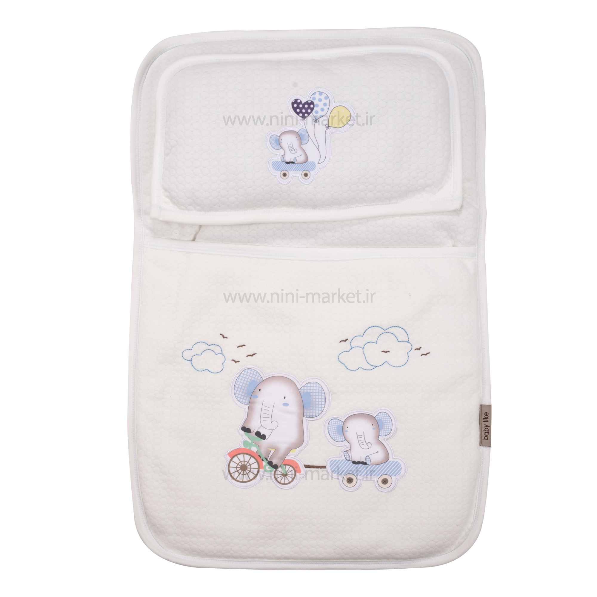 سه تیکه مسافرتی طرح فیل و دوچرخه رنگ آبی بیبی لایک Baby Like شامل یک تشک، یک بالش و یک پتوی نوزادی است.جنس رویه از کتان نرم و با کیفیت است.تشک این محصول قابل استفاده به عنوان قنداق و کیسه خواب برای نوزاد است.یکی از ویژگی های جالب این سه تکه این است که بالش و پتو را می توانید داخل تشک قرار دهید.با این کار فضای کمتری برای حمل این سه تکه اشغال می شود.دارای یک کاور زیپ دار به منظور پیشگیری از آلودگی سه تکه در هنگام حمل و نقل است.این کاور به شما این امکان را می دهد تا به سادگی این رختخواب را همراه خود بیرون از منزل، به گردش یا مسافرت ببرید.این محصول قابل استفاده از بدو تولد نوزاد است. سایز رختخواب نوزاد : بالش: 35 * 24 سانتی متر- تشک: 65 * 41 سانتی متر- پتو: 81 * 82 سانتی متر می باشد . نکات مهم جهت نگهداری از سه تیکه مسافرتی بیبی لایک : قابل شستشو به صورت دستی با دمای 40 درجه سانتیگراد است. از ریختن مواد سفید کننده روی این سه تیکه پرهیز کنید. از انداختن این سه تیکه داخل خشک کن ماشین لباسشویی خودداری کنید.در صورت ضرورت، می توانید با درجه ی ملایم رختخواب را اتو کنید.