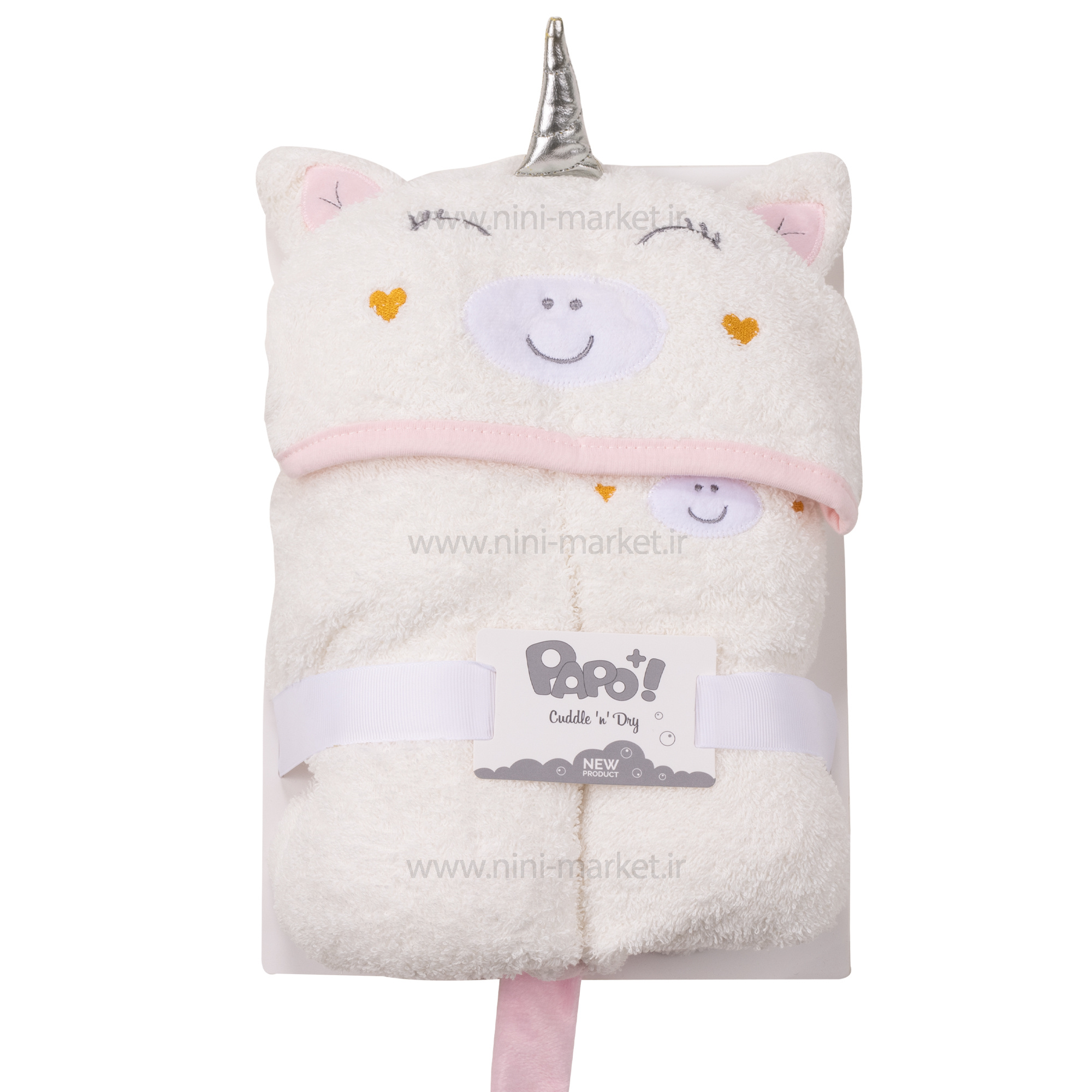 حوله تن پوش طرح اسب تک شاخ رنگ سفید پاپو Papo تهیه شده از کتان پنبه که بسیار نرم و ضد حساسیت می باشد . همچنین جذب آب بالا از جمله فاکتورهای مهم است که باید در هنگام خرید به آن دقت داشت.معمولا حوله هایی با پرز های کوتاه،جذب آب بالاتری داشته وزمان کمتری برای خشک کردن بدن نوزاد نیاز دارد. حوله نوزاد از وسایل ضروری برای سیسمونی نوزاد است. خرید یک حوله ی با کیفیت بسیار حائز اهمیت است.والدین باید حوله ای که برای نوزاد خود خریداری کنند که از بهترین پارچه ی نرم و لطیف تهیه شده باشد و هیچ نوع زبری نداشته باشد. یک حوله ی ایده آل باید آبگیری خوبی هم داشته باشد. تهیه شده از جنس 100 درصد کتان برای نوزاد است.حوله کلاه دار به شما کمک می کند تا پس از استحمام از سرد شدن سر نوزاد جلوگیری کنید. کلاه حوله پاپو شبیه عروسک و برای نوزاد جالب توجه است.دارای دور دوزی زیبا و تمیز با گلدوزی و تکه دوزی شکیل روی حوله است. مناسب نوزاد از بدو تولد تا چهار سالگی است.مدل بستن حوله به شکلی است که داخل کلاه، سر عروسک جای می گیرد.این طراحی زیبا برای مادرانی که قصد خرید وسایل سیسمونی زیبا برای دکوراسیون خاص اتاق نوزاد را دارند، عالی است.