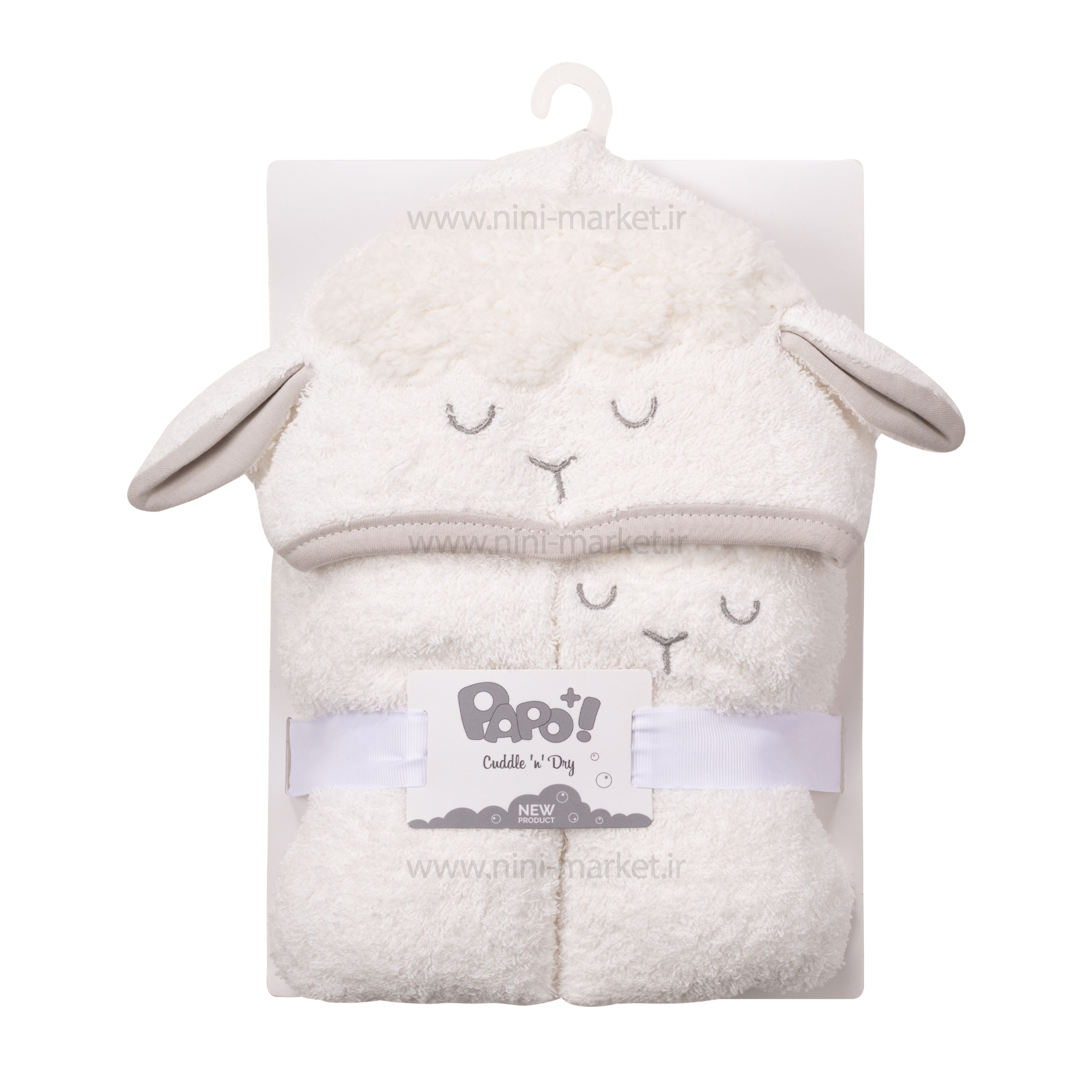 حوله تن پوش طرح گوسفند رنگ سفید پاپو Papo تهیه شده از کتان پنبه که بسیار نرم و ضد حساسیت می باشد . همچنین جذب آب بالا از جمله فاکتورهای مهم است که باید در هنگام خرید به آن دقت داشت.معمولا حوله هایی با پرز های کوتاه،جذب آب بالاتری داشته وزمان کمتری برای خشک کردن بدن نوزاد نیاز دارد. حوله نوزاد از وسایل ضروری برای سیسمونی نوزاد است. خرید یک حوله ی با کیفیت بسیار حائز اهمیت است.والدین باید حوله ای که برای نوزاد خود خریداری کنند که از بهترین پارچه ی نرم و لطیف تهیه شده باشد و هیچ نوع زبری نداشته باشد. یک حوله ی ایده آل باید آبگیری خوبی هم داشته باشد. تهیه شده از جنس 100 درصد کتان برای نوزاد است.حوله کلاه دار به شما کمک می کند تا پس از استحمام از سرد شدن سر نوزاد جلوگیری کنید. کلاه حوله پاپو شبیه عروسک و برای نوزاد جالب توجه است.دارای دور دوزی زیبا و تمیز با گلدوزی و تکه دوزی شکیل روی حوله است. مناسب نوزاد از بدو تولد تا چهار سالگی است.مدل بستن حوله به شکلی است که داخل کلاه، سر عروسک جای می گیرد.این طراحی زیبا برای مادرانی که قصد خرید وسایل سیسمونی زیبا برای دکوراسیون خاص اتاق نوزاد را دارند، عالی است.