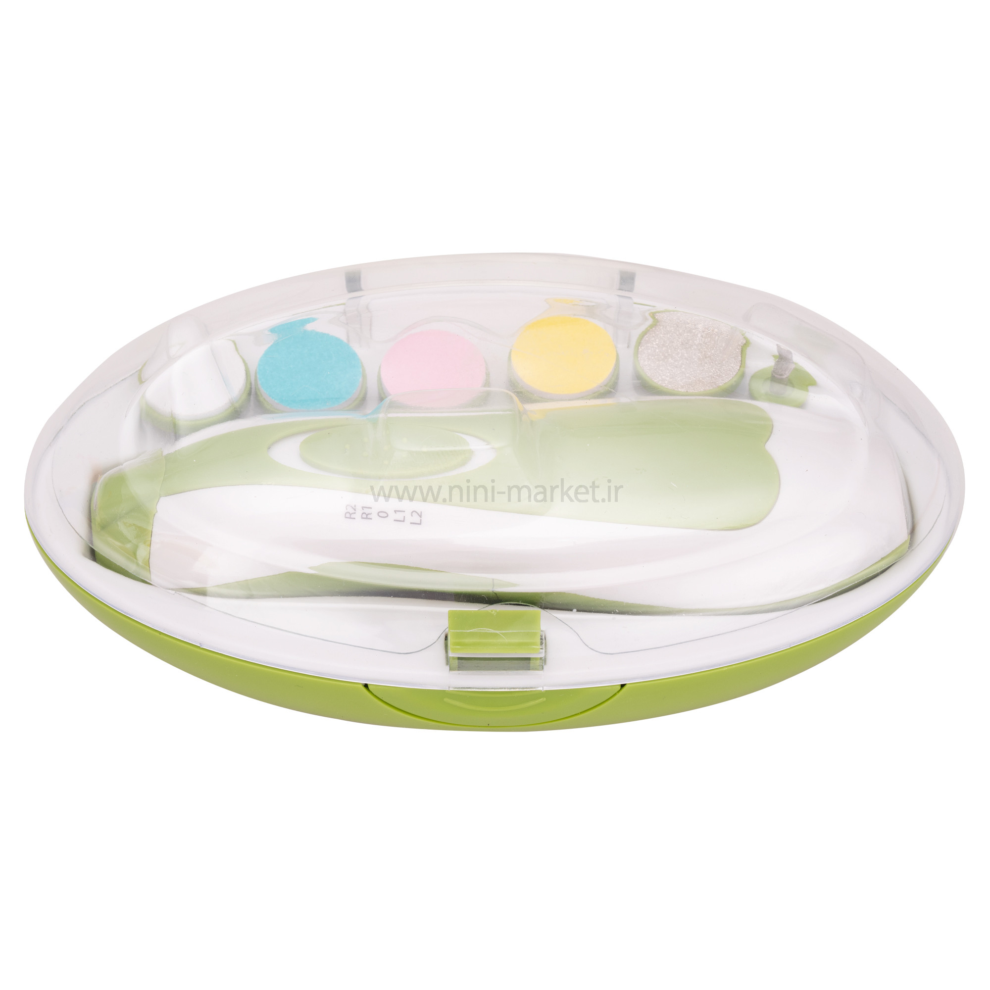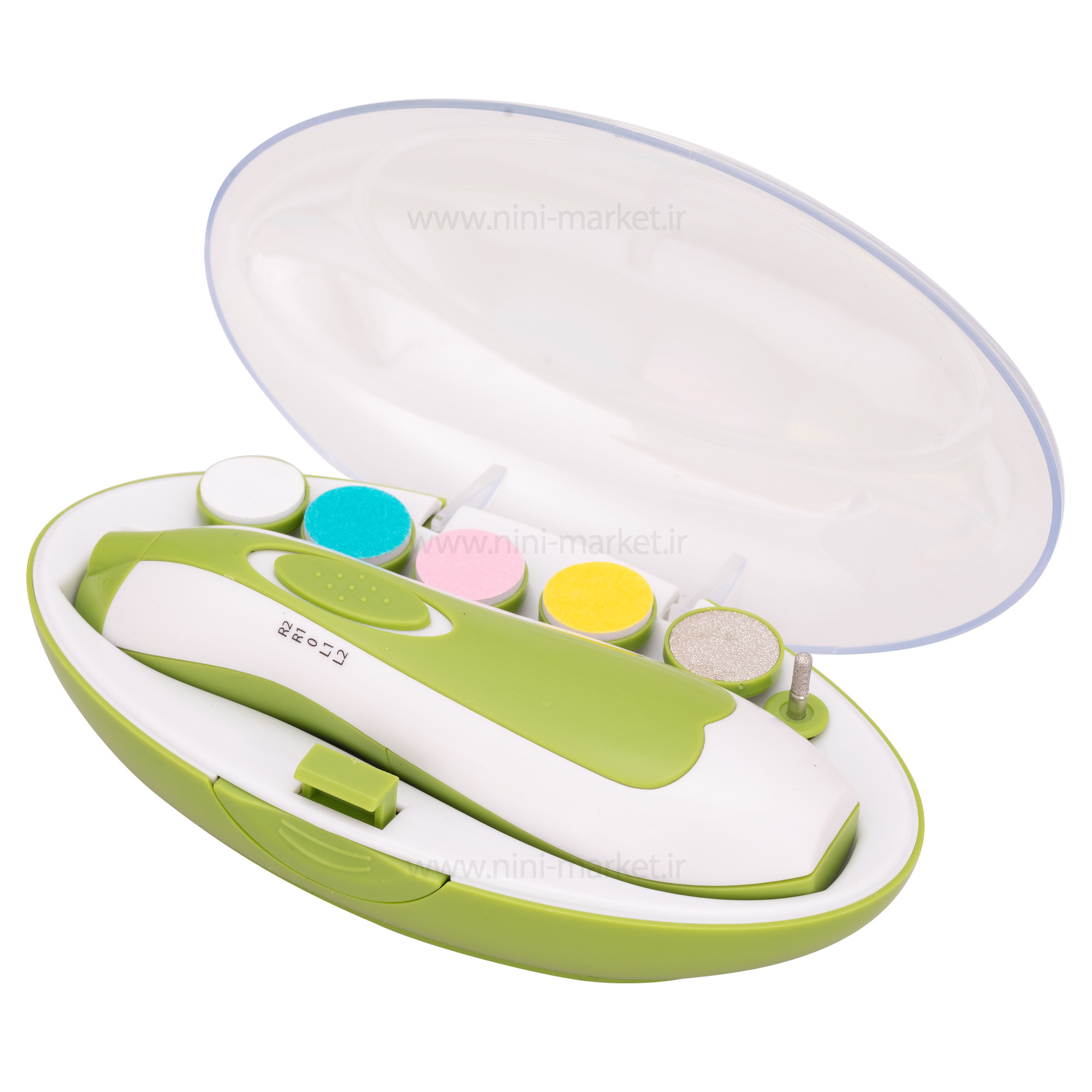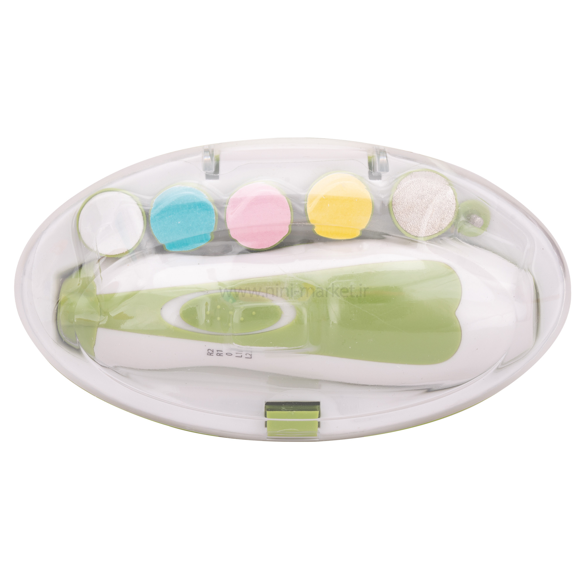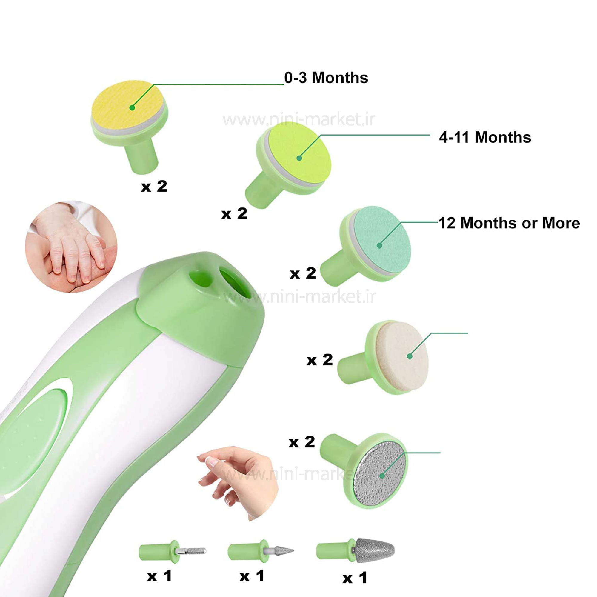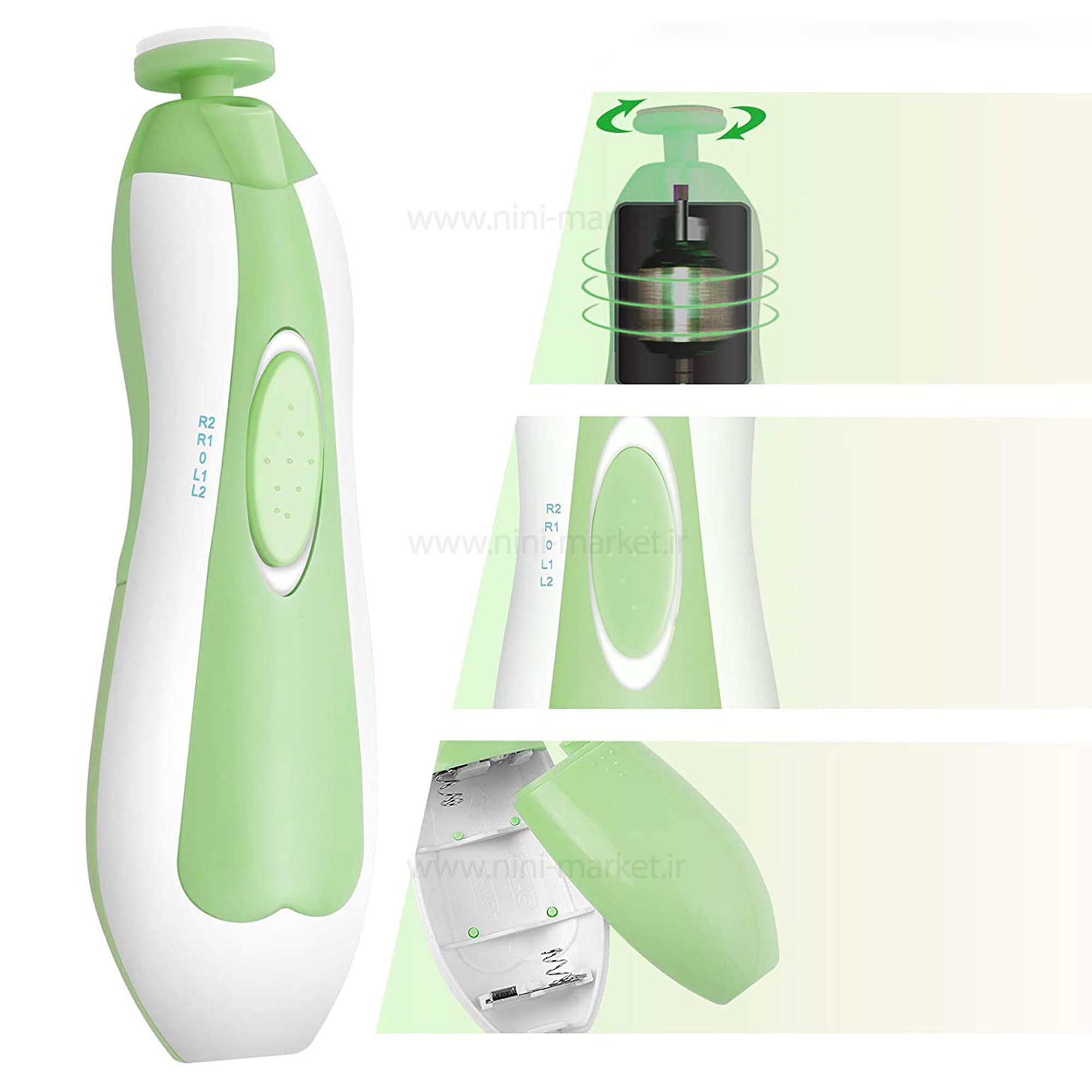 سوهان برقی رنگ سبز برند خارجی مناسب کودکان و بزرگسالان طوری طراحی شده است که می تواند ناخن های ریز و ظریف نوزادان و یا بزرگسالان را به راحتی کوتاه کند و با سوهان آن می توانید ناخن را سوهان کشید و با کشیدن سوهان سر ناخن ها را نرم و لطیف کنید و مانع آسیب دیدن نوزاد به صورت شوید. گرفتن ناخن های کودک با استفاده از روش های مرسوم و ناخن گیر های معمولی می تواند کاری سخت باشد و حتی باعث آسیب رسیدن به انگشتان نوزادان و کودکان شود. سوهان برقی خارجی کودک و بزرگسالان دستگاهی سریع و ایمن برای کرفتن ناخن و پولیش ناخن های کودک است که دیگر خطرات روش های مرسوم را ندارد. شما با استفاده از سوهان برقی میتوانید سرعت و جهت چرخش سری دستگاه را به دلخواه تنظیم کنید. درجه سختی سریهای این دستگاه با توجه به سنین مختلف کودک از نوزادی تا سنین بالاتر درجه بندی شده و در رنگ های مختلف در جعبه محصول قرار گرقته است. در سر این دستگاه LED تعبیه شده تا در نور کم نیز با دقت خوبی بتوان از آن استفاده کرد همچنین این دستگاه صدای کمی تولید می کند (کمتر از۳۵ دسیبل) و به راحتی می توان به هنگام خواب کودک از آن استفاده کرد. این دستگاه از طراحی ارگونومیکی بهره می برد که استفاده از آن را برای والدین بسیار راحت کرده است. همچنین در جعبه این محصول سری زاپاس به تعداد کافی قرار داده شده است. این دستگاه همچنین دارای سری برای بزرگسالان نیز می باشد. متریال استفاده شده در این دستگاه فاقد هر گونه مواد مضر برای کودک از جمله (BPA، Phthalate، Latex) می باشد. بهداشت نوزاد همواره برای والدین از اهمیت بالایی برخوردار است پس واجب است که یک ست بهداشتی با کیفیت برای فرزندتان تهیه کنید که بتوانید آن را به راحتی با خود حمل کنید و به مسافرت ببرید. سوهان برقی خارجی به پدران و مادران جوانی که تجربه کافی برای کوتاه کردن ناخن های نوزاد خود را ندارند کمک می کند تا بدون ترس و نگرانی این کار را انجام دهند. همچنین یک وسیله کاربردی برای بزرگسالان نیز می باشد. در قسمت جلوی دستگاه یک چراغ برای دید بهتر تعبیه شده است.دستگاه به وسیله 2 باطری قلمی کار می کند و چرخش سری های آن از هر دو جهت ممکن می باشد.این کیت ناخن کودک مجهز به پدهای بالشتکی برای بزرگسالان نیز می باشد که برای سایر اعضای خانواده قابل استفاده می باشد. این پک دارای 6 سری سوهان است که 3 مورد مناسب کودکان و 3 مورد هم مناسب بزرگسالان است. پد آبی: مناسب کودکان 3-0 ماه ، پد صورتی: مناسب کودکان 12+ ماه ، پد نارنجی: مناسب کودکان 12-4 ماه ،پد سفید: ناخن های بزرگسالان را جلا می دهد ، پد استوانه ای:مناسب برای شکل دادن به ناخن بزرگسالان ، پد فلزی: جهت از بین بردن کوتیکول ناخن بزرگسالان و لازم به ذکر است دکمه تعبیه شده روی این دستگاه 4 حالت عملکرد متفاوت را به شما ارائه خواهد داد. برای استفاده به سادگی سوهان ناخن مناسب را انتخاب کرده و به دسته موتور متصل نمایید؛ آن را توسط دکمه روشن و استفاده کنید. همین طور به منظور کاهش خطا یک چراغ دارد که کمک می کند راحت تر اضافه های ناخن را جدا کنید.