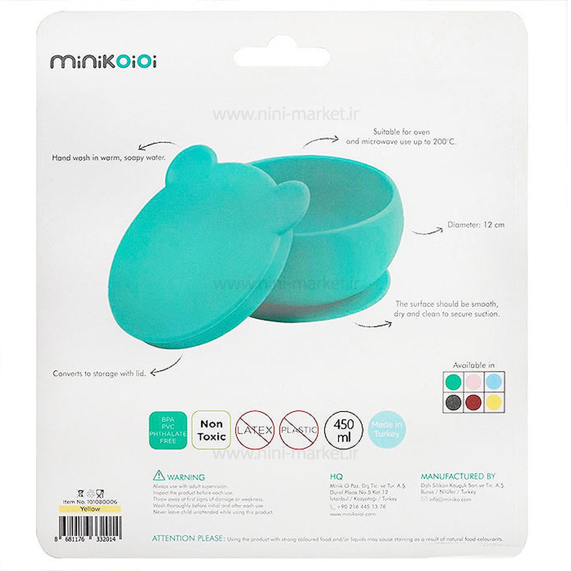 کاسه درب دار سیلیکونی رنگ سبز مینیک اوی اوی Minik Oioi تهیه شده از 100% سیلیکون نرم و خالص ساخته شده است. با داشتن این محصول دیگر نگران واژگونی ظرف غذا بدلیل تکان خوردن و یا بازیگوشی کودک نخواهید بود. کاسه درب دار سیلیکونی Minik Oioi ساخت کشور ترکیه میباشد که با طراحی منحصر بفرد خود، به میز چسبیده و از ریختن غذا بر روی میز یا زمین جلوگیری میکند.با استفاده از این محصول درب دار، دیگر نگرانی بابت کثیف شدن میز، زمین یا لباس کودک خود نخواهید داشت. شرکت مینیک اوی اوی با تولید محصولات فاقد مواد شیمیایی و BPA به فکر سلامت و بهداشت کودک و نوزادان است. کمپانی Minikoioi با نشان استاندار از آمریکا و اروپا سعی دارد که آسودگی خاطر را برای والدین فراهم سازد. جنس ظرف درب دار مینیک اوی اوی از 100% سیلیکون نرم و بادوام ساخته شده است. به همین دلیل ضد حساسیت بوده و هیچ آسیبی به کودک وارد نخواهد کرد. این محصول فاقد مواد شیمیایی و مضر مانند پلاستیک، PVC و BPA است. زیرا بیسفنول آ (BPA) و پلیونیل کلراید (PVC) دو ماده مضر در محصولات پلاستیکی میباشند که ممکن است موجب اختلالات مغزی، تغییرات هورمونی و رفتاری در کودکان شود. کاسه دربدار سیلیکونی دارای طراحی ایمن و ارگونمیک است. زیرا فرم چسبان آن از ریختن غذا به بیرون ظرف و بر روی لباس کودک جلوگیری مینماید. کودکان به علت تکان خوردن و بازیگوشی ممکن است غذا روی خود بریزند و کثیف شوند. کاسه سیلیکونی مینیک اوی اوی این قابلیت را دارد تا با پایه چسبنده خود به سطوح مختلف بچسبد تا ظرف غذا روی میز واژگون نشود. همچنین دارای ساختاری سبک و قابل حمل برای گردش و سفر میباشد. این محصول با داشتن درب محافظ میتواند باقیماندهی غذا داخل خود را در یخچال نگهداری کند و از ورود آلوگی به داخل ظرف سیلیکونی جلوگیری نماید. همچنین مدل دربدار آن فاقد نشتی است و به راحتی میتوان آن را داخل کیف قرار داد. کاسه دربدار سیلیکونی مناسب برای کودکان 6 ماه به بالا میباشد. کاسه چسبان و سبک مینیک اوی اوی قابل استفاده در مایکروویو (تا دمای 200 درجهی سانتیگراد) است. همچنین دارای طراحی درب جذاب آن به شکل خرس میباشد.