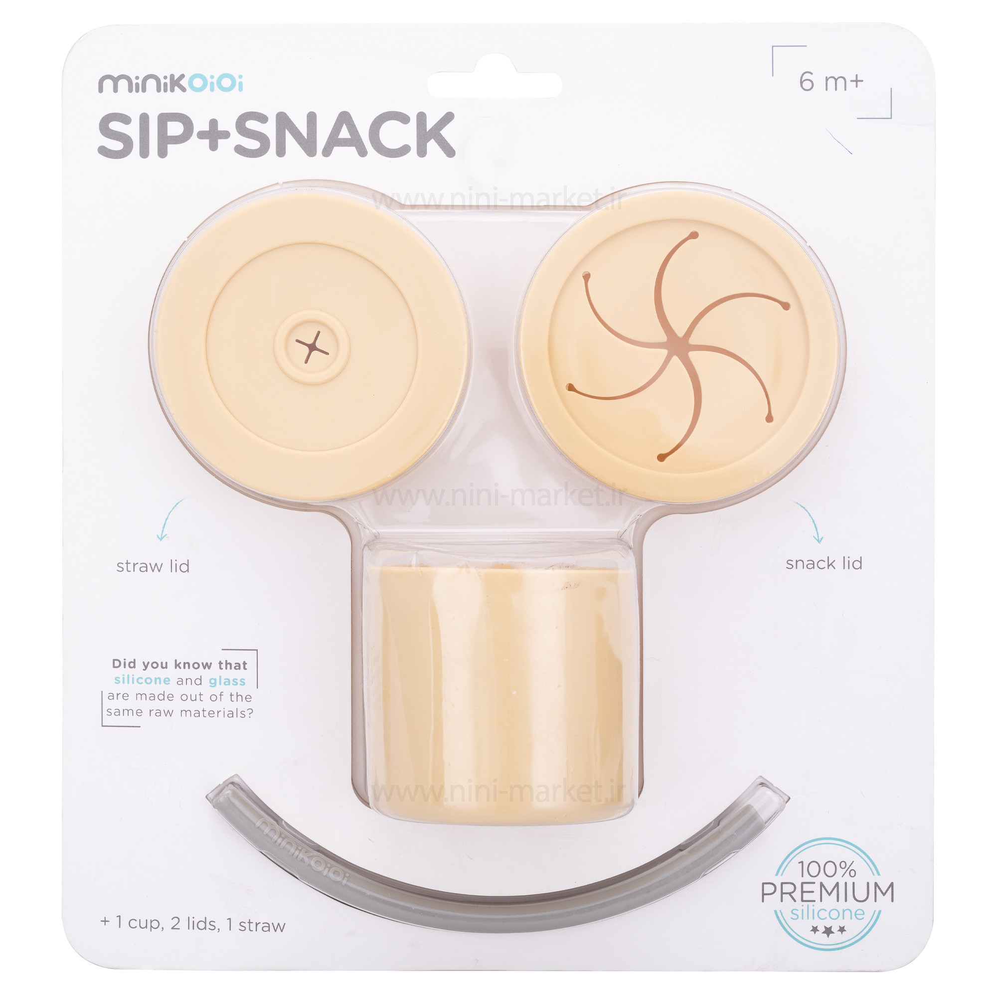 لیوان دو کاره سیلیکونی رنگ زرد مینیک اوی اوی Minik Oioi از سیلیکون 100٪ درجه مواد غذایی ساخته شده است. لیوان دوکاره مینیک اوی اوی MinikOiOi به صورت دومنظوره طراحی شده است. درصورت قرار گرفتن درپوش اسنک خوری بر روی لیوان ، میتوانید خوراکی های جامد ریز را داخل آن ریخته و به کودک بدهید. کودک میتواند به راحتی دست خود را داخل آن کرده و خوراکی ها را بیرون بیاورد و میل نماید. همچنین با قرار گرفتن درپوش مخصوص نگهداری نی و عبور نی از داخل سوراخ روی آن از این محصول به عنوان لیوان نی دار استفاده نمایید. به راحتی تمیز می شود و ضد لک و بدون باکتری است.