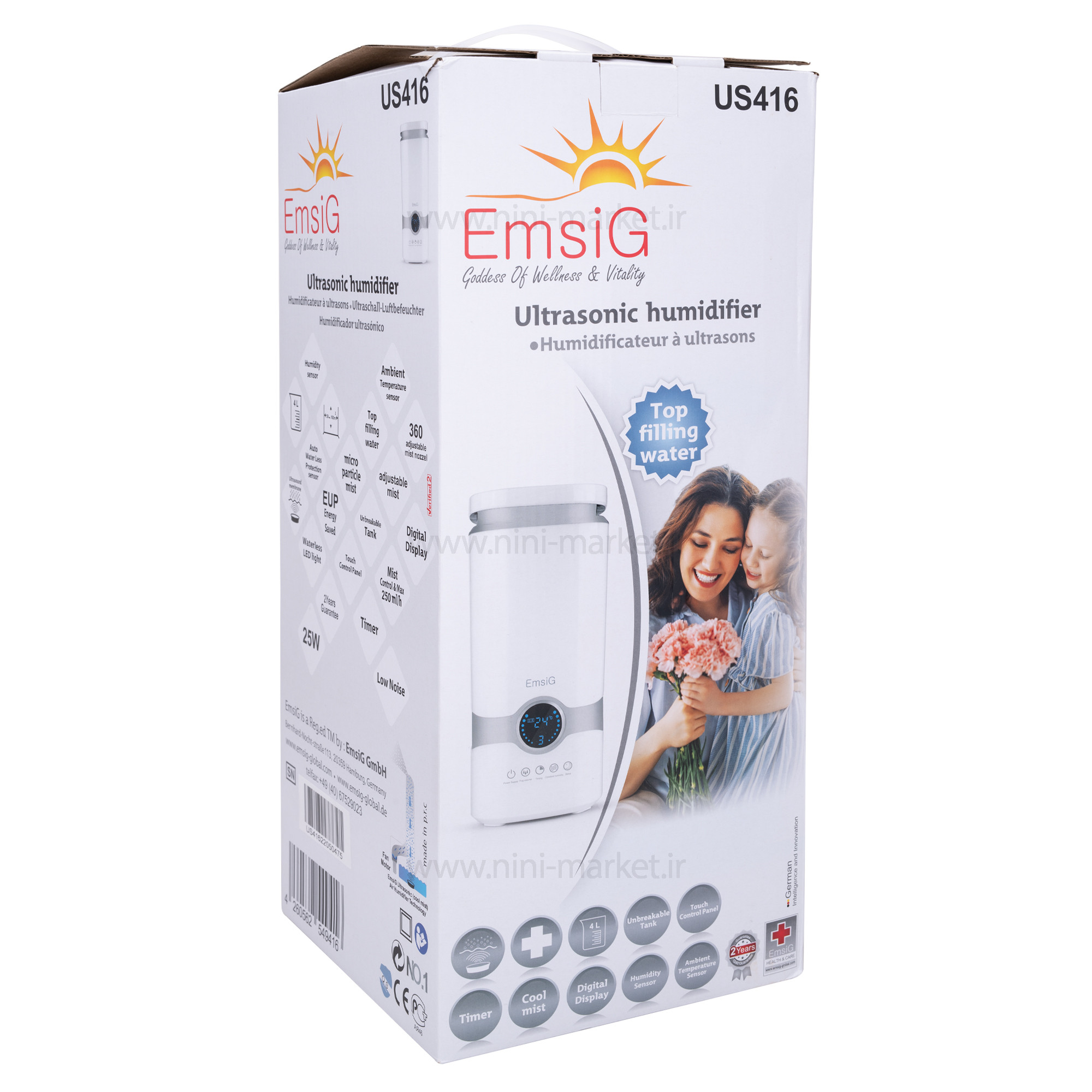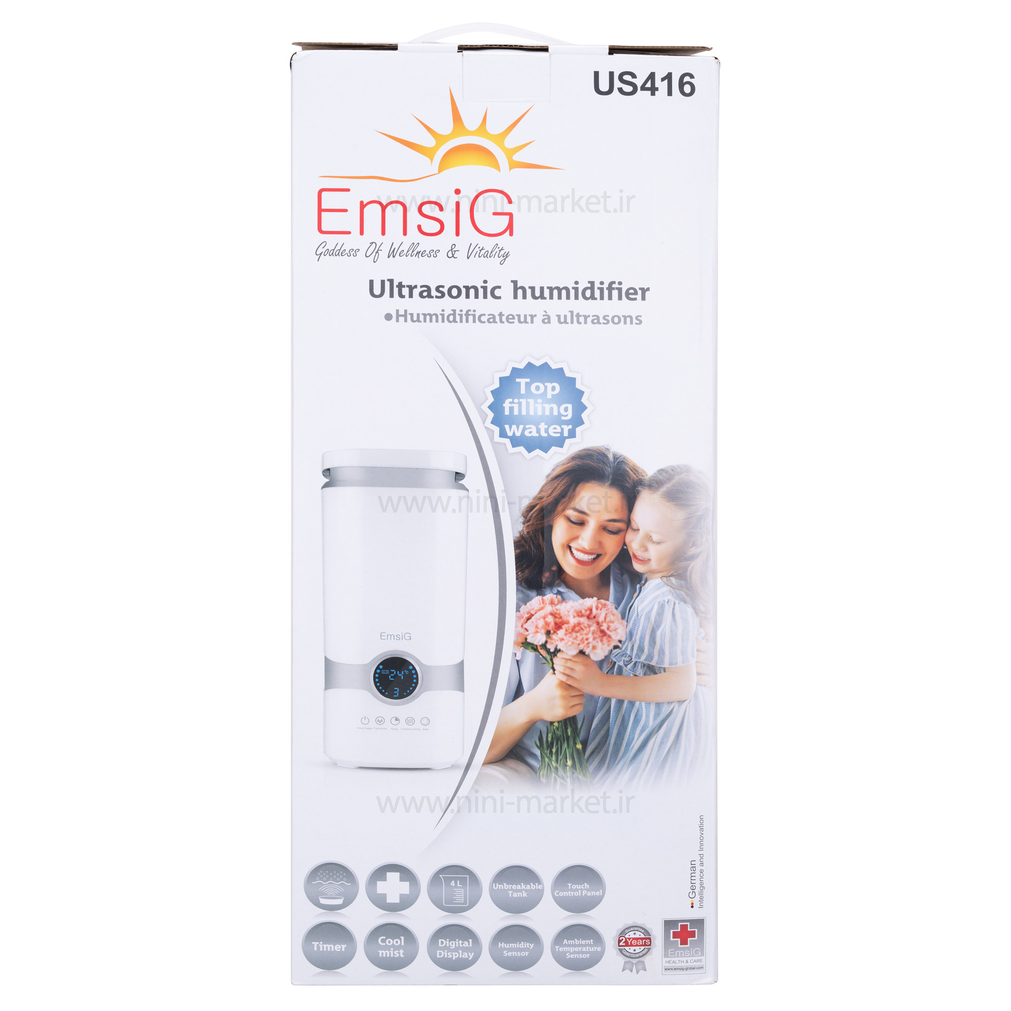دستگاه بخور سرد التراسونیک 4.2 لیتر رنگ سفید امسیگ Emsig به مطبوع کردن هوای محیط شما کمک میکند. وجود هوای خشک در تمامی فصول می تواند مشکلات زیادی را برای شما به وجود آورد. از این رو بهترین گزینه استفاده از دستگاه بخور برای تامین رطوبت مورد نیاز محیط شما می باشد. دستگاه بخور سرد امسیگ مدل US416 از آخرین تکنولوژی اولتراسونیک برای تولید رطوبت محیط استفاده می کند. این دستگاه بخور برای محیط خانه، درمانگاه و بیمارستان و فروشگاه مناسب خواهد بود. رو بدنه دستگاه کلید تنظیم بخار وجود دارد و نوع بخور آن سرد است. این دستگاه دارای مخزن آب بوده و ظرفیت این مخزن آب 4 لیتر است. توان مصرفی در این دستگاه 25 وات است و منبع انرژی آداپتور برق خواهد بود. دستگاه بخور US416امسیگ دارای صفحه نمایش لمسی بوده و نازل خروجی 360 درجه است. عملکرد این دستگاه بخور سرد بی صدا بوده و اگر مدام در اتاق شما باشد مزاحمتی برایتان به وجود نمیآورد.مخزن دستگاه بخور از بالا بدون جداسازی (Top Filling) پر میشود. زمان سنج دارد. حسگر کمبود آب و قطع خودکار داشته، سنسور سنجش رطوبت و سنسور دمای محیط. هم دارد. سیستم اولتراسونیک به گونه ای است که دستگاه پس از روشن شدن، آب داخل مخزن را با ارتعاشات فراصوت به ذرات ریز تبدیل کرده و به صورت بخور خارج می کند. خشکی هوای محیط تنفسی شما می تواند منجر به بروز مشکلات تنفسی و پوستی گردد. خشکی هوا موجب خشکی پوست، خشکی گلو، مجاری تنفسی و سینوس ها و بینی می گردد. برای پیشگیری و رفع این موارد استفاده از بخور الزامی می باشد. بخور سرد امسیگ مدل US416 قابلیت پر کردن آب از بالای مخزن را دارد، همچنین مخزن این دستگاه نشکن می باشد. صفحه لمسی و نمایشگر دیجیتال از دیگر ویژگی های این دستگاه می باشد. یکی از مزیت های استفاده از دستگاه بخور سرد امسیگ مدل US416 قابلیت نمایش میزان دما و میزان رطوبت محیط می باشد. وجود رطوبت (بین 40 تا 50 درصد) در هوای تنفسی شما به همان اندازه که می تواند مفید باشد، اگر بیش از میزان نیز باشد تاثیرات منفی زیادی به همراه دارد. از این رو نمایش میزان رطوبت محیط می تواند به شما کمک کند تا از دستگاه بخور به صورت مثبت استفاده نمایید.