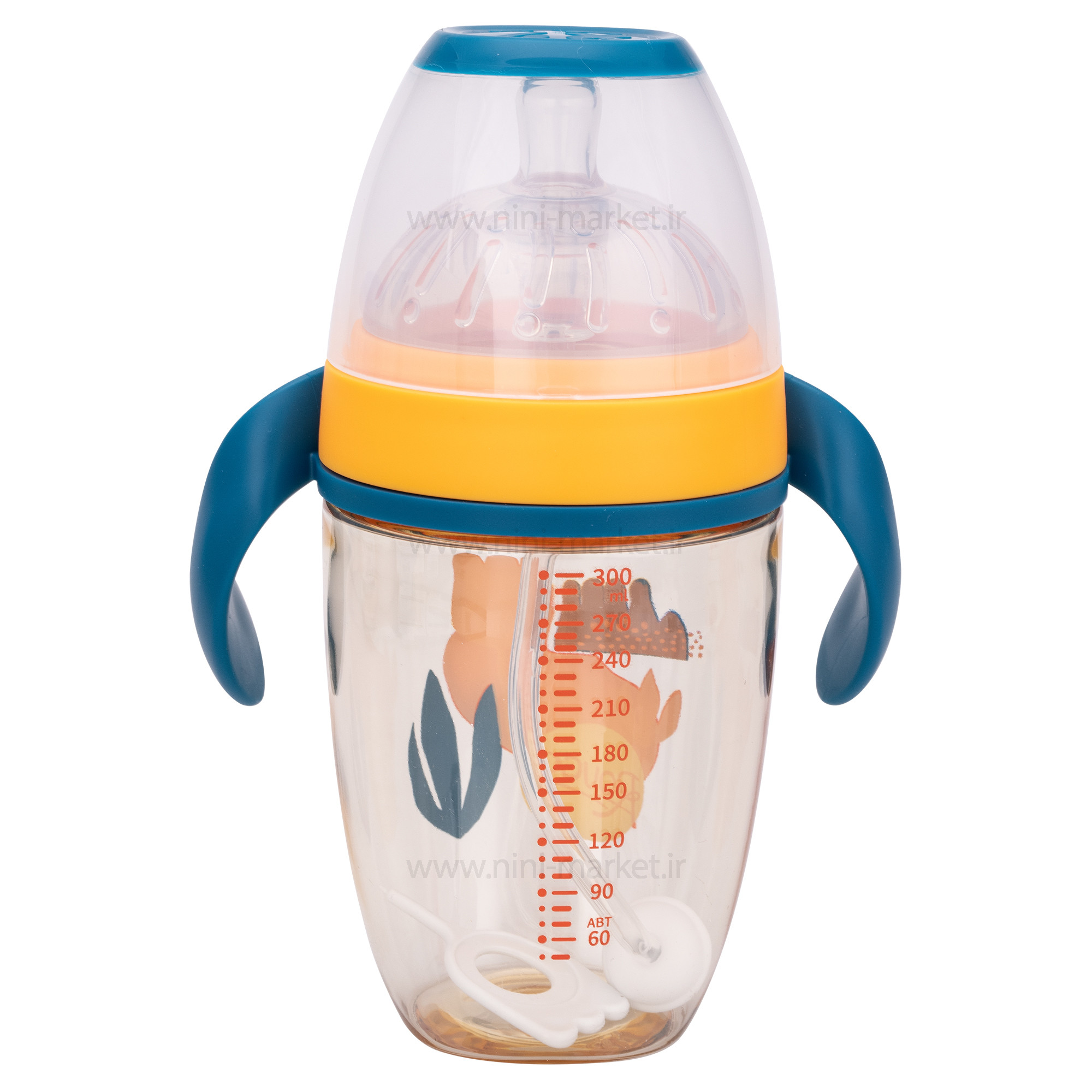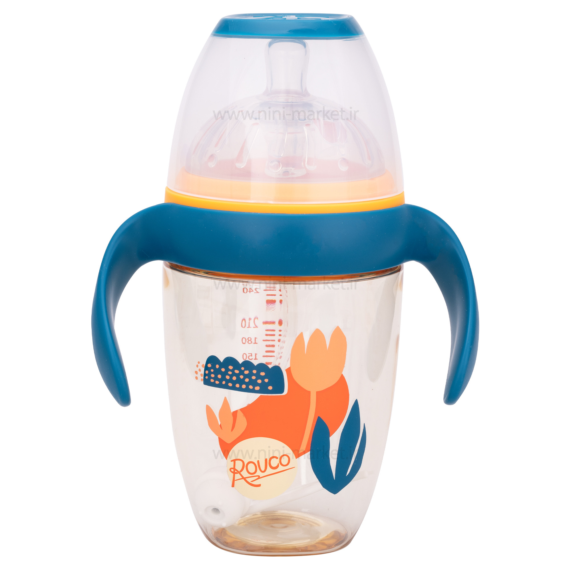 شیرخوری دسته دار 330 میل رنگ سرمه ای نارنجی رووکو Rovco مناسب برای استفاده همزمان تغذیه با شیر مادر (سینه مادر) که مناسب برای کودکان 9ماه به بالا است . جنس بدنه تهیه شده از تریتان شفاف که ضد خش و نشکن میباشد که بدون هیچ نگرانی ندارید بعد از این که از دست کودک رها شد و زمین افتاد چون بسیار باکیفیت و مقاوم است. همچنین این محصول دارای دسته های ارگونومیک که به راحتی کودک میتواند آن را درست بگیرد و شیر را میل کند. یکی مهم ترین ویژگی های شیر خوری رووکو سرشیشه آن است که سری سیلیکونی پهن که شبیه سازی بسیار زیاد به سینه مادر دارد . ایده آل برای سفرهای در حال حرکت یا کوتاه هم همراه خود برد. دسته به گونه ای طراحی شده است که برای محافظت از مچ کودک قابل چرخش باشد. به لطف دهانه گشاد شیر خوری روکو می توان به سرعت تمیز و پر کرد و به شما در صرفه جویی در زمان کمک می کند. دارای نی 360 درجه که باعث نوشیدن راحت تر و تا آخرین قطره است، می باشد. همچنین دسته ها را می توان آزادانه چرخاند. این بر استفاده از کودک تأثیری نخواهد گذاشت. نی آب توپ گرانشی به کودک کمک می کند بدون توجه به نشستن، دراز کشیدن یا دراز کشیدن روی شکم از نوشیدن آب لذت ببرد، پایه پهن نوک پستان به بچه ها کمک می کند دهان خود را باز کنند و به راحتی میل کند. این نیز برای جلوگیری از تماس لب های بچه ها با کلاه در هنگام اتصال است. کودک می تواند یک مهر و موم قوی روی سیلیکون ایجاد کند تا به طور موثرتری مکیدن کند. روی شیر خوری درجه بندی وجود دارد، شما می توانید به وضوح ببینید که کودک شما چقدر آب نوشیده است.