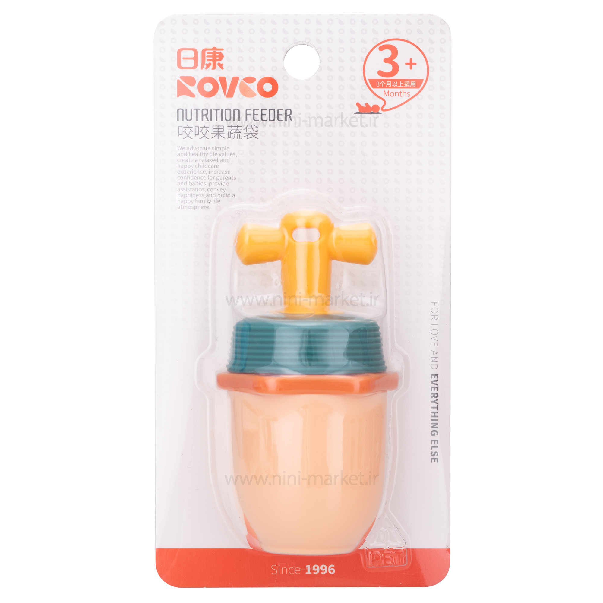 پستانک میوه خوری سیلیکونی پیچی رنگ نارنجی رووکو Rovco یک محصول مناسب برای دادن انواع میوه ها و خوراکی های خوشمزه به نوزاد می باشد . پستانک میوه خوری سیلیکونی پیچی Rovco ساخت کشور چین است. پستانک ميوه خوری سری سیلیکونی بسیار نرمی دارد و کاملا متناسب با دهان و لثه كودک می باشد. این پستانک میوه خوری را می توان با انواع میوههای تکه تکه شده و سبزیجات پر کرد و درب آن را به صورت پیچی بست. پستانك میوه خوری رووکو، به کودک کمک میکند تا بتواند با لذت و به راحتی آبمیوه اش را به صورت طبیعی بخورد و پدر و مادر نیز ترس و نگرانی بخاطر بلعیدن و گیر کردن تکههای میوه در گلوی کودک نداشته باشند.پستانک میوه خوری رووکو کیفیت ساخت خوبی دارد و فاقد مواد مضر شیمیایی است. مکیدن میوه خوری در تقویت لثه نوزاد و رویش بهتر دندان های کودک کمک کننده خواهد بود. پستانک دارای درب محافظ پلاستيكی برای جلوگیری از آلوده شدن سری است. این پستانک غذاخوری دارای یک دسته پلاستیکی است که از لحاظ کیفیت در سطح بالایی قرار میگیرد. به علت زیبایی و رنگبندی مناسبی که پستانک غذاخوری رووکو دارد موجب می شود کودکان با استفاده از این پستانک میوه خوری ترغیب و جذب بشوند. قبل استفاده از پستانک آن را ضد عفونی کنید. همچنین پس از هربار استفاده آن را به خوبی بشویید و استریل نمایید.