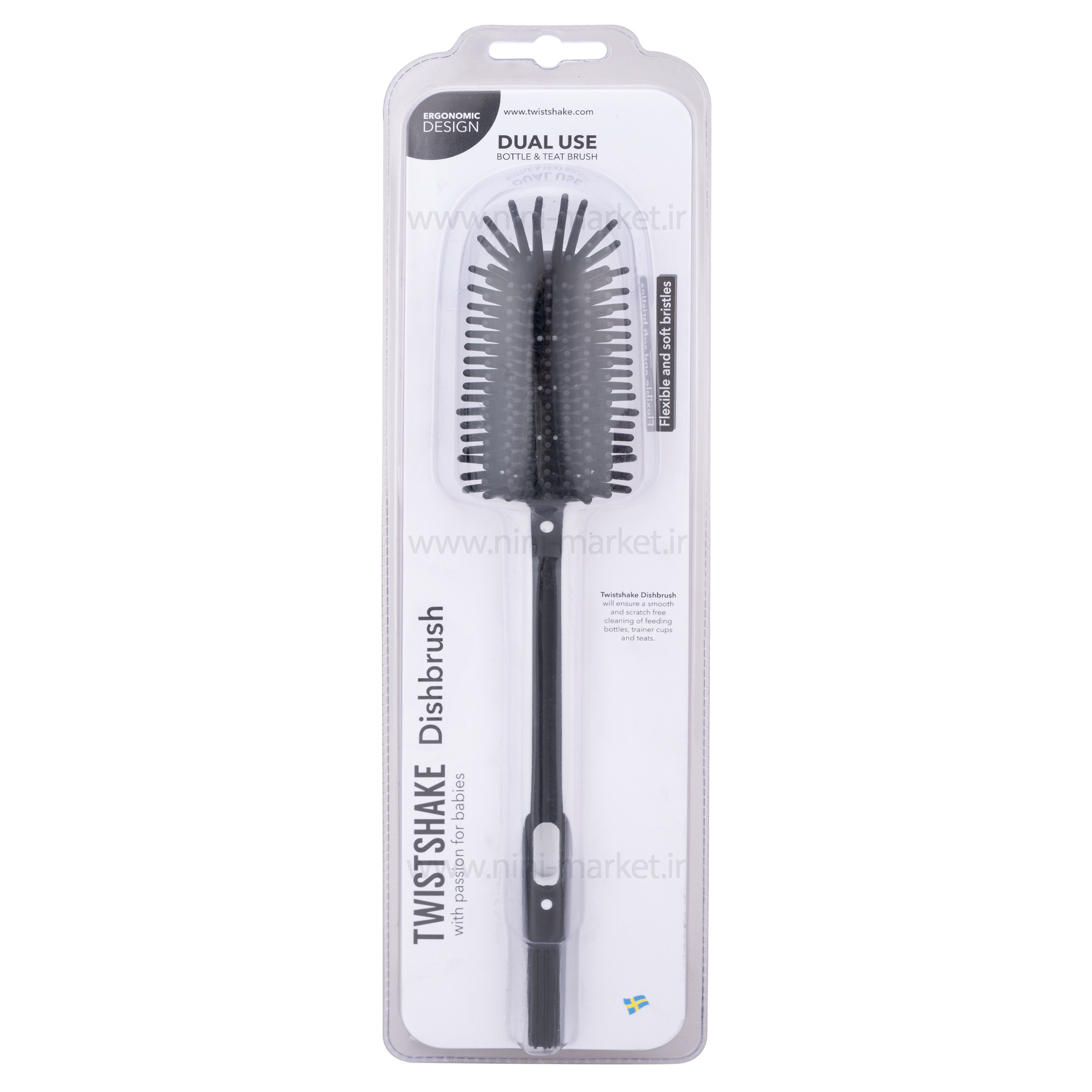 برس شیشه شور رنگ مشکی تویست شیک Twistskake با جنس نرم و سیلیکونی خود به راحتی هر شیشه شیر و لیوانی را میشوید بدون اینکه کوچکترین خط و خشی را روی آنها بیاندازد. برس شیشه شور تویست شیک دارای یک فرچه ی سیلیکونی نرم برای شستشوی شیشه شیر است. قسمت انتهایی این برس شیشه شور مخصوص تمیز کردن سرشیشه است. الیاف برس این شیشه شور از جنس سیلیکون نرم و شیشه شیر نوزاد را کامل تمیز می کند. این محصول دارای دسته ی راحت برای به دست گرفتن توسط مادر است .این برس از جنس سیلیکون نرم و منعطف است. شیشه شور های معمولی از جنس پلاستیکی هستند و بعد از مدتی استفاده شکل خود را از دست می دهد. همچنین باعث ایجاد خط و خش بر روی شیشه می شود و در تهایت باعث خراب شدن شیشه و کدر شدن آن می شود. برس شیشه شور تویست شیک دارای جنس سیلیکون ضد خش است که باعث دوام و ماندگاری بیشتر شیشه و لوازم غذاخوری کودک می شود. جنس بسیار نرم برس کمک می کند به بهترین حالت و به راحتی شیشه را بشورید. همچنین در انتهای برس، دارای برس کوچک برای شسشتن سرشیشه نیز دارد.برس شیشه شور تویست شیک دارای دسته با انداره مناسب است و در دست گرفتن آن را برای شما آسان می کند. طراحی ارگونومیک آن کمک می کند تا آن را برای تمام شیشه شیرهای برندهای چیکو، اونت و تئویست شیک و .. استفاده کنید. لازم به ذکر است برای شیشه شیرهای دهانه باریک مانند دکتر براون، قابل استفاده نمی باشد. همچنین فاقد مواد مضر شیمیایی و بیسفنول ( BPA ) قابلیت شستشو با دست و در طبقه بالای ماشین ظرفشویی را نیز دارد. بهتر است بعد از استفاده، آن را کاملا بشورید و خشک کنید. برای شستشو از آب جوش استفاده نکنید و در طبقه پایین ماشین ظرفشویی نیز نگذارید، زیرا باعث تغییر فرم و شکل اولیه اش می شود.