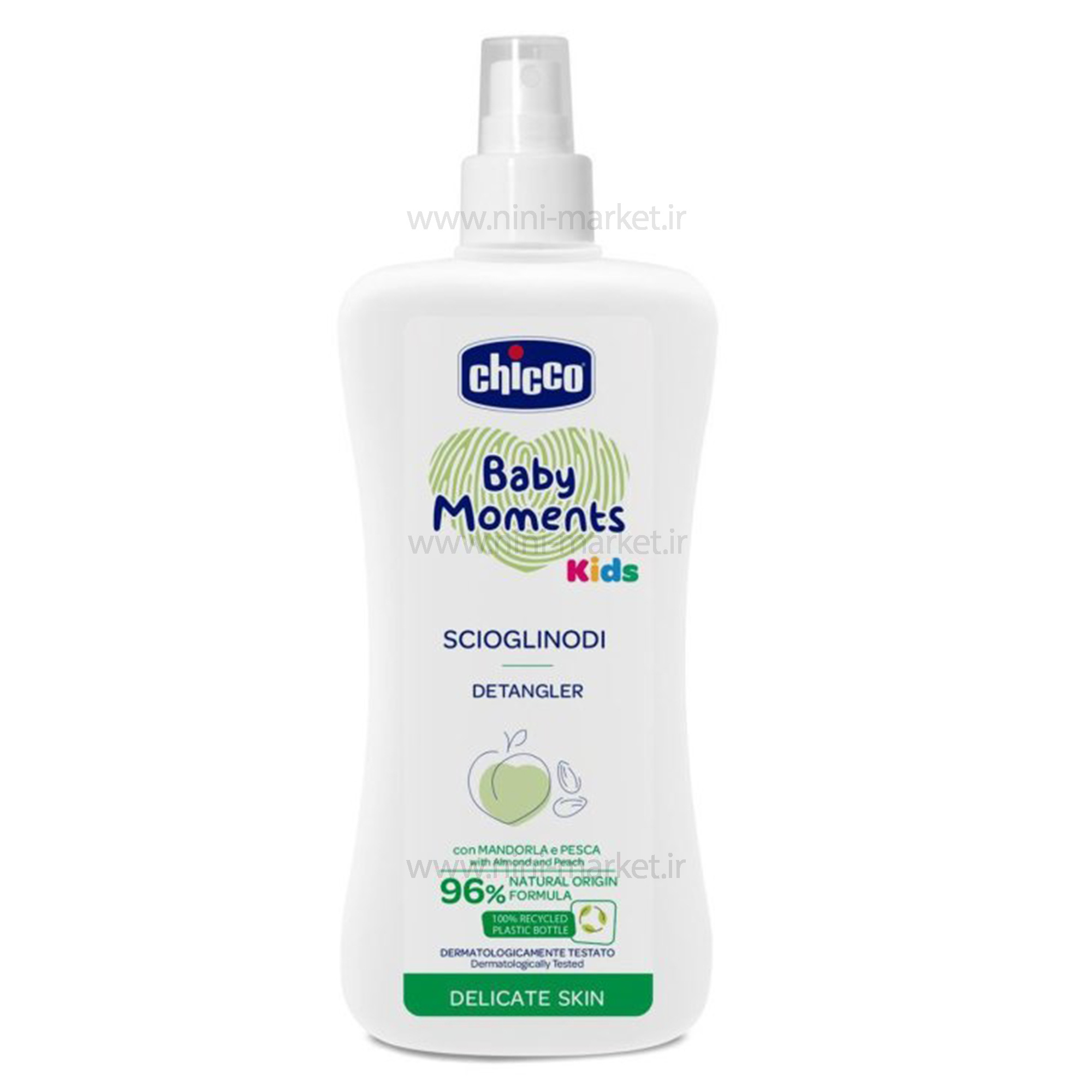 اگر در شانه کردن و بازکردن گره موهای کودک مشکل دارید، اسپری گره بازکن ۲۰۰ میل برند چیکو Chicco راهحل شماست. این اسپری، مناسب بازکردن گره موهای فر و انواع دیگر مو می باشد. این محصول چیکو از ۹۶ درصد مواد گیاهی و طبیعی تولید شده است. اسپری گره بازکن chicco فاقد الکل، پارابن، رنگ و سدیم لوریل سولفات (SLS)می باشد. این محصول ضد حساسیت و مناسب با پوست حساس کودک تولید گردیده است. از ویژگیهای حائز اهمیت این اسپری گره بازکن، عدم تست حیوانی آن است. از جمله مواد طبیعی این اسپری، میتوان به عصاره هلو و بادام اشاره کرد که سبب نرمی و لطافت مو و عدم موخوره و خشکی مو میشود.