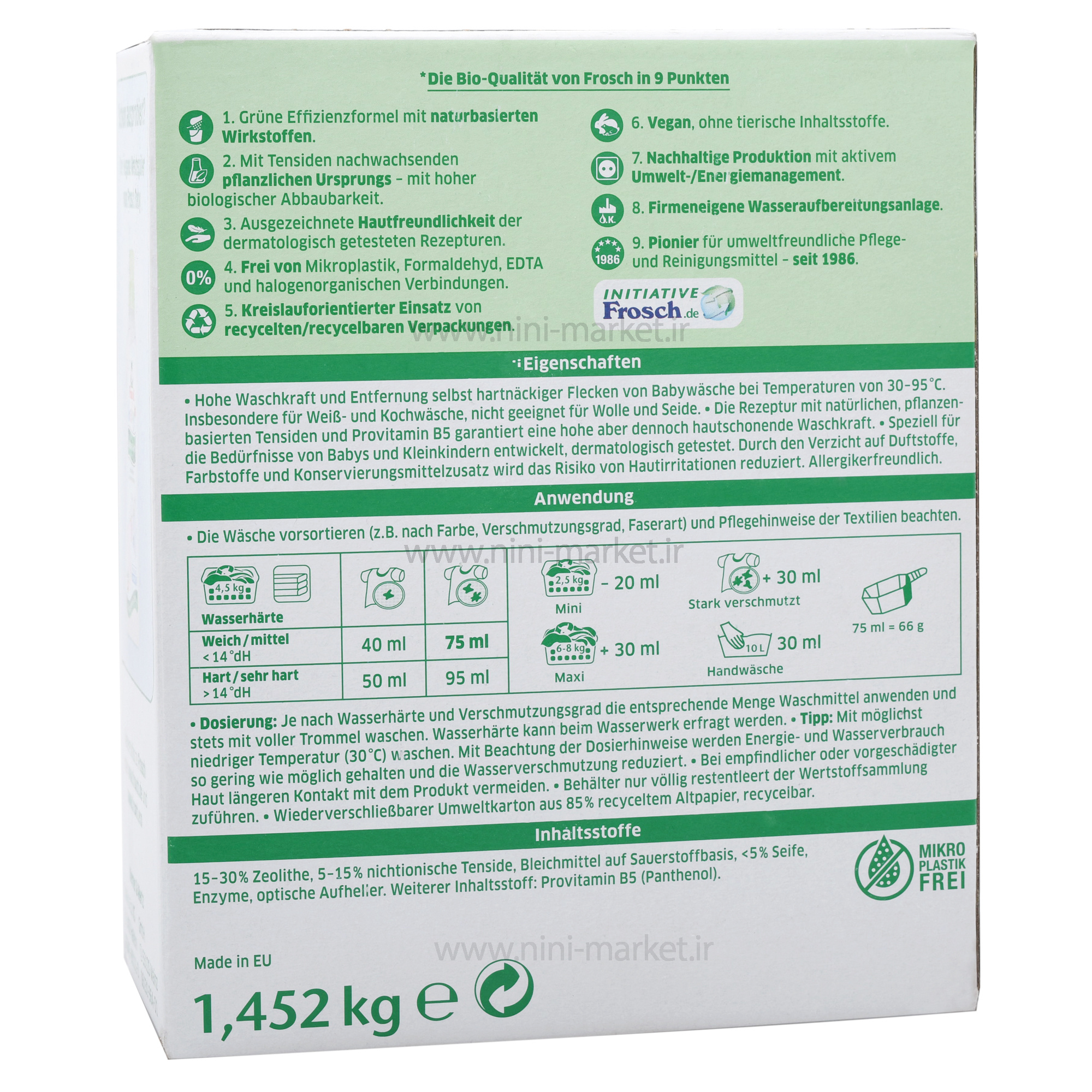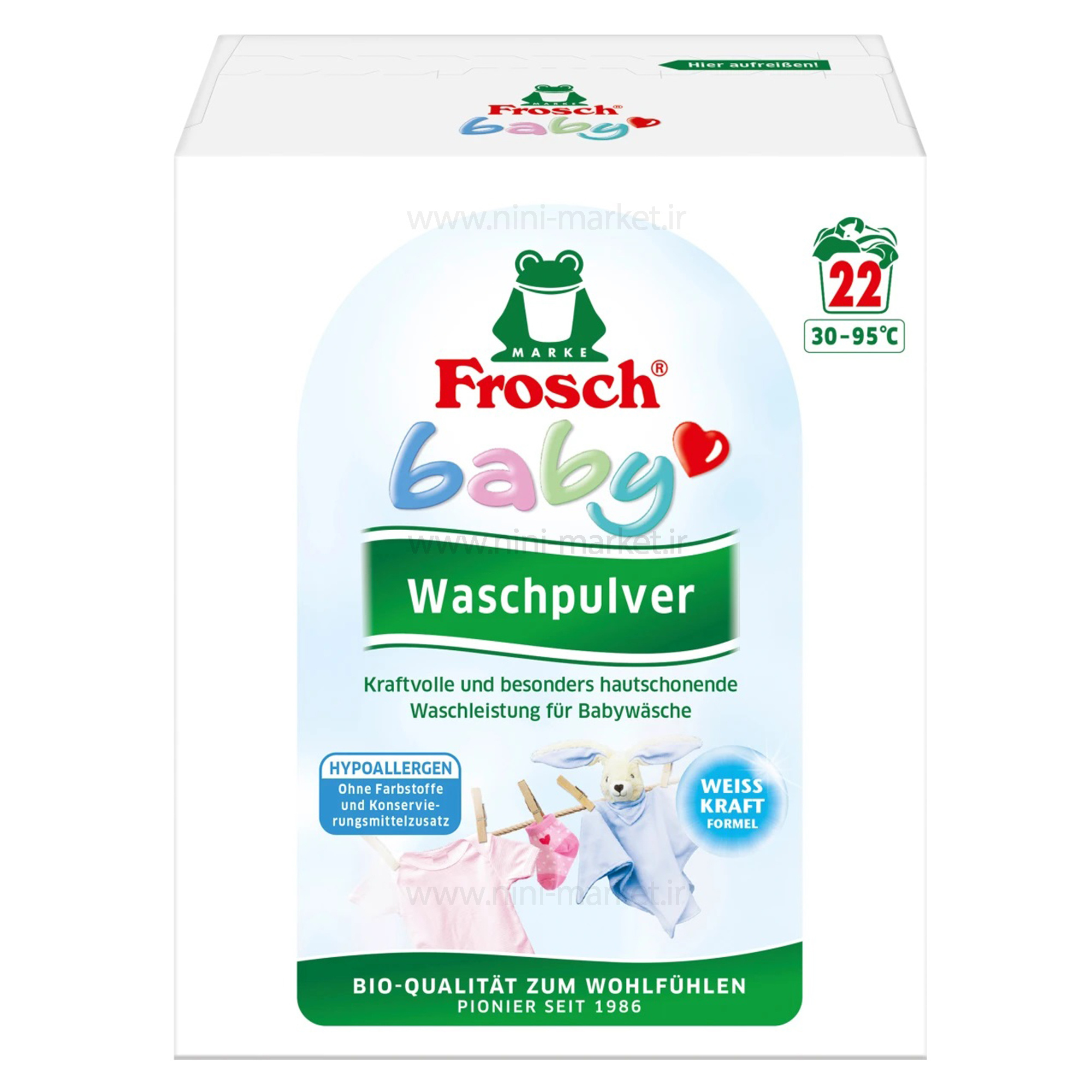 پودر لباسشویی لباس کودک فرووش Frosch اصل آلمان حجم ۱۵۲۸ گرم محصولی ارگانیک بدون ترکیبات شیمیایی از شرکت آلمانی فرووش FROSCH پودر شوینده لباس کودک فرووش frosch باقدرت شستشوی بالای خود برای لباسهای سفید و رنگی در دمای ۳۰ تا ۹۵ درجه متناسب میباشد. فرمولاسیون ضد حساسیت پودر لباس بچه فرووش حاوی پرو ویتامین B۵ و فاقد رنگ و عطر و مواد نگهدارنده میباشد. شوینده لباس بچه فرووش برای پوست حساس نوزادان، کودکان و مبتلایان به آلرژی پوستی بسیار ایدهآل میباشد. پوست ظریف کودک که در معرض آسیبهای جدی از قبیل آلرژی، اگزما و خشکی میباشد