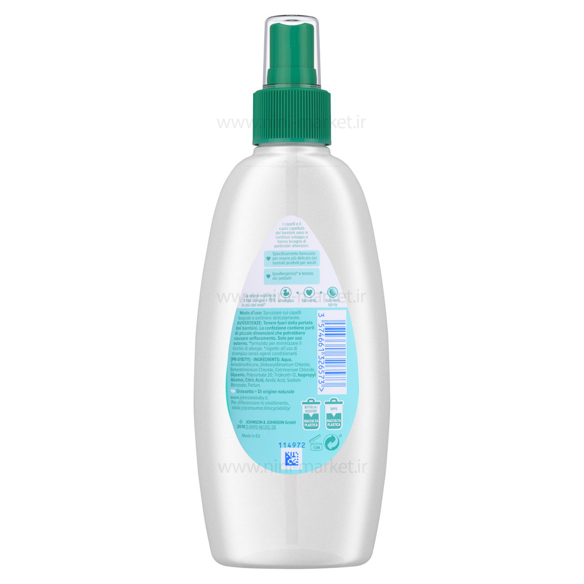 اسپری گره باز کن رنگ سبز جانسون Johnsons دارای حجم 200 میل محصولی ایده آل برای باز کردن گره موی کودکان و نرم و لطیف نگه داشتن آن است. محصول متناسب با پوست و موی سر نازک و لطیف کودکان طراحی شده است. موی کودکان مخصوصا اگر بلند یا فر باشد به دلیل نازک بودن تارهای مویشان در اکثر مواقع گره خورده و شانه زدن و آراستن آن بی قراری کودک عزیزمان را در پی دارد؛ درد کشیدن و گریه فرزندمان می تواند دلخراش ترین صحنه ممکن باشد مخصوصا وقتی می خواهیم همیشه همگان او را آراسته و منظم ببینند. این اسپری جانسون از انواع پروتئین های گیاهی و طبیعی غنی شده و برای تغذیه و رشد موهای کودک ایده آل است . رایحه دلپذیر و خوشایند این محصول موها را خوشبو کرده و طراوت و شادابی خاصی به آن ها می بخشد. محصول دارای عصاره آرگان بوده و نرمی و لطافت موها را افزایش می دهد. در نتیجه شانه پذیری و حالت دادن به موهای کودک آسان تر می شود . قدرت درخشان کردن موها یکی دیگر از ویژگی های خوب این محصول است که پس از استفاده جلوه ای زیبا و تاثیرگذار روی موها به ارمغان می آورد. این اسپری متناسب با پوست و موی لطیف و نازک کودکان طراحی و فرمولیزه شده بطوری که نه تنها باعث آسیب به موی کودکان نمی باشد با حذف مواد مضر مانند سولفات ، مواد رنگی ، سیلیکون و پارابن باعث نرمی و لطافت بیشتر موی کودکان میشود.