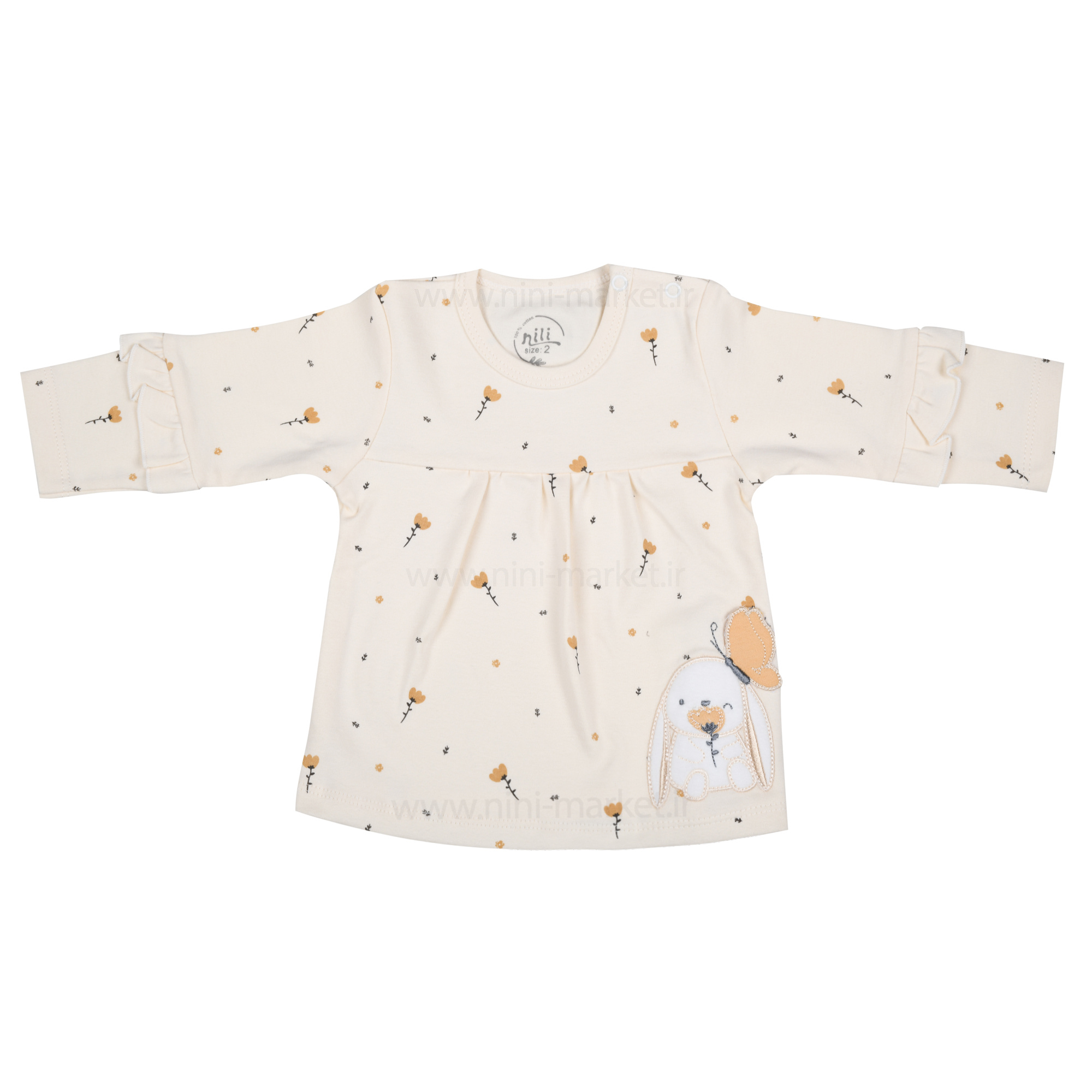 بلوز آستین بلند طرح مرلین رنگ نباتی برند نیلی Nili جنس از الیاف پنبه بوده و بسیار نرم و لطیف است و نوزاد با آن حس خوب دارد و در آن احساس راحتی میکند. الیاف از پنبه درجه یک تهیه شده است و مادران با خیال راحت میتوانند این محصول را برای فرزند خود تهیه کنند. رنگ بلوز آستین بلند طرح مرلین نباتی با طرح گل میباشد که روی قسمت پایین لباس طرح یک خرگوش و پروانه بهصورت تک دوزی وگلدوزی درآمده که همچنین روی آستین لباس با چین سوزنی ریز تزئین شده است. در یک سمت سرشانه بلوز دو دکمه وجود دارد و مادر میتواند بهراحتی آن را تن نوزاد کند.