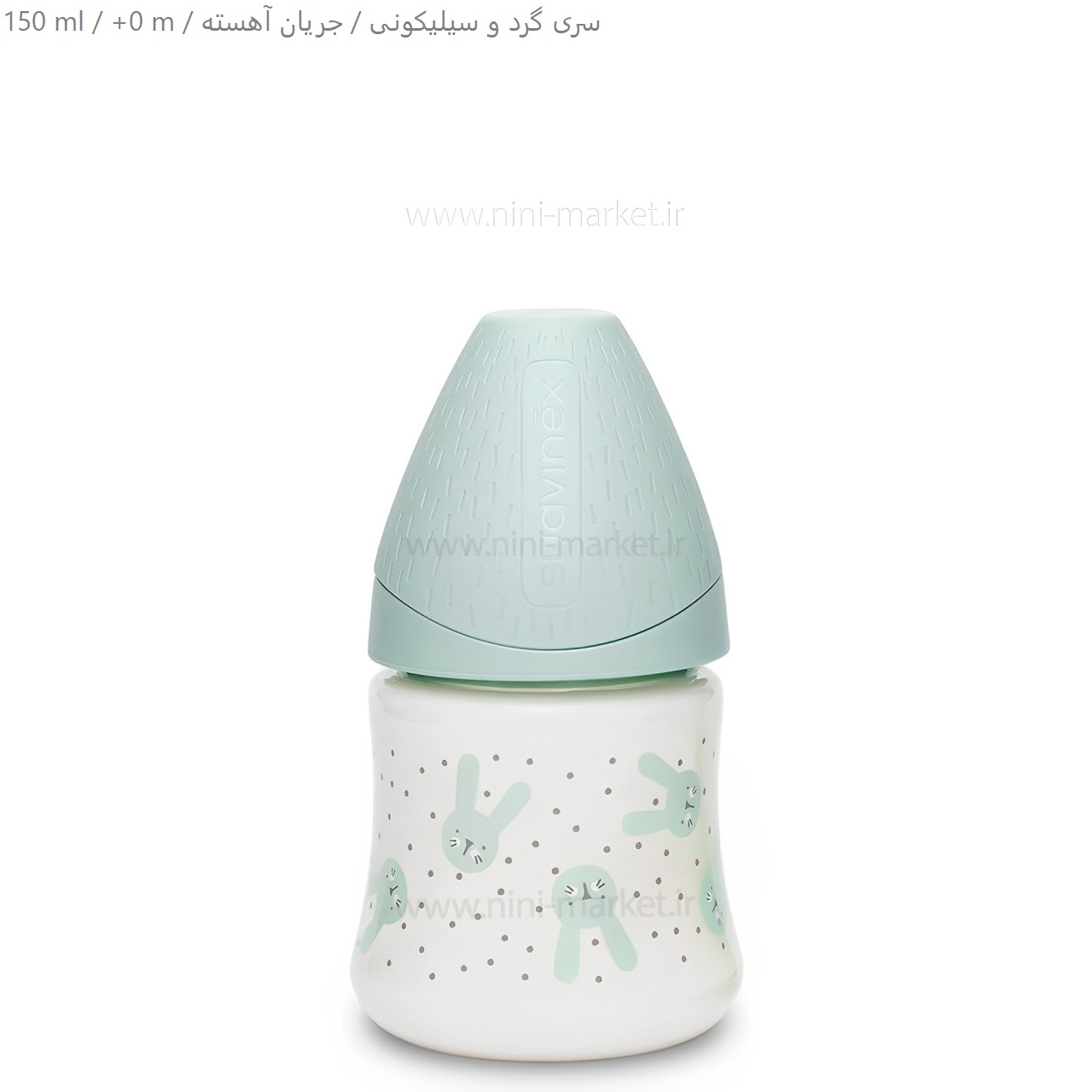 3. شیشهشیر 150 میلیلیتر مناسب برای نوزادان تازه به دنیا آمده. سری این شیشهشیر گرد و سیلیکونی است. این سری دارای جریان آهسته است و برای شیر مناسبتر است. این شیشهشیر دارای سیستم آنتی کولیک و ضد نفخ است.