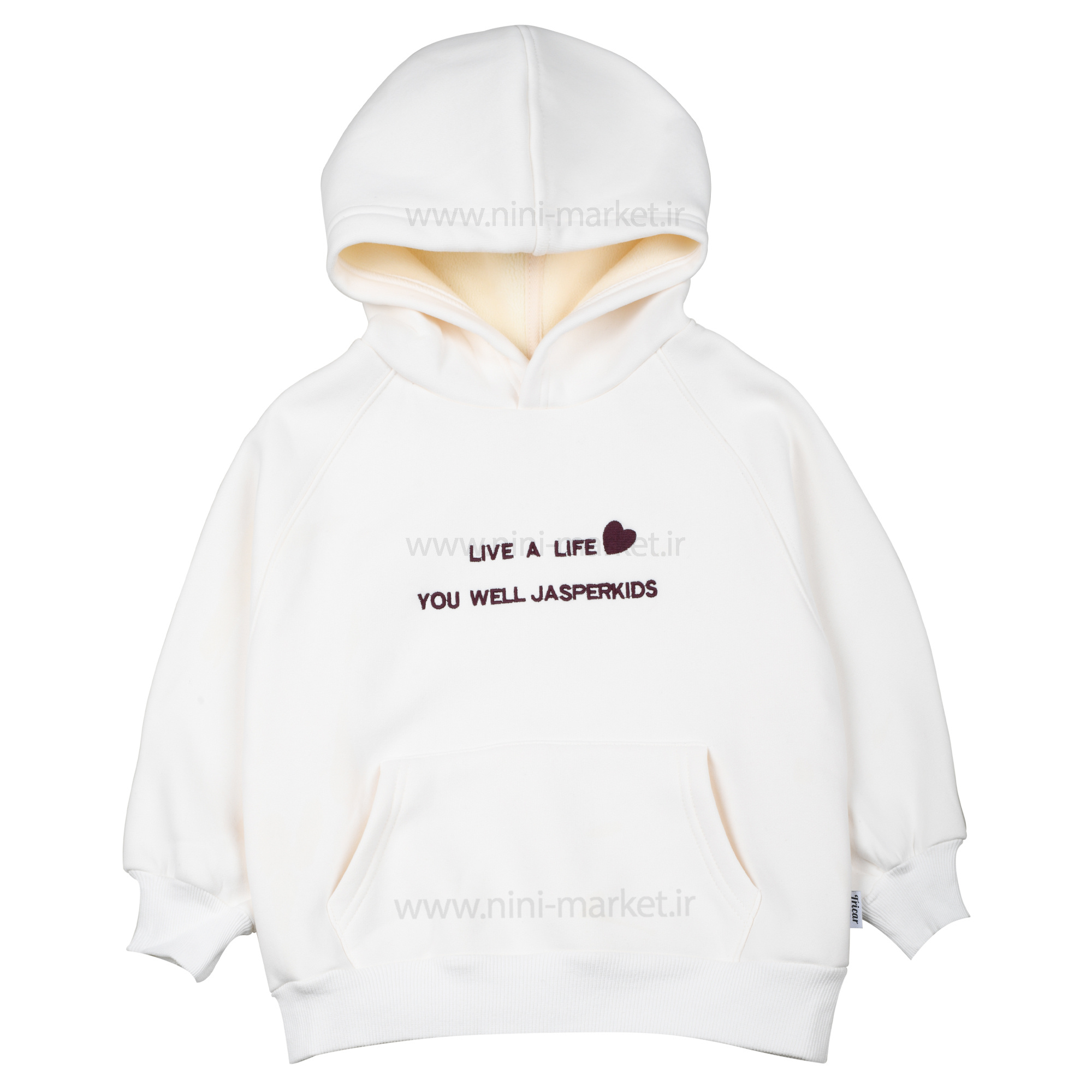 هودی داخلکرک اسپرت طرح لاتین رنگ شیری مناسب برای پاییز و زمستان. این هودی به دلیل داخل کرکی بودنش کودک شمارا در هوای سرد، گرم نگه میدارد. همینطور کشبافت های مجود در پایین و مچ هودی، مانع از خروج هوای گرم و وارد شدن هوای سرد میشود.