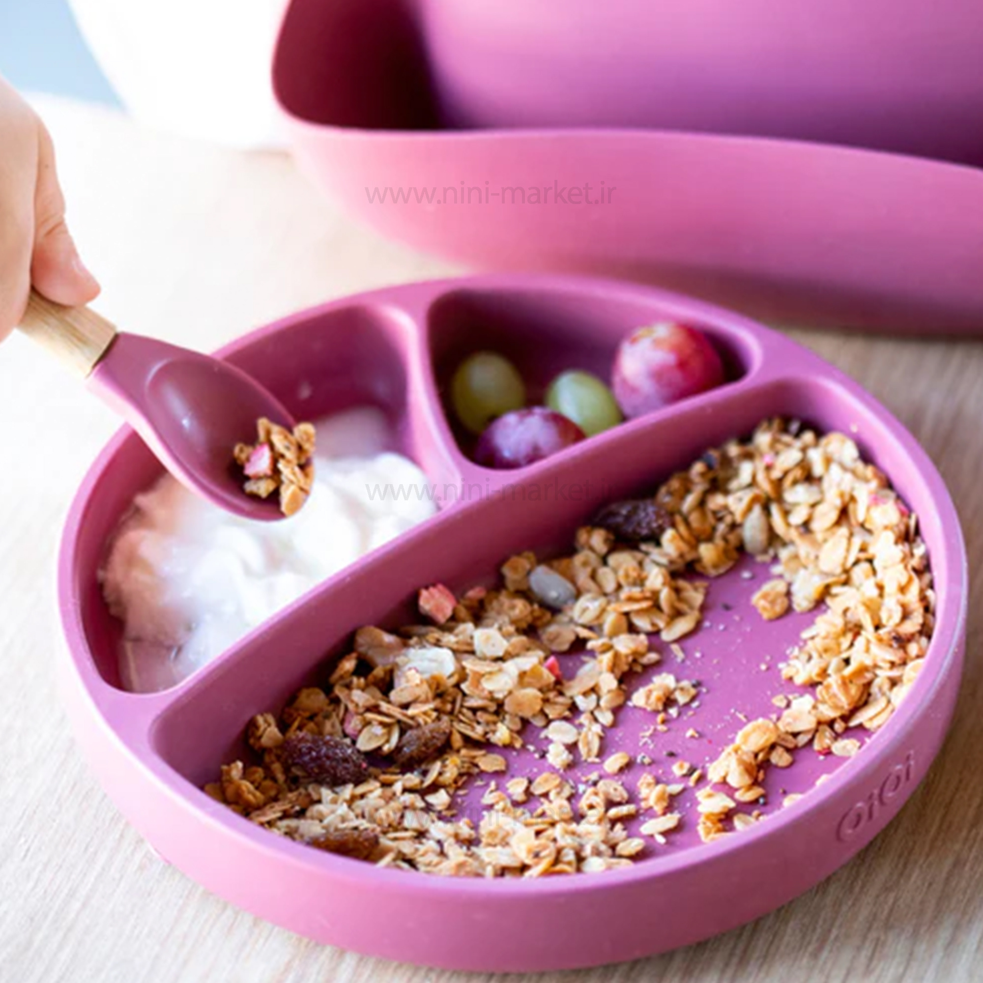 1. بشقاب ساکشن دار. این بشقاب دارای 3 بخش مجزاست که مانع از قاطی شدن غذا میشود. زیر این بشقاب یک لایه دارای مکش دارد که به میز میچسبد و کودک نمیتواند آنرا به راحتی به زمین بیاندازد. جنس این بشقاب در نرم بودن مستحکم است و میتوان غذاهای مایع را هم در آن سرو کرد.