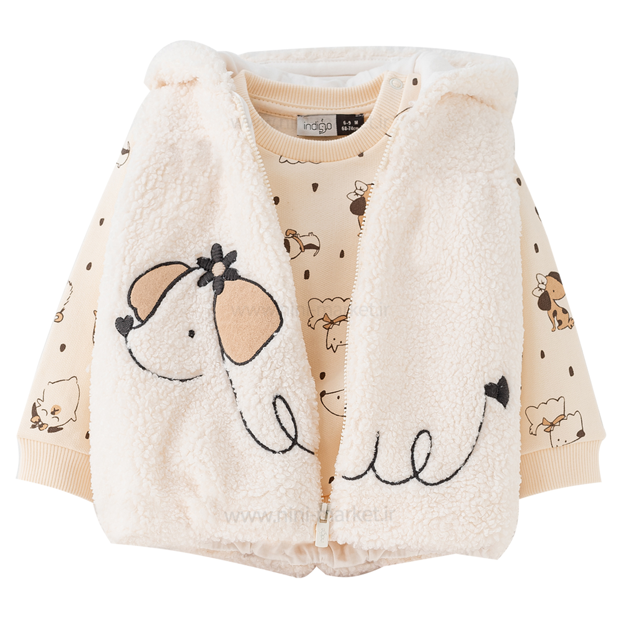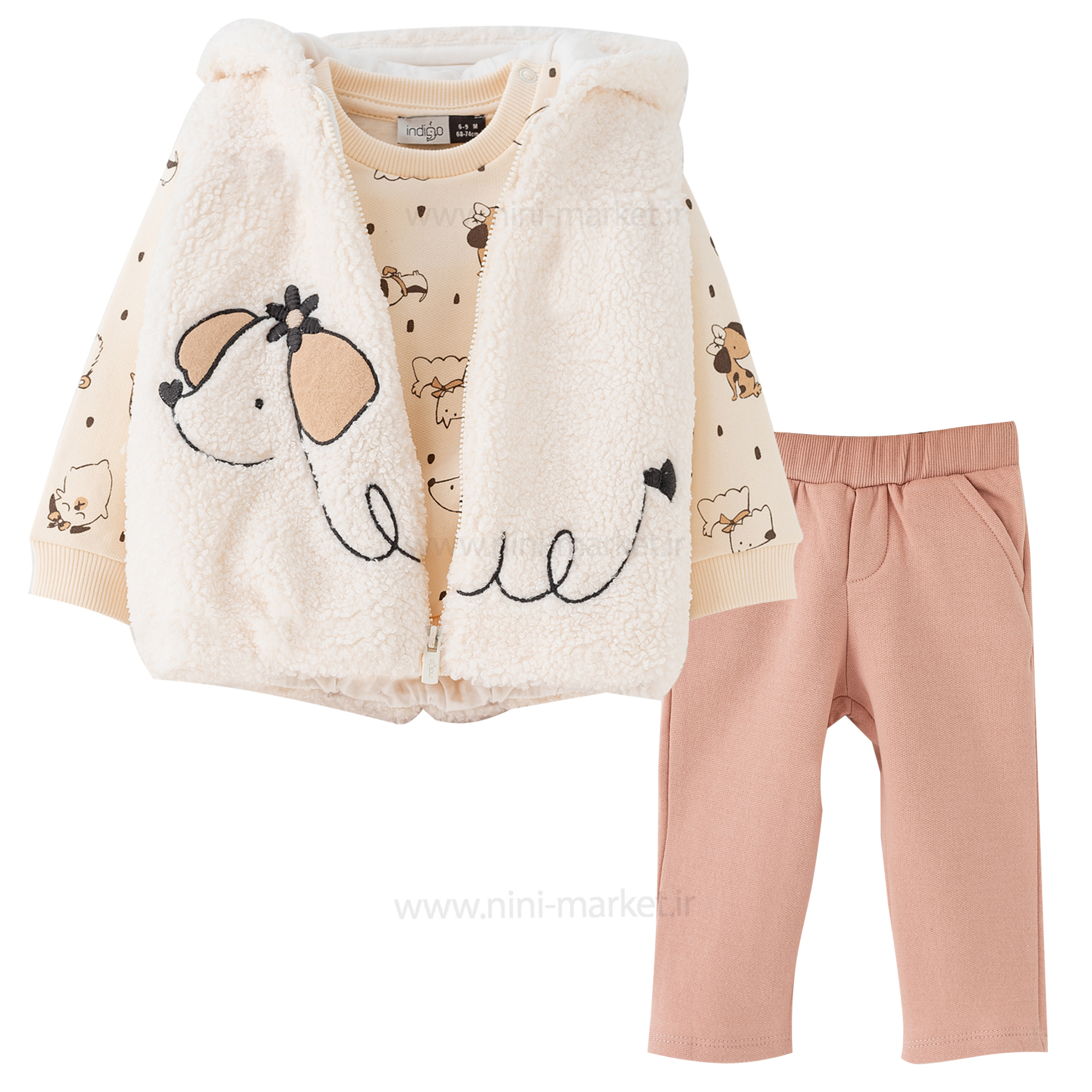 سه تکه دخترانه طرح تدی رنگ کرمی ایندیگو Indigo ، بسیار گرم و مناسب هوای سرد. این سه تکه دارای ژیله و دروس و شلوار می باشد که بلوز شلوار در مچ و پایین لباس دارای کش باف می باشد که از ورود هوای سرد به داخل آن جلوگیری میکند. ژیله سه تکه طرح تدی باعث گرم نگه داشتن نوزاد شما میشود و گزینه مناسبی برای روزهای سرد سال می باشد.