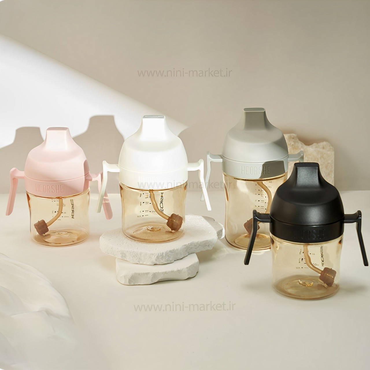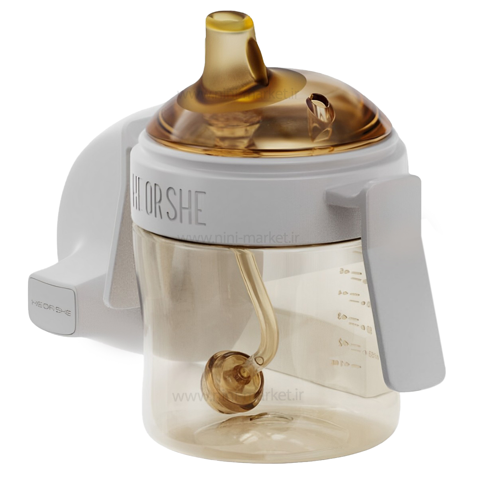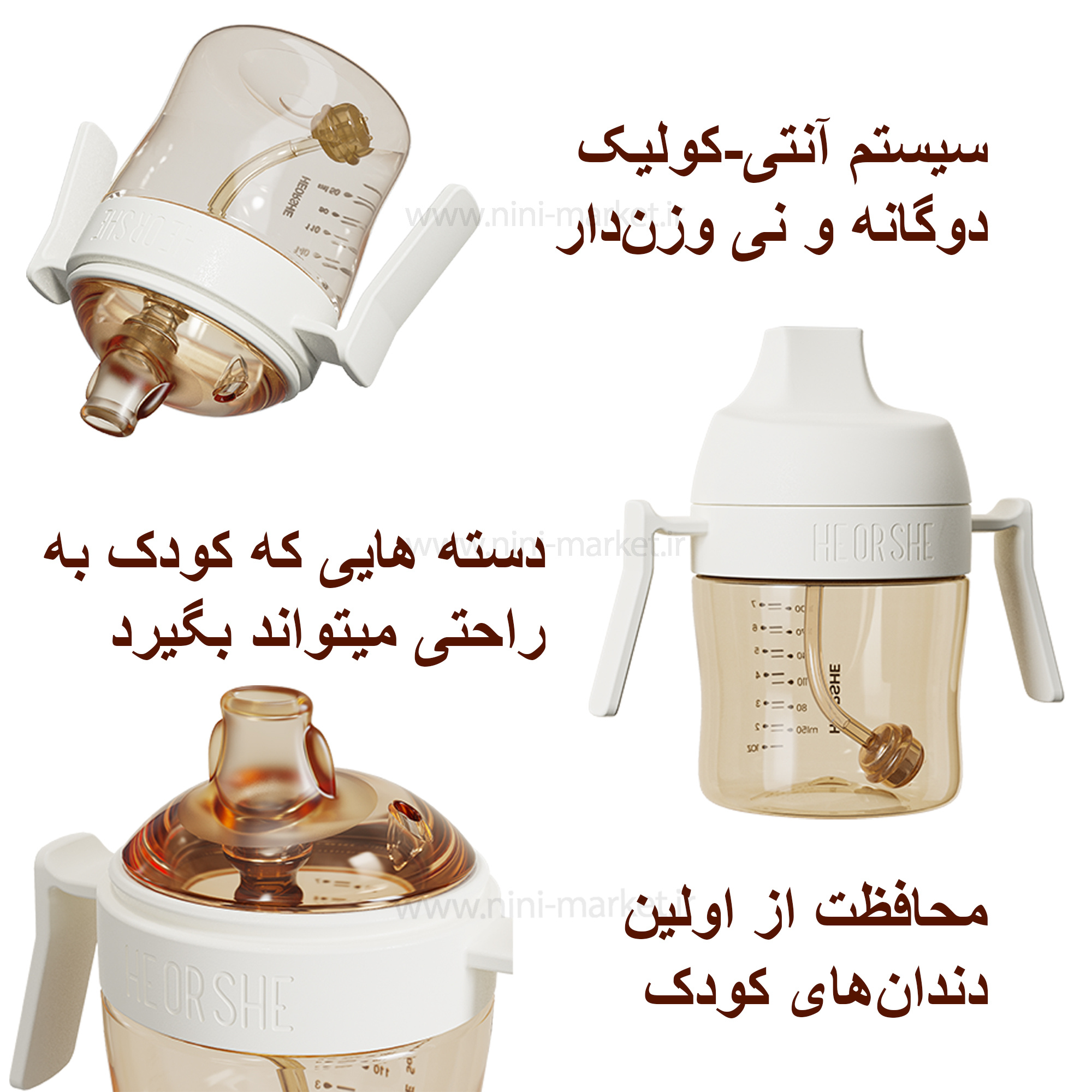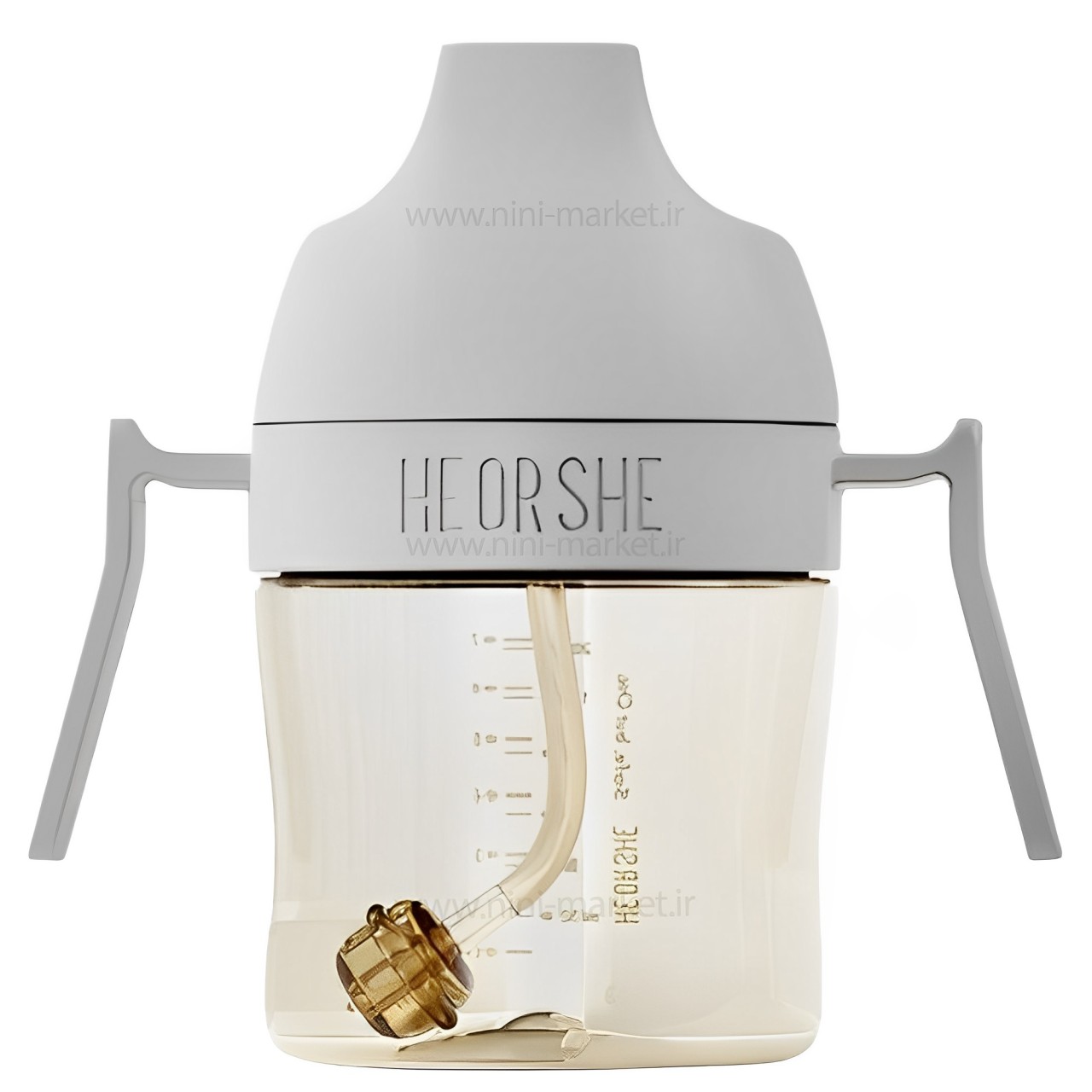 لیوان آبخوری 210 میل رنگ طوسی هی‌اورشی HeOrShe، یک لیوان مناسب برای سنین 6 ماه به بالا است. این لیوان با طراحی ارگونومیکی که دارد، باعث می‌شود کودکان، با دست‌های کوچک خود بتوانند به‌راحتی آن را در دست بگیرند و محتویات آن را نوش جان کنند. لیوان‌های آموزشی ضد چکه یک از بهترین گزینه برای تغییر از شیشه شیر به لیوان است. همین‌طور وزن سبک آنها یکی دیگر از ویژگی‌های مثبت این لیوان است؛ به این دلیل که کودک می‌تواند مدت‌زمان بیشتری لیوان را در دست بگیرد. طراحی سری لیوان های +6 ماه هی‌اور شی به گونه ایست که فشار مکیدن رو روی تمام دندان ها و دهان تقسیم میکند و باعث میشد که به دندان‌های تازه درآمده کودک فشار بدی وارد نشود و به رشد طبیعی آنها کمک میکند. در جعبه این محصول یک سوزن پلاستیکی و یک نی شور قرار دارد. از سوزن میتوانید برای تنظیم جریان سری نی استفاده کنید و متناسب با نیاز کودکتان آن را بازتر کنید. لیوان‌های آبخوری هی‌اورشی دارای نی وزن دارهستند که باعث میشود محتویات لیوان راحت تر بالا بیایند. از نی شور موجود در جعبه هم میتوانید برای تمیز کردن نی استفاده کنید.