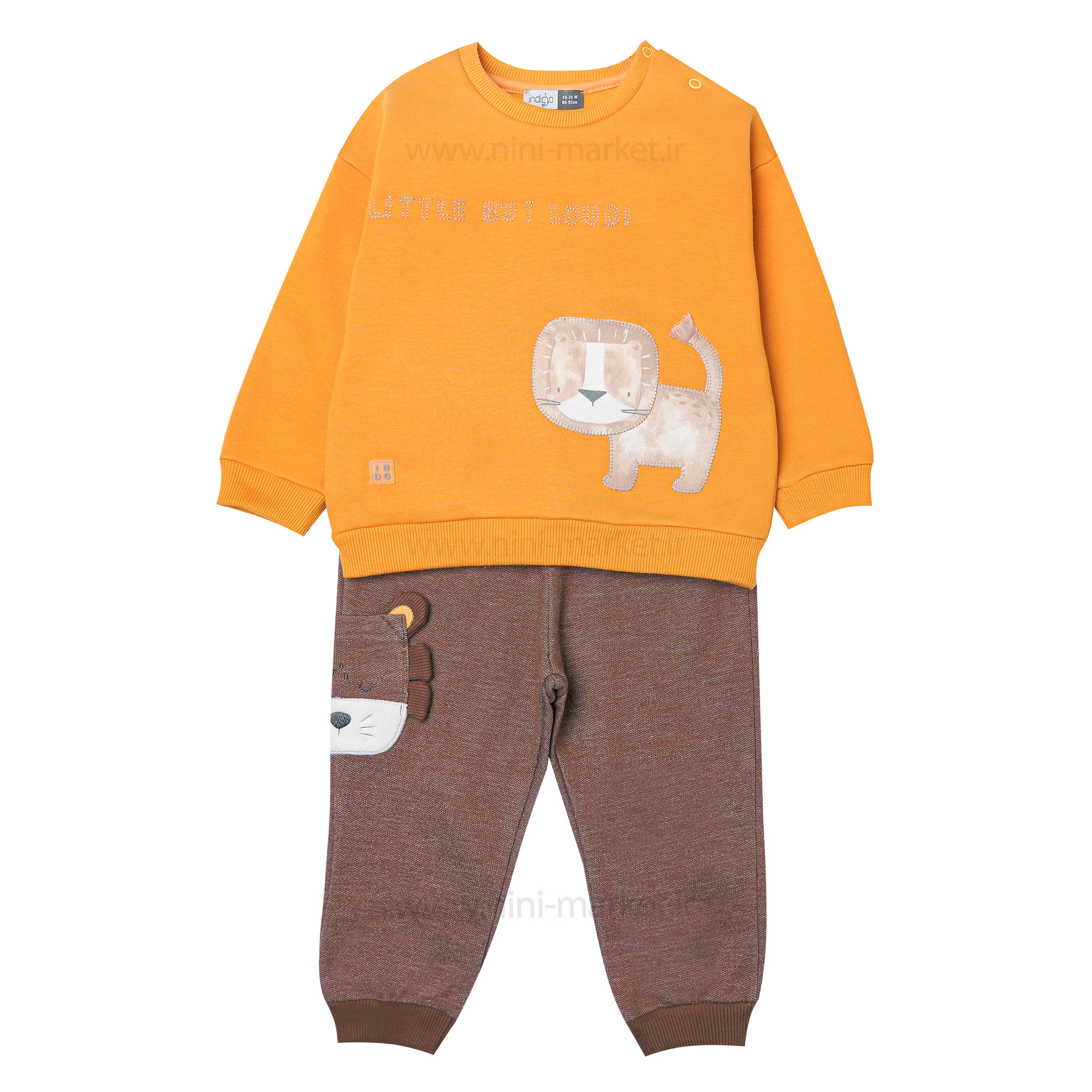 بلوز شلوار پسرانه طرح شیر رنگ زرد ایندیگو Indigo یک ست مناسب برای فصول پاییز و زمستان است. جنس این ست نخ پنبه است. نرم و لطیف بودن این ست مانع از ایجاد حساسیت روی پوست کودکان میشود. وجود کشبافت در مچ لباس و شلوار از ورود هوای سرد جلوگیری میکند و ست را برای فصل سرما مناسب میکند و مانع از سرما خوردن کودک میشود.