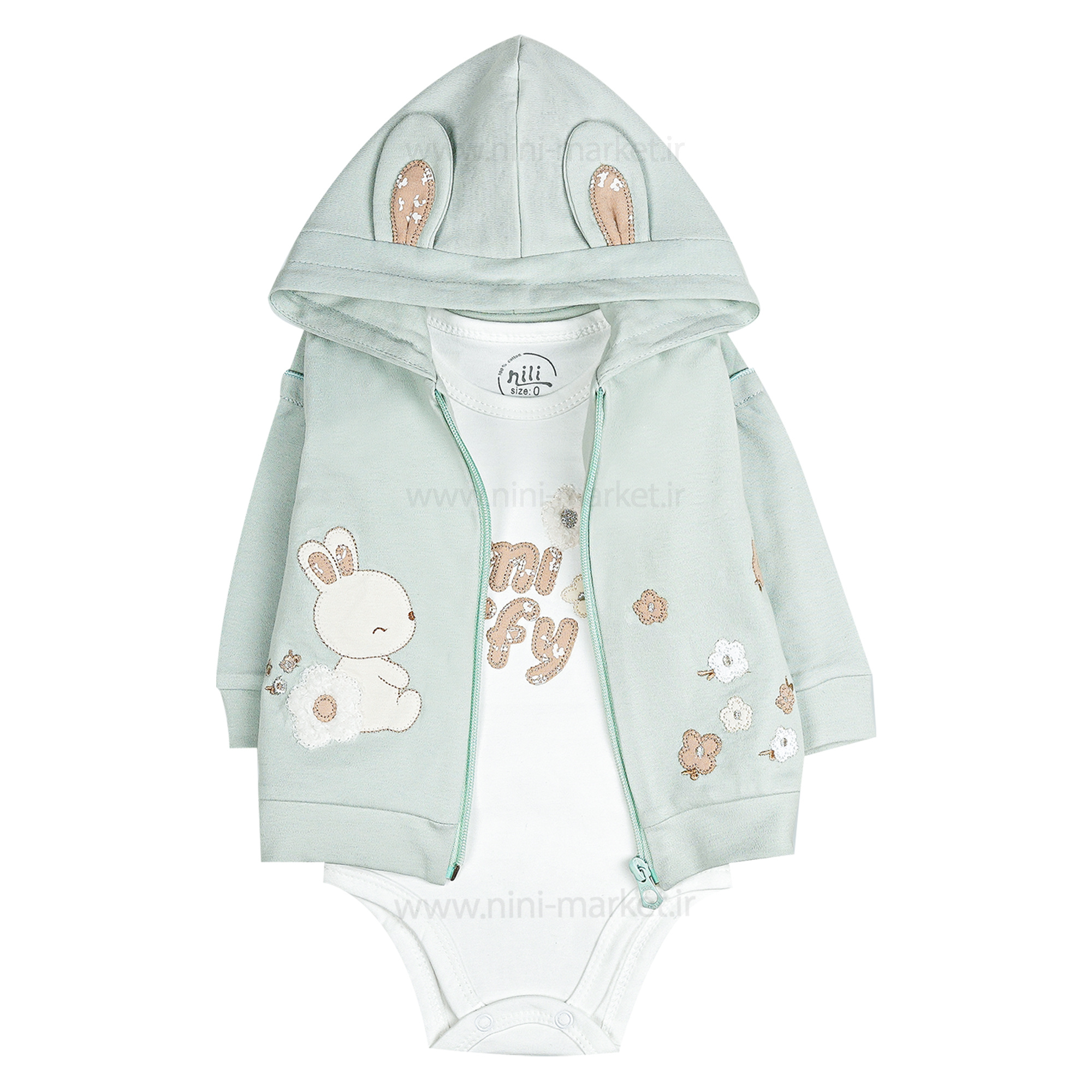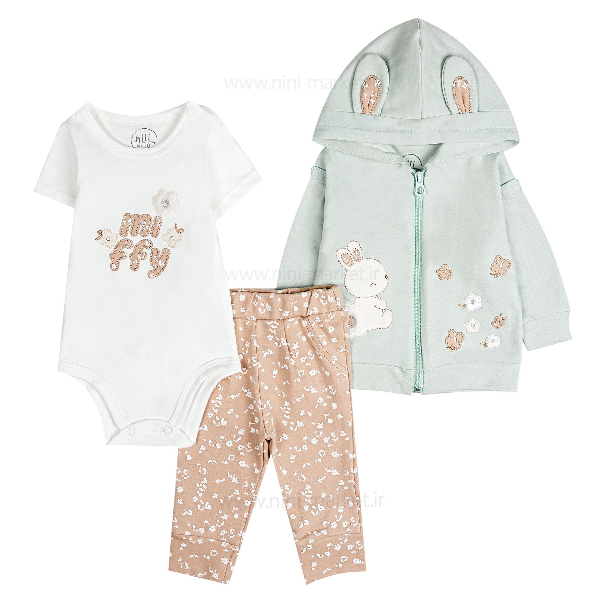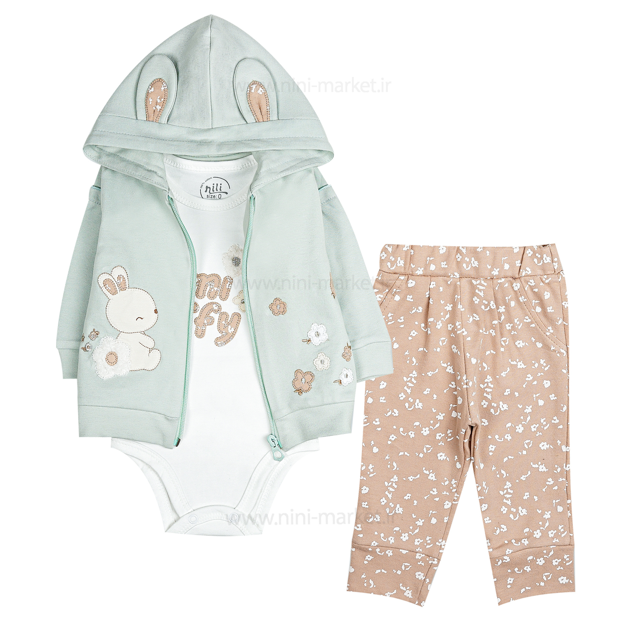 سه تیکه دخترانه طرح گل و خرگوش رنگ سبز نیلی nili