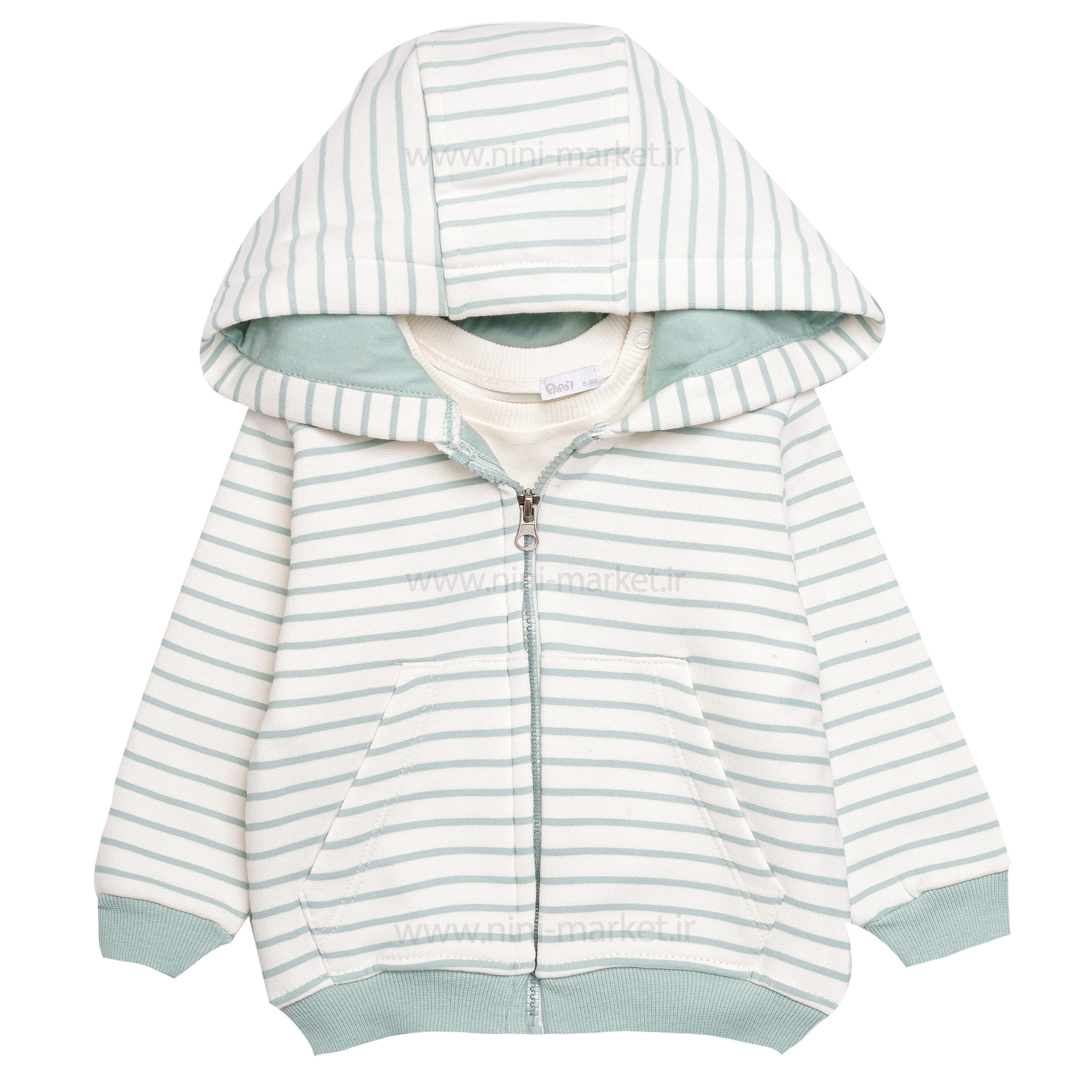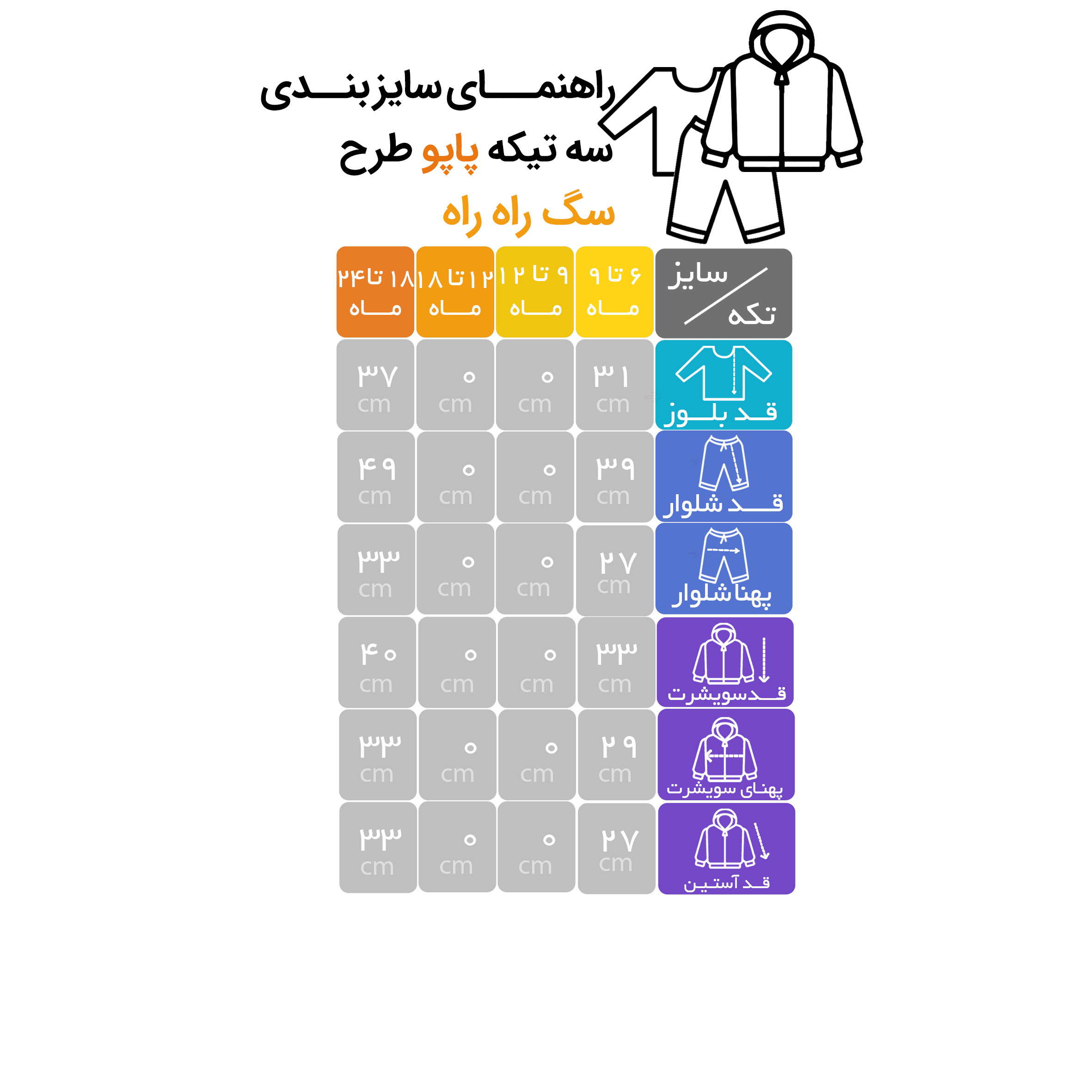 سه تیکه پسرانه طرح سگ راه راه رنگ سبز طوسی پاپو papo ،بسیار گرم و مناسب هوای سرد. این سه تکه دارای سویشرت و دروس و شلوار می باشد که بلوز شلوار در مچ و پایین لباس دارای کش باف می باشد که از ورود هوای سرد به داخل آن جلوگیری میکند. سویشرت سه تکه باعث گرم نگه داشتن نوزاد شما میشود و گزینه مناسبی برای روزهای سرد سال می باشد.