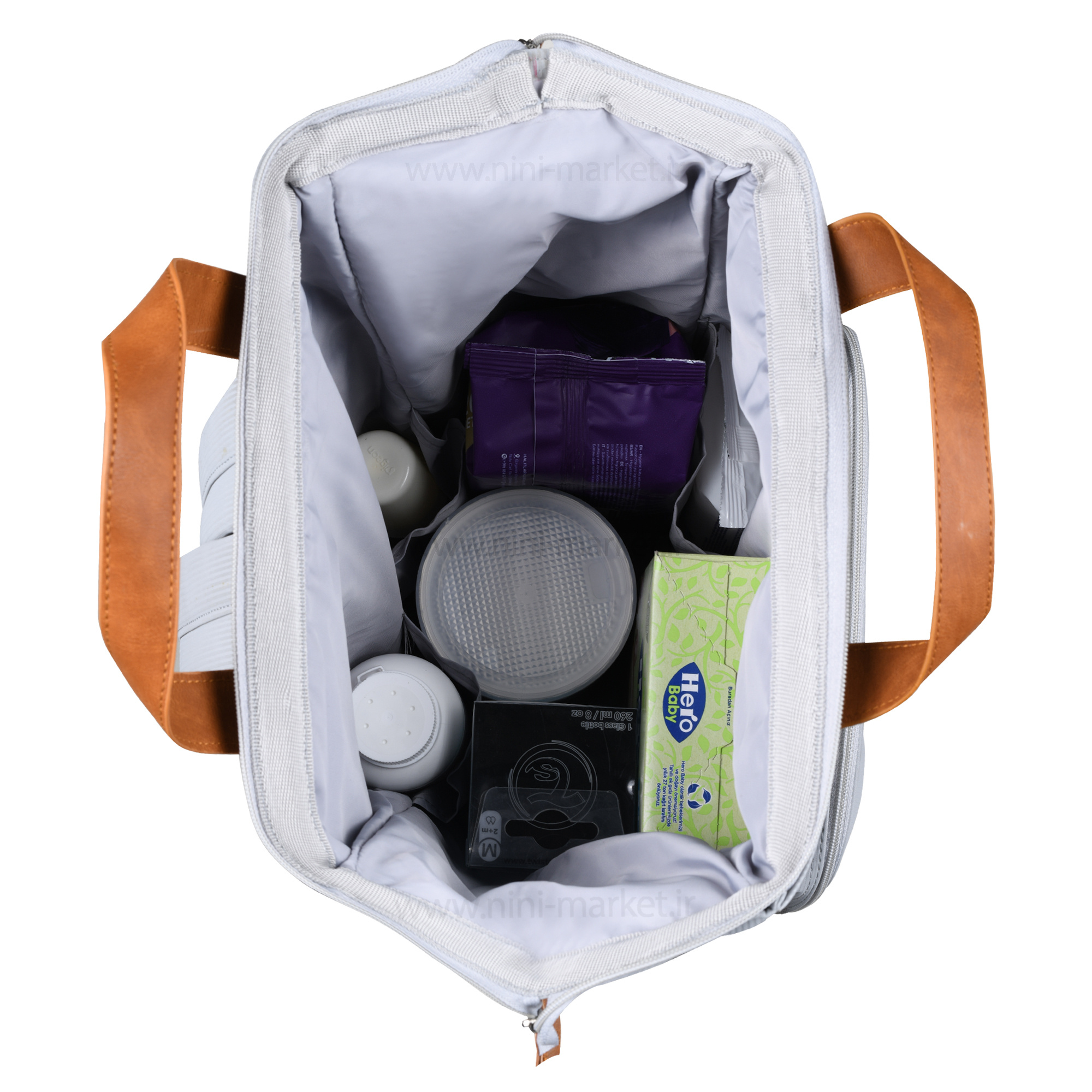 • مزیت : دارای آستر در قسمت داخلی کوله – قابلیت حمل دستی – بند قابل تنظیم کوله پشتی – دارای یک فضای اصلی و چهار جیب بزرگ –دارای جیب های عایق دار–دارای دوبند اتصال کالسکه - دهانه فنری - دسترسی آسان - دارای زیر انداز تعویض پوشک - دارای کیف محافظ پستانک