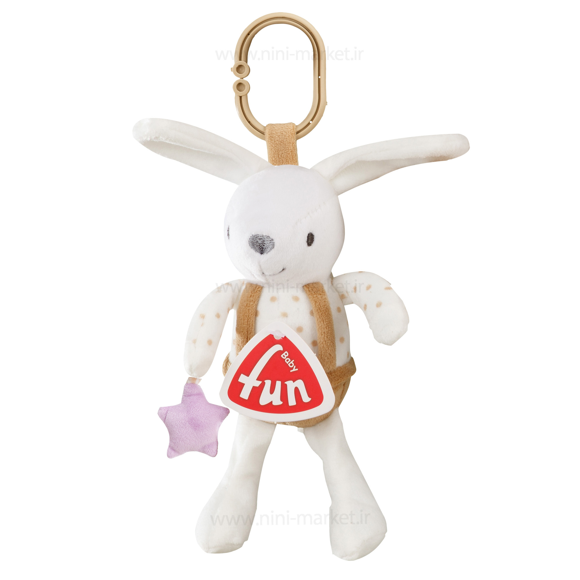 آویز عروسکی کریر و کالسکه طرح خرگوش پسر بیبی فان Baby Fun در رنگ های جذاب و متنوع مناسب برای نوزاد بالای سه ماه تولید شده است.خیلی از بچه ها در زمان نشستن در کریر و کالسکه بی قراری می کنند. با استفاده از اسباب بازی های سرگرم کننده می توانید نوزاد را در این وسایل بنشانید و کم کم او را به نشستن در لوازم حمل و گردش عادت بدهید.انواع آویز کالسکه و کریر به این منظور تولید شده اند. آویز عروسکی جغجغه ای کریر و کالسکه طرح خرگوش پسر بیبی فان Baby Fun را می توانید به دسته ی کالسکه، صندلی ماشین و کریر متصل کنید. حلقه ی بالایی این آویز برای این منظور تعبیه شده است.همچنین این عروسک های دوست داشتنی را می توانید به صورت مستقل دست نوزاد بدهید تا بازی کند.هر عروسک دارای دو آویز سیلیکونی دندانگیر است. پارچه های به کار رفته در تولید هر عروسک ضد حساسیت است و کودک می تواند آن ها را به دندان بگیرد.صدا دار بودن این عروسک ها سبب تقویت قوای شنوایی نوزاد می شود.