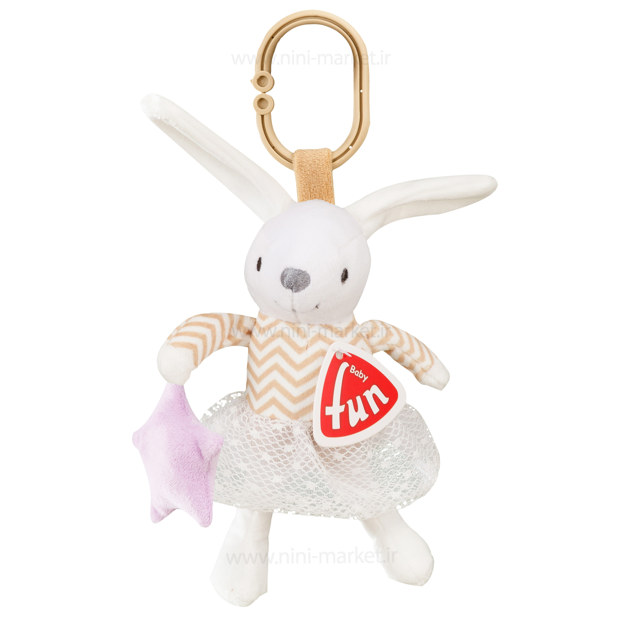 آویز عروسکی کریر و کالسکه طرح خرگوش دختر بیبی فان Baby Fun در رنگ های جذاب و متنوع مناسب برای نوزاد بالای سه ماه تولید شده است.خیلی از بچه ها در زمان نشستن در کریر و کالسکه بی قراری می کنند. با استفاده از اسباب بازی های سرگرم کننده می توانید نوزاد را در این وسایل بنشانید و کم کم او را به نشستن در لوازم حمل و گردش عادت بدهید.انواع آویز کالسکه و کریر به این منظور تولید شده اند. آویز عروسکی کریر و کالسکه طرح خرگوش دختر بیبی فان Baby Fun را می توانید به دسته ی کالسکه، صندلی ماشین و کریر متصل کنید. حلقه ی بالایی این آویز برای این منظور تعبیه شده است.همچنین این عروسک های دوست داشتنی را می توانید به صورت مستقل دست نوزاد بدهید تا بازی کند.