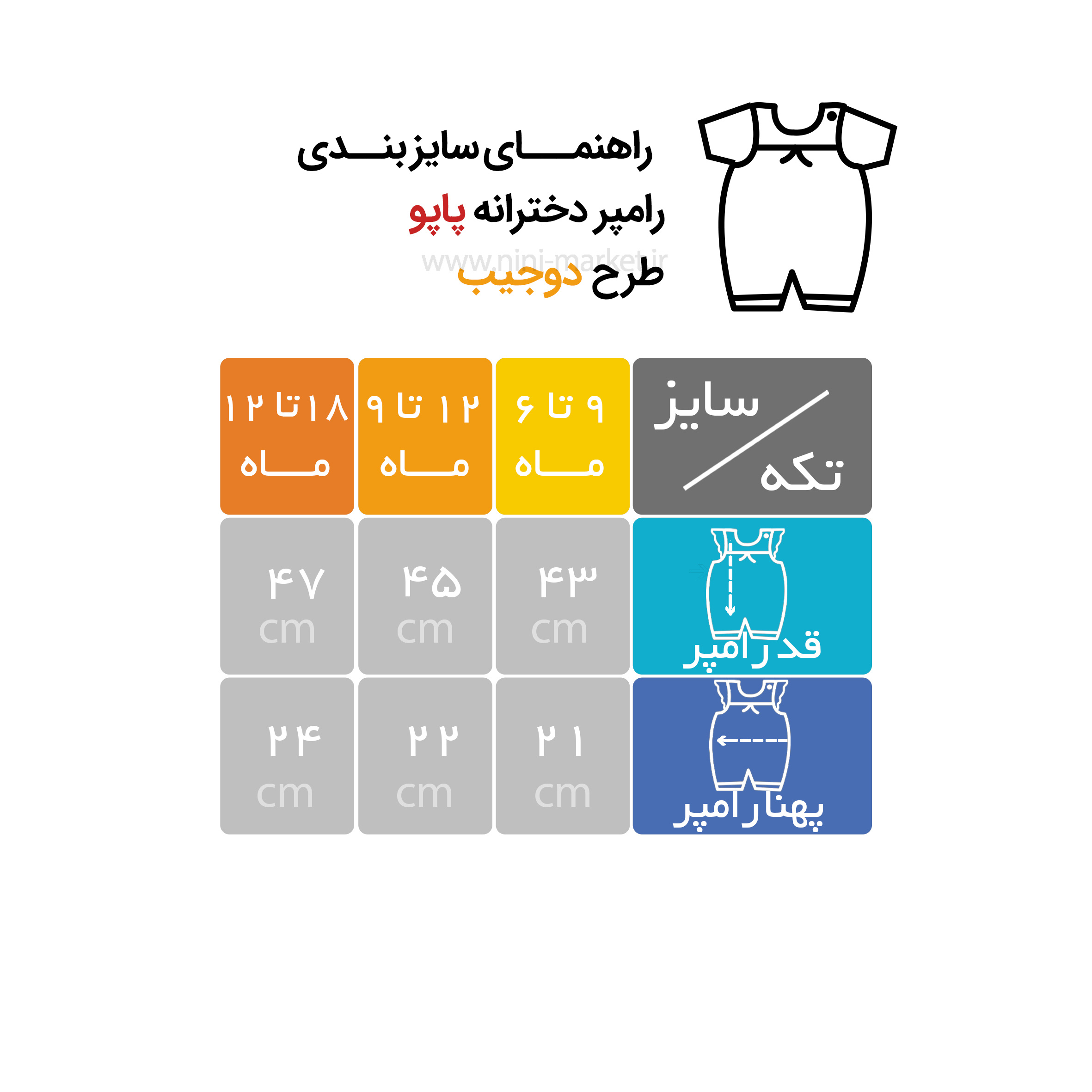 رامپر (Romper) نوعی لباس یکتکه برای نوزادان و نوپایان است که معمولاً از جنس نرم و لطیف تهیه میشود. این لباس یک نوع سرهمی است که ترکیبی از بلوز و شلوارک بهحساب میآید. رامپرهای نوزادی با انواع آستینکوتاه، بلند و تاپ در بازار موجود هستند و تفاوت آنها با دیگر نمونههای سرهمی این است که قسمت پایینتنه آن، کمی پاچه دارد و به شکل شلوارک متصل به بلوز، طراحی شده است. پوشیدن و درآوردن رامپر بسیار آسان است و همین موضوع باعث شده که تعویض پوشک نوزاد با رامپر، به فرایندی سادهتر از باقی لباسهای دوتکه یا سرهمیهای شلوار دار تبدیل شود. رامپر دخترانه طرح دو جیب رنگ سبز پاپو papo از جنس نخ میباشد که محصولی نرم و لطیف مناسب فصل بهار و تابستان میباشد. این محصول تهیه شده از پارچه ضد حساسیت میباشد که کودک در آن احساس راحتی دارد. پشتکار باز بوده و قسمتی از لباس با دو بند بهم متصل می شود و در قسمت کمر در پشت لباس کش کار شده که پوشاندن آن را برای کودک راحت کرده است. این محصول با طراحی زیبای که دارد گزینه مناسبی برای مهمانیها میباشد.