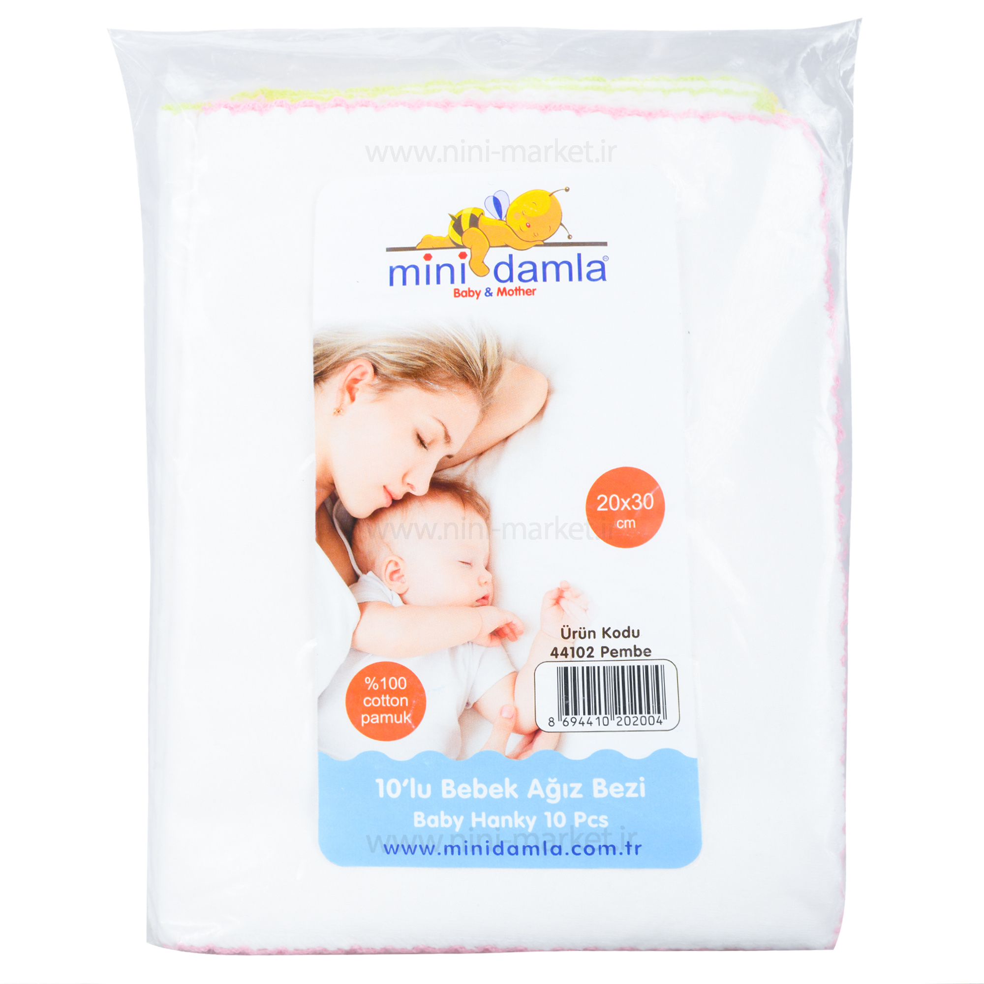 از آن جا که نوزاد پوستی بسیار حساس دارد، نمیتوان از دستمالهای معمولی به دلیل زبر بودن برای پوست لطیف نوزادان استفاده کرد. دستمال نخی ۱۰ عددی رنگ سفید صورتی mini damla با جنسی مناسب برای پوست لطیف و حساس نوزاد تهیه شده است. با دوردوزی در رنگهای مختلف در بستههای ۱۰ عددی تولید شده است. جنس این دستمال ۱۰۰% کتان است. این دستمال در رنگهای مختلف مناسب نوزادان دختر و پسر است. اندازه این دستمال دهان نوزاد دارای ابعاد ۳۰*۲۸ سانتیمتر است.