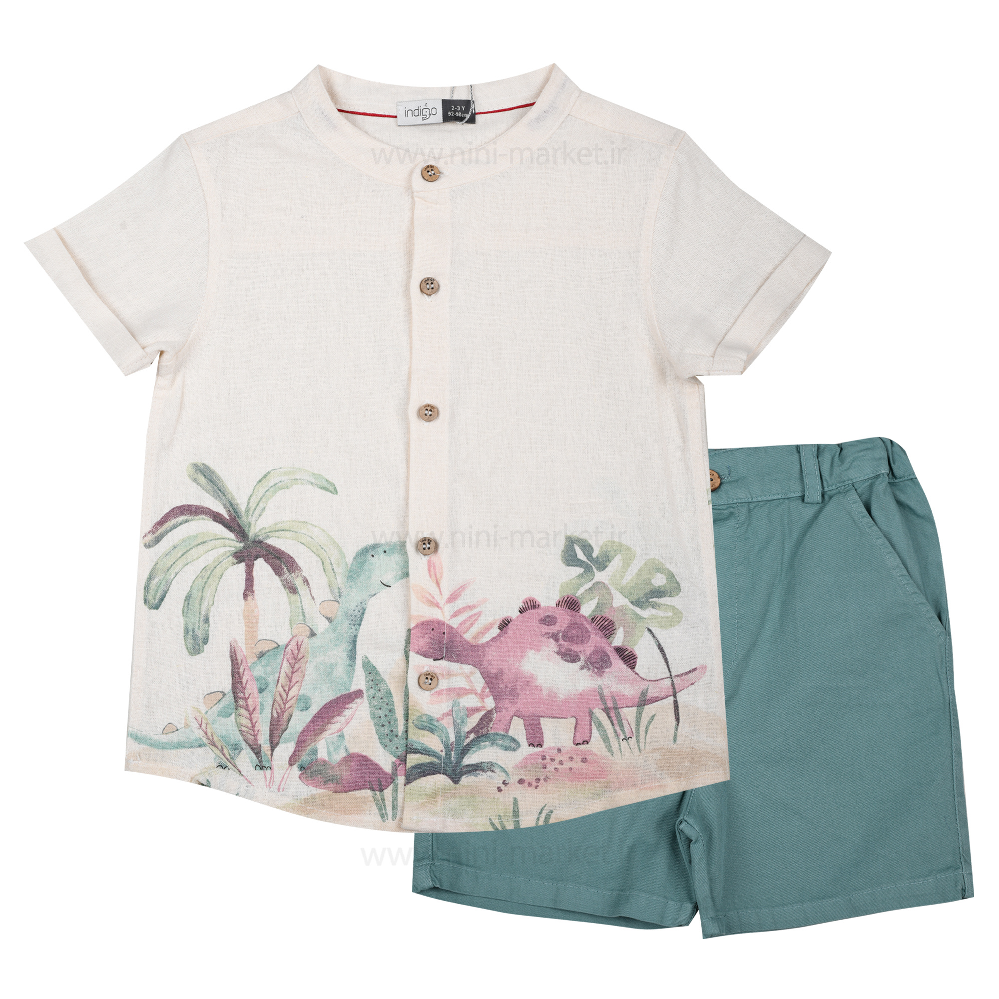 شومیز شورت پسرانه مدل دانی طرح دایناسور رنگ سبز ایندیگو indigo از الیاف بسیار نرم و لطیف است که کودک در آن احساس راحتی می‌کند.  و مادران با خیال راحت می‌توانند این ست را برای فرزند خود تهیه کنند. ست دوتکه ایندیگو شامل شورت - تیشرت می‌باشد. شورت این ست کتان به رنگ آبی می‌باشد و در قسمت کمر شلوار به‌صورت کمربندی کار شده است که می‌توان آن را با ساسبند یا کمربند رنگی ست کرد و به‌راحتی تن کودک کرد که هیچ فشاری به کمر و شکم آن وارد نمی‌شود. در قسمت جلوی شومیز دکمه تعبیه شده و با طراحی زیبا و پترن جالب بر روی لباس زیبای آن را دوچندان کرده است.