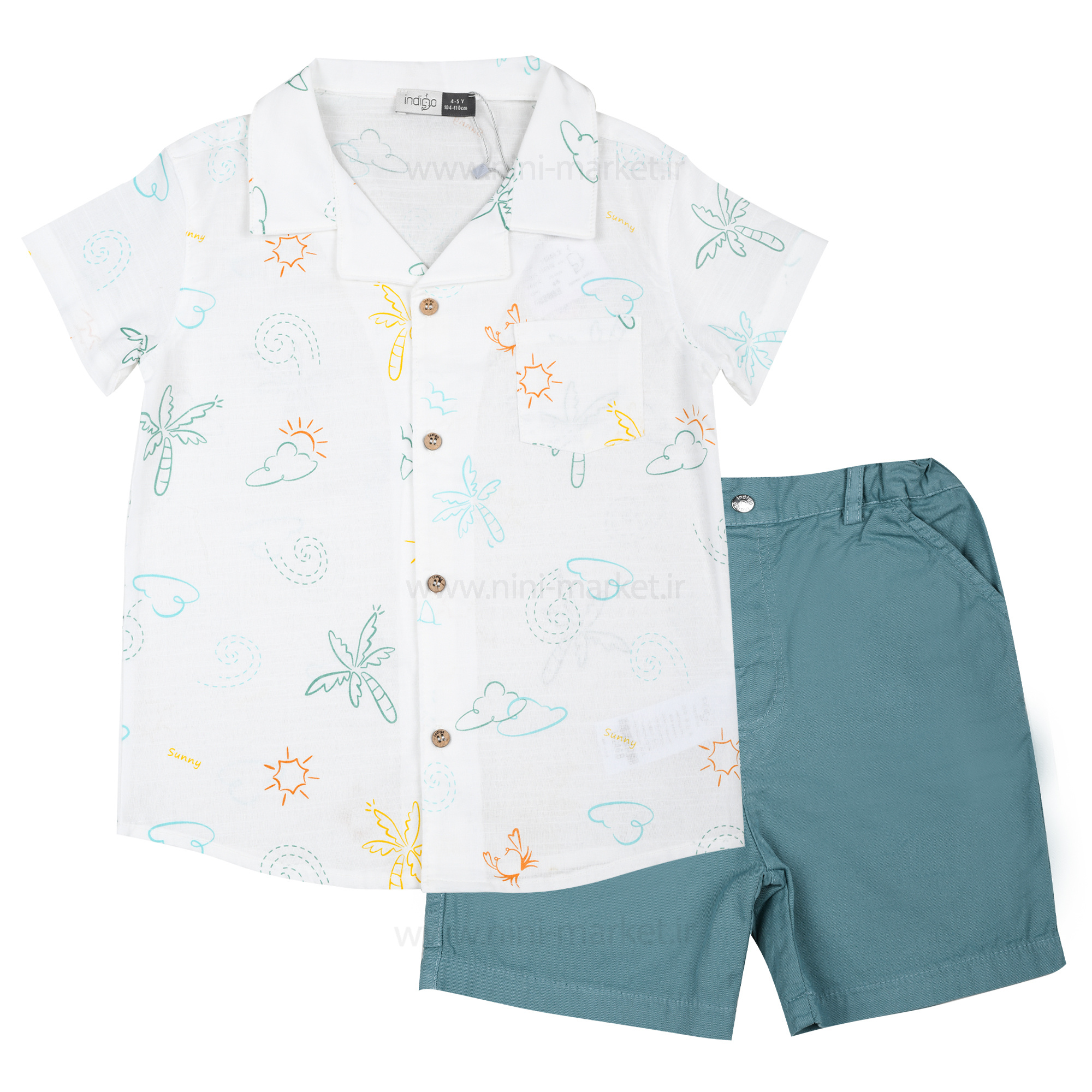 شومیز شورت پسرانه مدل هاوایی طرح ابر رنگ سفید ایندیگو indigo از الیاف بسیار نرم و لطیف است و کودک در آن احساس راحتی میکند. و مادران با خیال راحت میتوانند این ست را برای فرزند خود تهیه کنند. ست دوتکه ایندیگو شامل شورت - تیشرت میباشد. شورت این ست کتان به رنگ آبی میباشد و در قسمت کمر شلوار بهصورت کمربندی کار شده است که میتوان آن را با ساسبند یا کمربند رنگی ست کرد و بهراحتی تن کودک کرد که هیچ فشاری به کمر و شکم آن وارد نمیشود. در قسمت جلوی شومیز دکمه تعبیه شده و با طراحی زیبا و پترن جالب بر روی لباس زیبای آن را دوچندان کرده است.