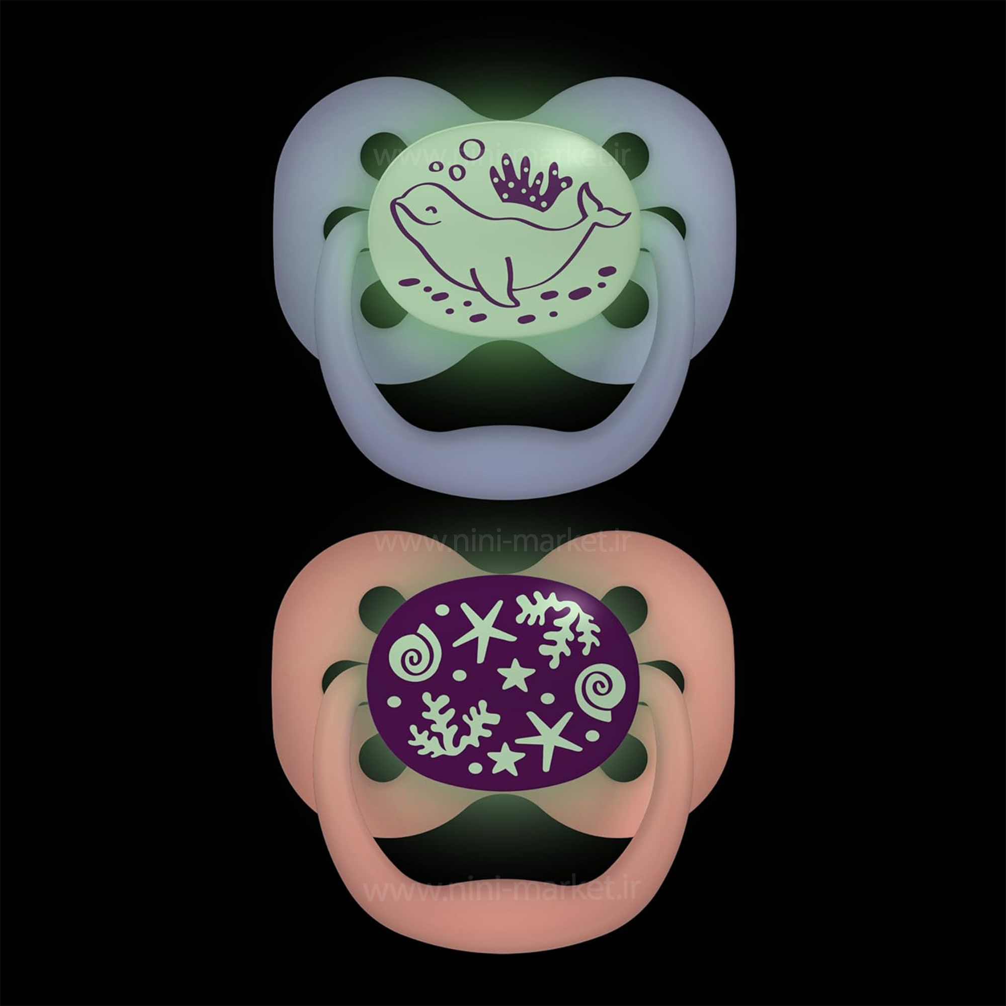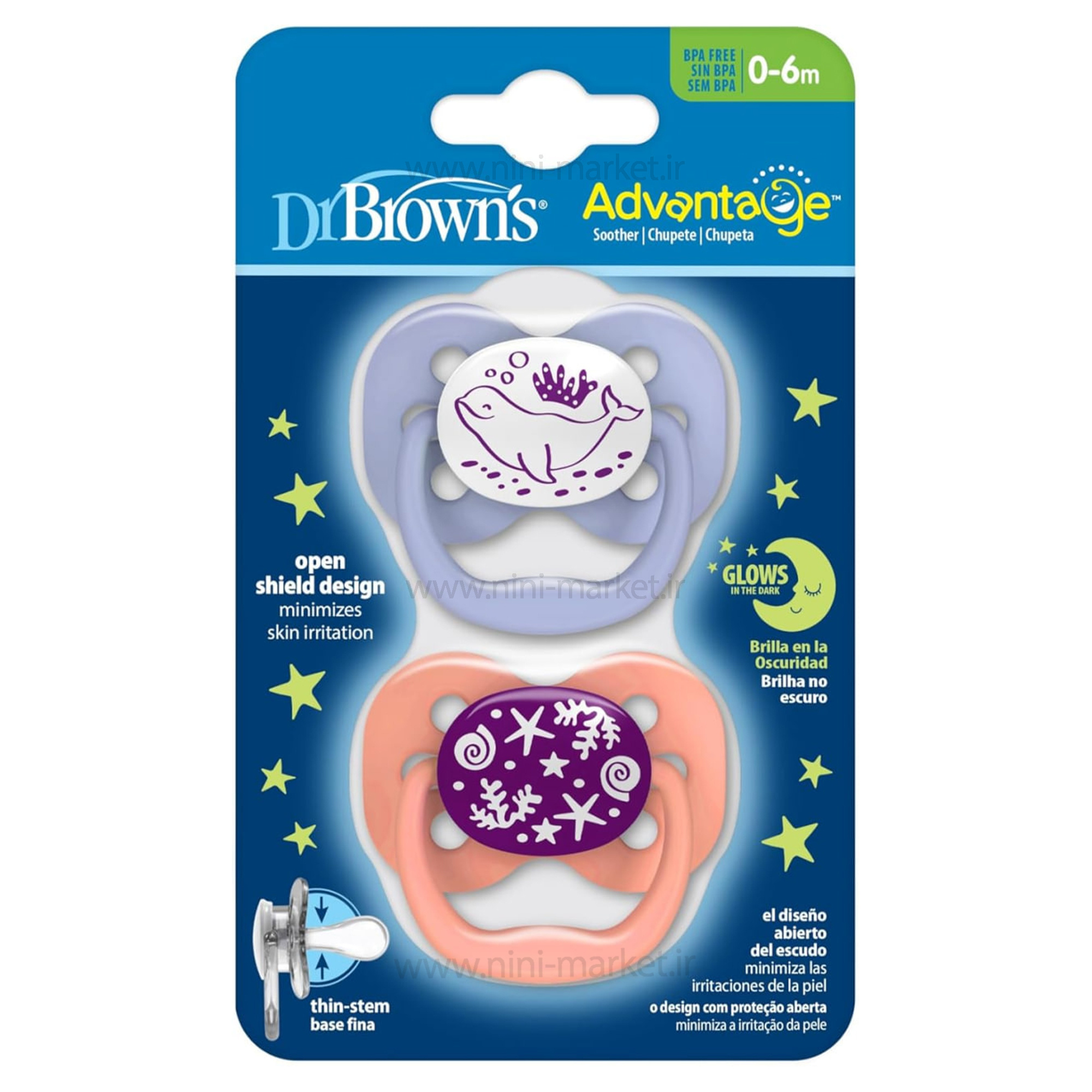 پستانک دو عددی درب دار بادامی نایت 0-6 ماه طرح دار دکتر براون Dr.brown، محصولی با طراحی اختصاصی توسط دندانپزشکان اطفال است که به منظور محافظت از لثه‌های حساس نوزاد تولید شده است. سری این پستانک‌ها از جنس سیلیکون با مدل بادامی بوده که به راحتی در دهان نوزاد قرار می‌گیرد و مکیدن آن بدون اعمال فشار زیاد انجام می‌شود، زیرا دارای خاصیت ساکشن هوا است. وجود سوراخ‌هایی روی بدنه پستانک مانع از تعریق پوست نوزاد شده و از ایجاد حساسیت جلوگیری می‌کند. این محصول دارای درب پوش جداگانه برای هر پستانک است که حمل آن را بهداشتی‌تر و آسان‌تر می‌سازد. دسته‌ی طراحی شده نیز باعث می‌شود نوزاد بتواند به راحتی پستانک را در دست بگیرد. ویژگی شبرنگ بودن این پستانک باعث می‌شود در تاریکی شب به‌راحتی دیده شود. محصول فاقد هرگونه ماده مضر مانند بیسفنول آ (BPA)، بدون بو و بدون طعم بوده و امکان شستشو در طبقه بالای ماشین ظرفشویی و همچنین قرار دادن در دستگاه استریل را دارد. شما می توانید این محصول جذاب را از سیسمونی نی نی مارکت تهیه کنید.