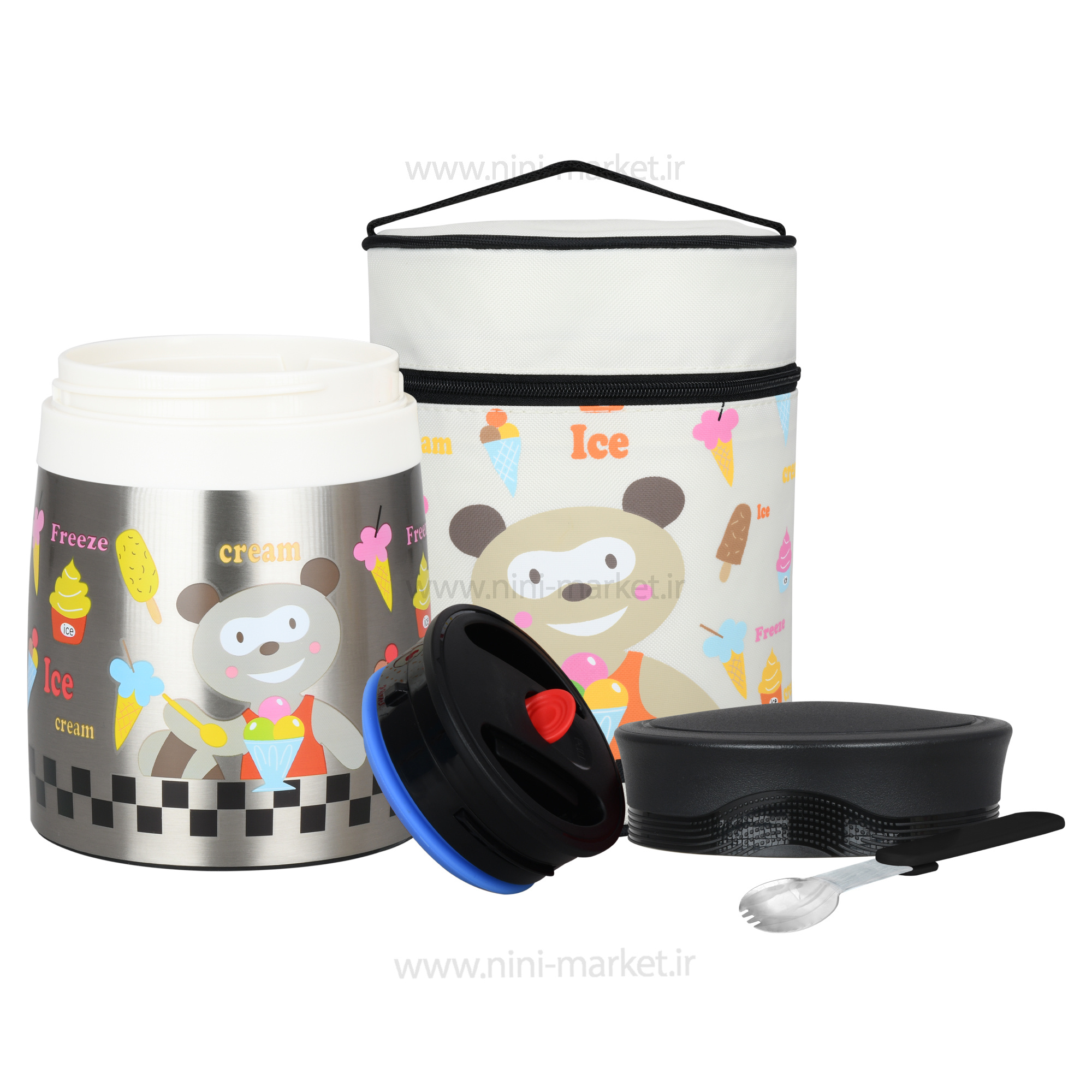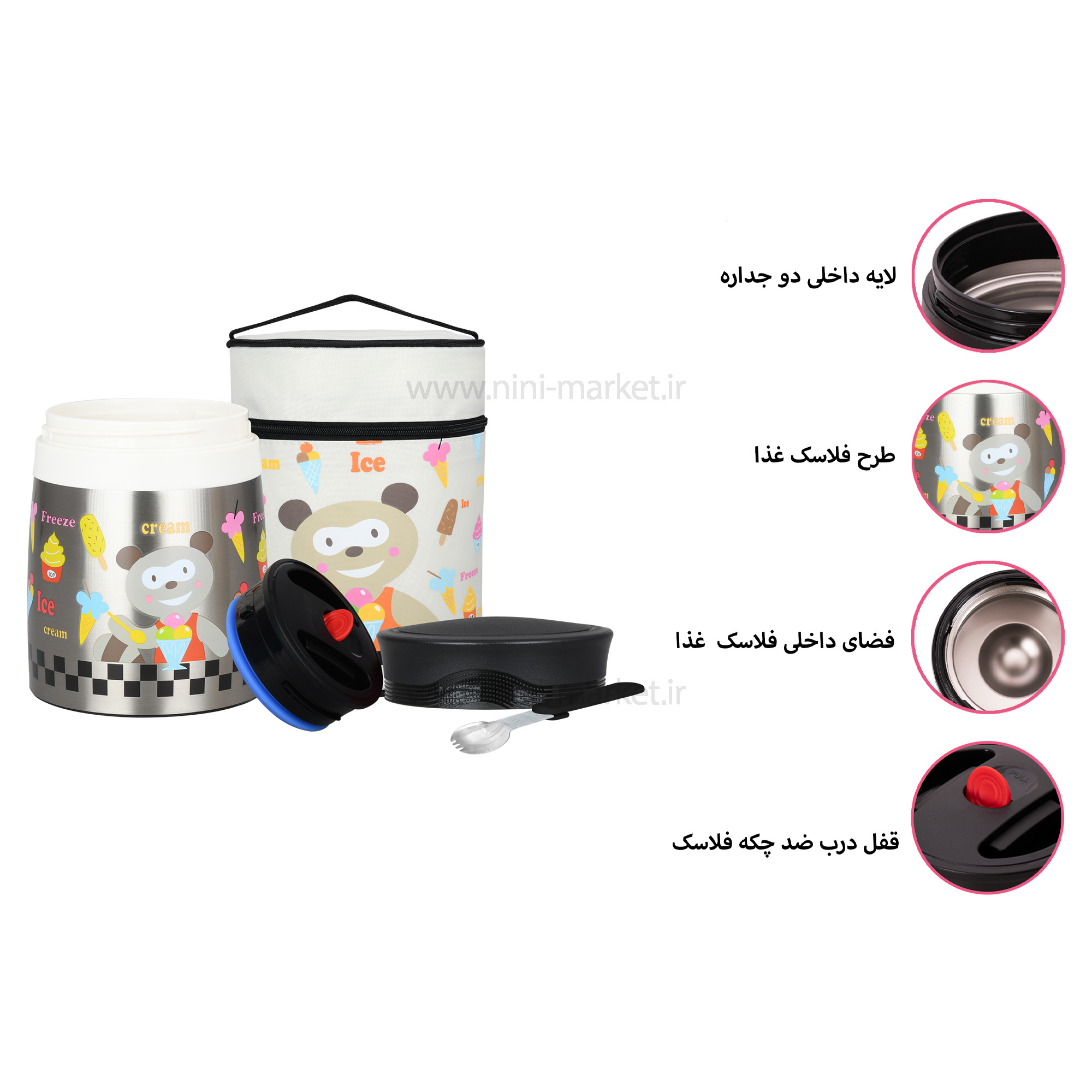 فلاسک غذا دارای 1 عدد محفظهی نگهداری مواد غذایی است. جنس این ظروف به گونه ای است که گرما و سرمای محتویات داخل خود را تا 6 ساعت نگه می دارد.دارای یک درب دیگر که به توسط یک دکمه کاملا سفت میشود و به هیچ عنوان نشتی و پس نمی دهد. این محصول را میتوان به راحتی حمل کرد. این فلاسک دارای طراحی فانتزی و زیبایی که دارد کودک را به خود جذب میکند، طرح روی آن خرس در زمینه کرم است که زیبایی آن را چندین برابر کرده است. با توجه به جنس فلاسک، طعم غذا داخل آن تغییر نمی کند و دارای قاشق با دسته تاشو است که قاشق در درب آن فیکس می شود. دهانه پهن این محصول استفاده از آن و شستشو را راحت تر میکند. شما می توانید این محصول را از سیسمونی نی نی مارکت تهیه کنید.