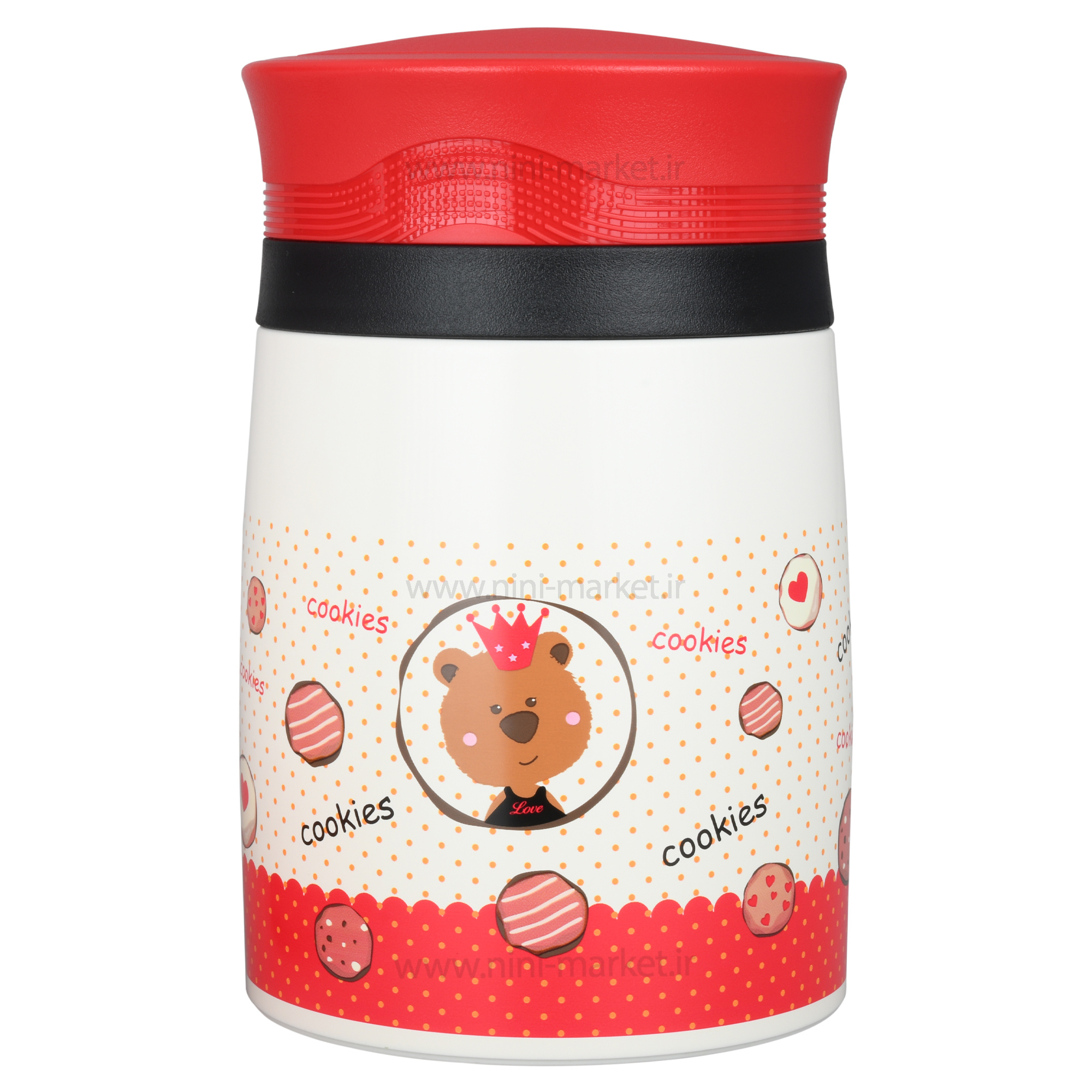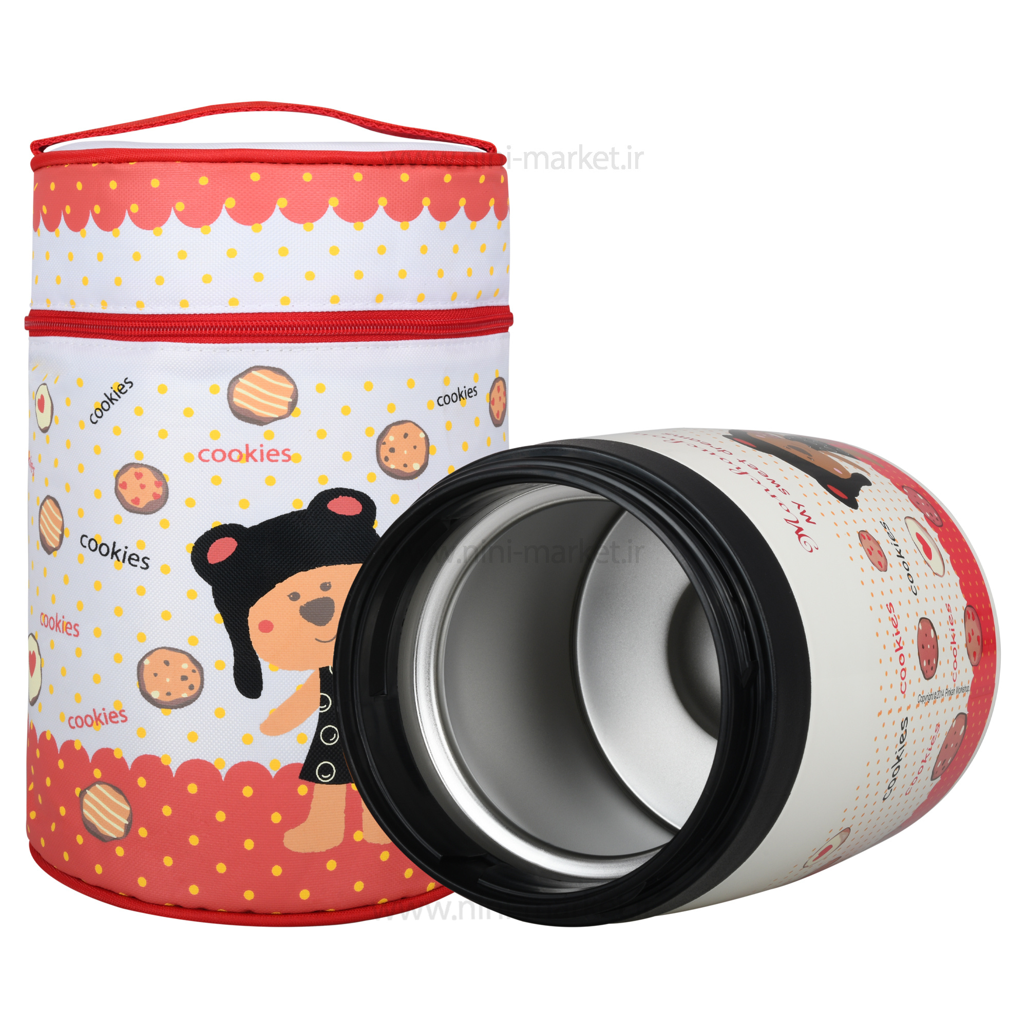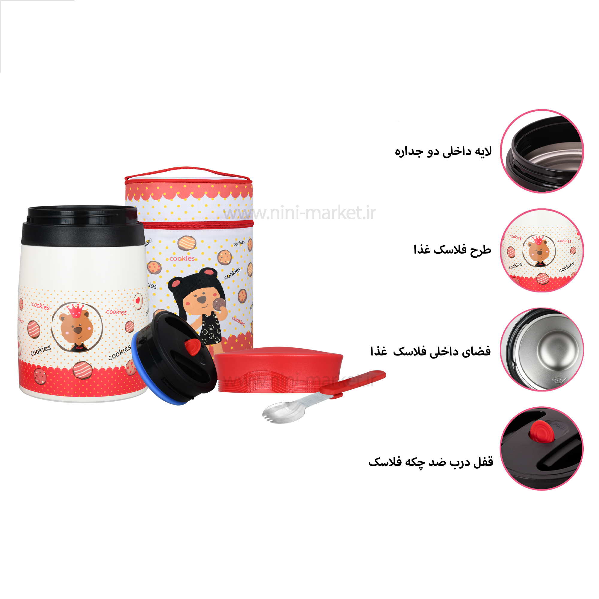 فلاسک غذا دارای 1 عدد محفظهی نگهداری مواد غذایی است. جنس این ظروف به گونه ای است که گرما و سرمای محتویات داخل خود را تا 6 ساعت نگه می دارد.دارای یک درب دیگر که به توسط یک دکمه کاملا سفت میشود و به هیچ عنوان نشتی و پس نمی دهد. این محصول را میتوان به راحتی حمل کرد. این فلاسک دارای طراحی فانتزی و زیبایی که دارد کودک را به خود جذب میکند، طرح روی آن خرس در زمینه کرم است که زیبایی آن را چندین برابر کرده است. با توجه به جنس فلاسک، طعم غذا داخل آن تغییر نمی کند و دارای قاشق با دسته تاشو است که قاشق در درب آن فیکس می شود. دهانه پهن این محصول استفاده از آن و شستشو را راحت تر میکند. شما می توانید این محصول را از سیسمونی نی نی مارکت تهیه کنید.