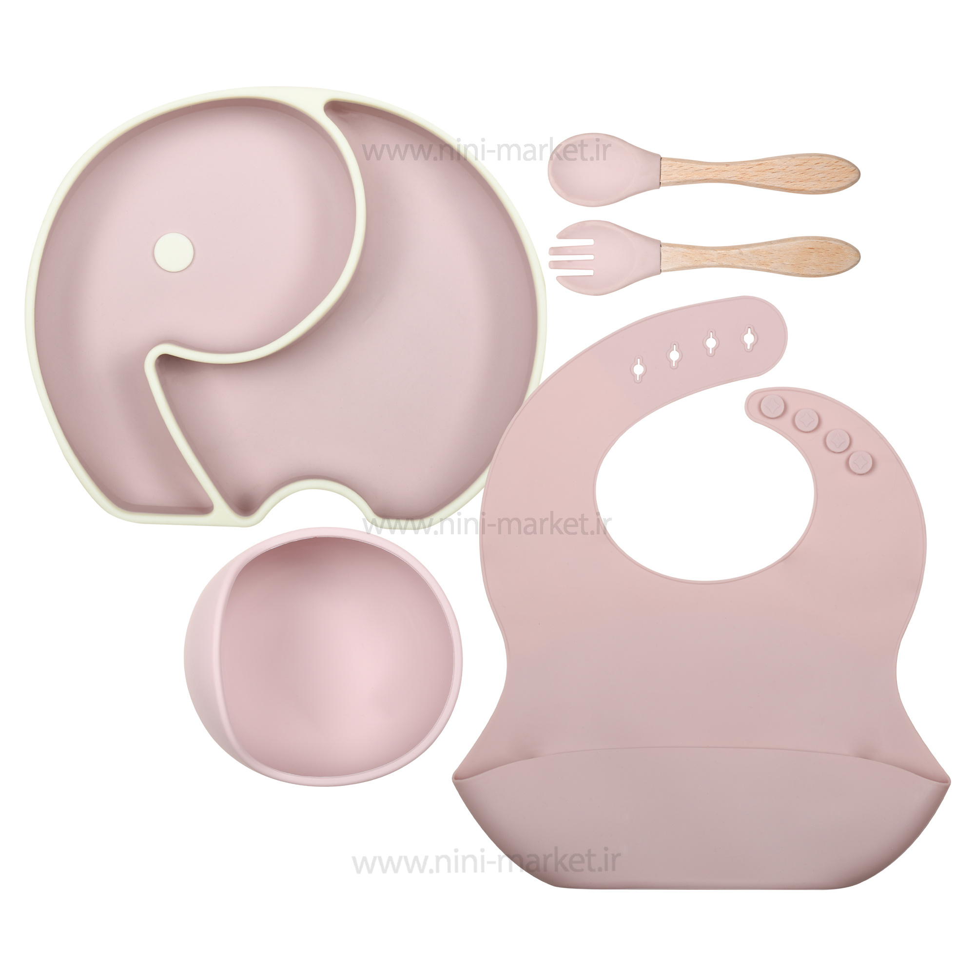 ست ظرف غذای سیلیکونی 5 تیکه طرح فیل رنگ کالباسی baby 4 life، یکی از بهترین ست های ظرف غذا است که یک مجموعه کامل از لوازم غذاخوری کودک است. این ست غذاخوری، شامل: